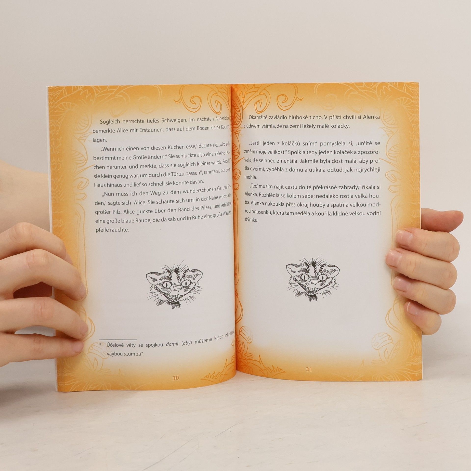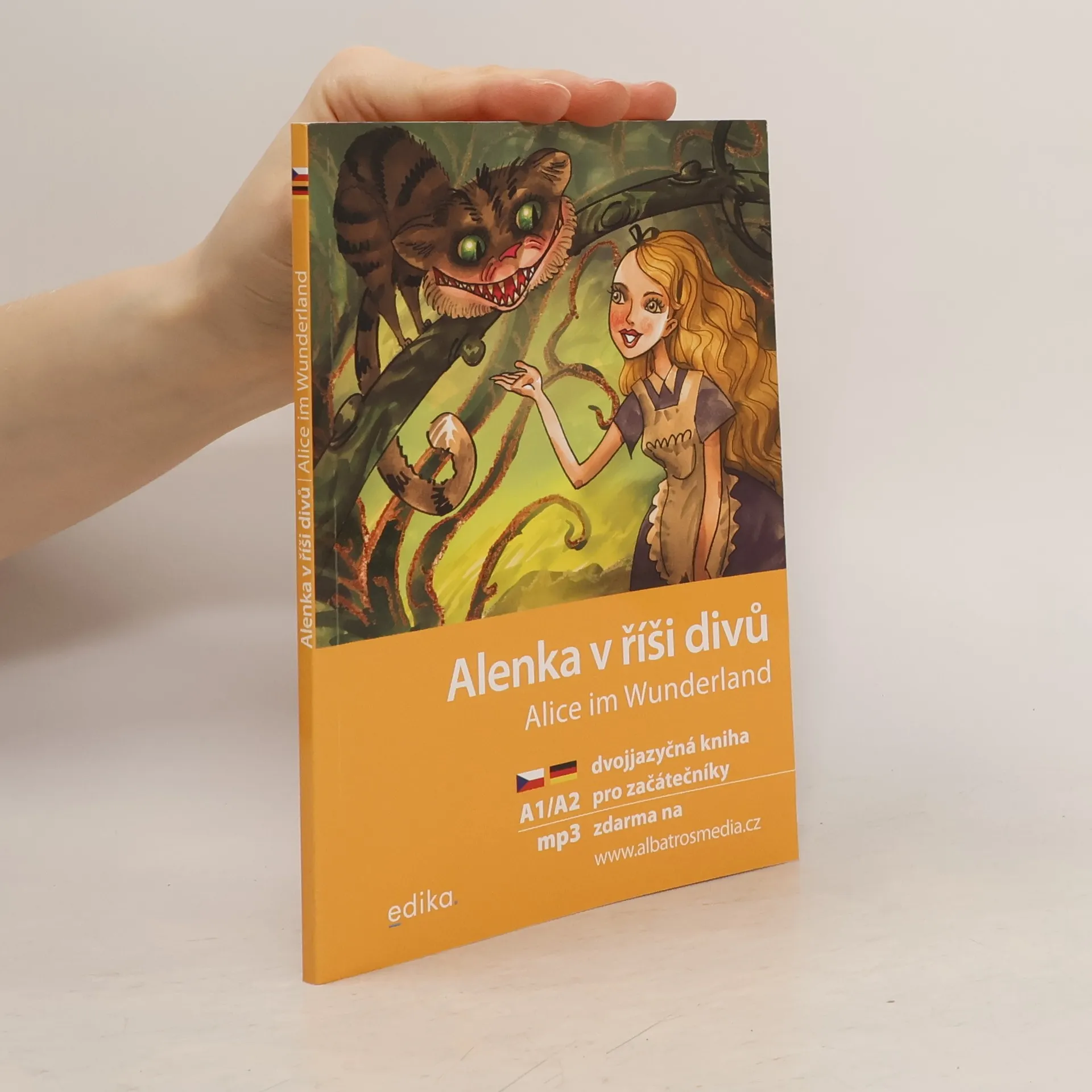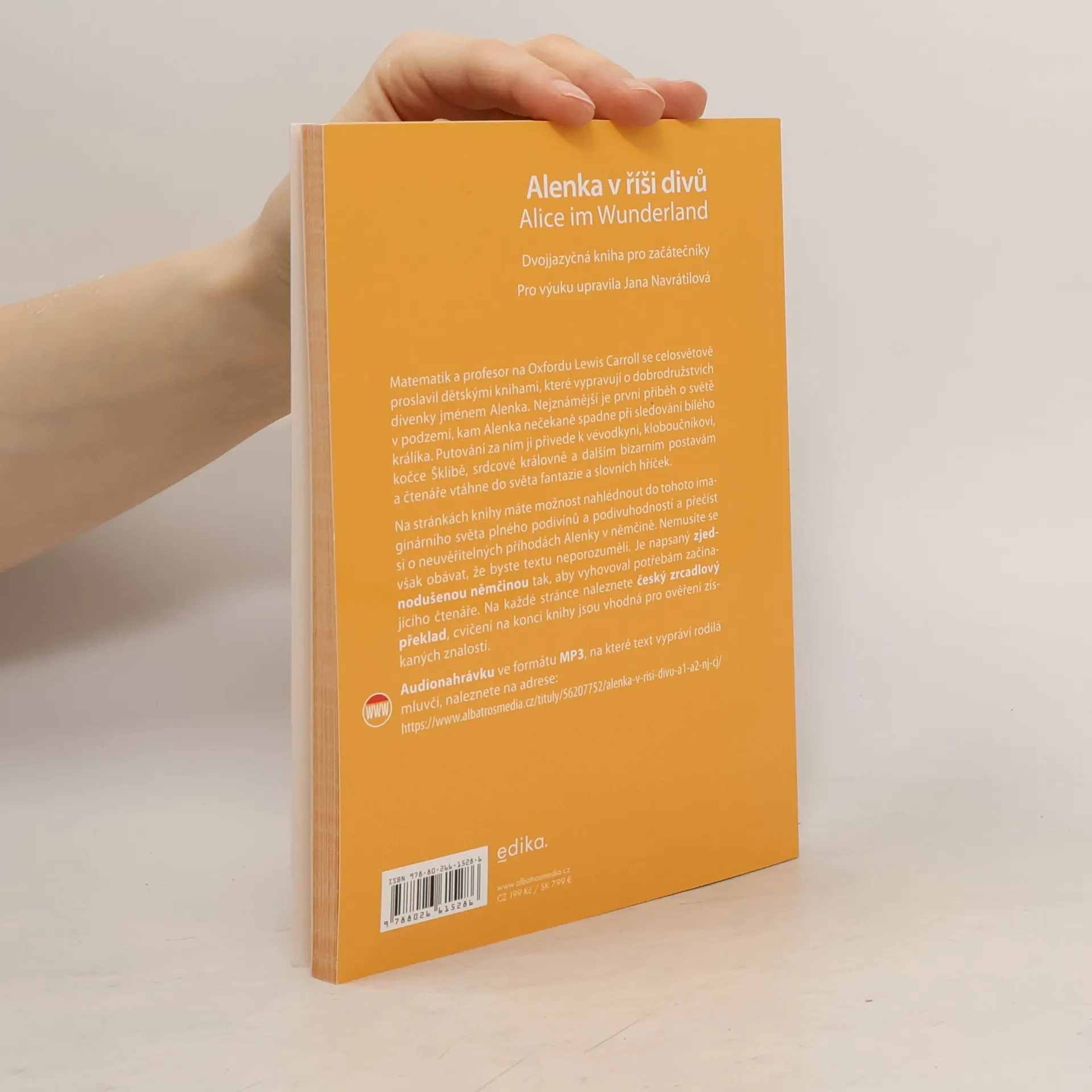 Matematik a profesor na Oxfordu Lewis Carroll se celosvětově proslavil dětskými knihami, které vypravují o dobrodružstvích dívenky jménem Alenka. Nejznámější je první příběh o světě v podzemí, kam Alenka nečekaně spadne při sledování bílého králíka. Putování za ním ji přivede k vévodkyni, kloboučníkovi, kočce Šklíbě, srdcové královně a dalším bizarním postavám a čtenáře vtáhne do světa fantazie a slovních hříček. Na stránkách knihy máte možnost nahlédnout do tohoto imaginárního světa plného podivínů a podivuhodností a přečíst si o neuvěřitelných příhodách Alenky v němčině. Nemusíte se však obávat, že byste textu neporozuměli. Je napsaný zjednodušenou němčinou tak, aby vyhovoval potřebám začínajícího čtenáře. Na každé stránce naleznete český zrcadlový překlad, cvičení na konci knihy jsou vhodná pro ověření získaných znalostí. Audionahrávka ve formátu MP3, na které text vypraví rodilá mluvčí, je zdarma ke stažení na webu.
