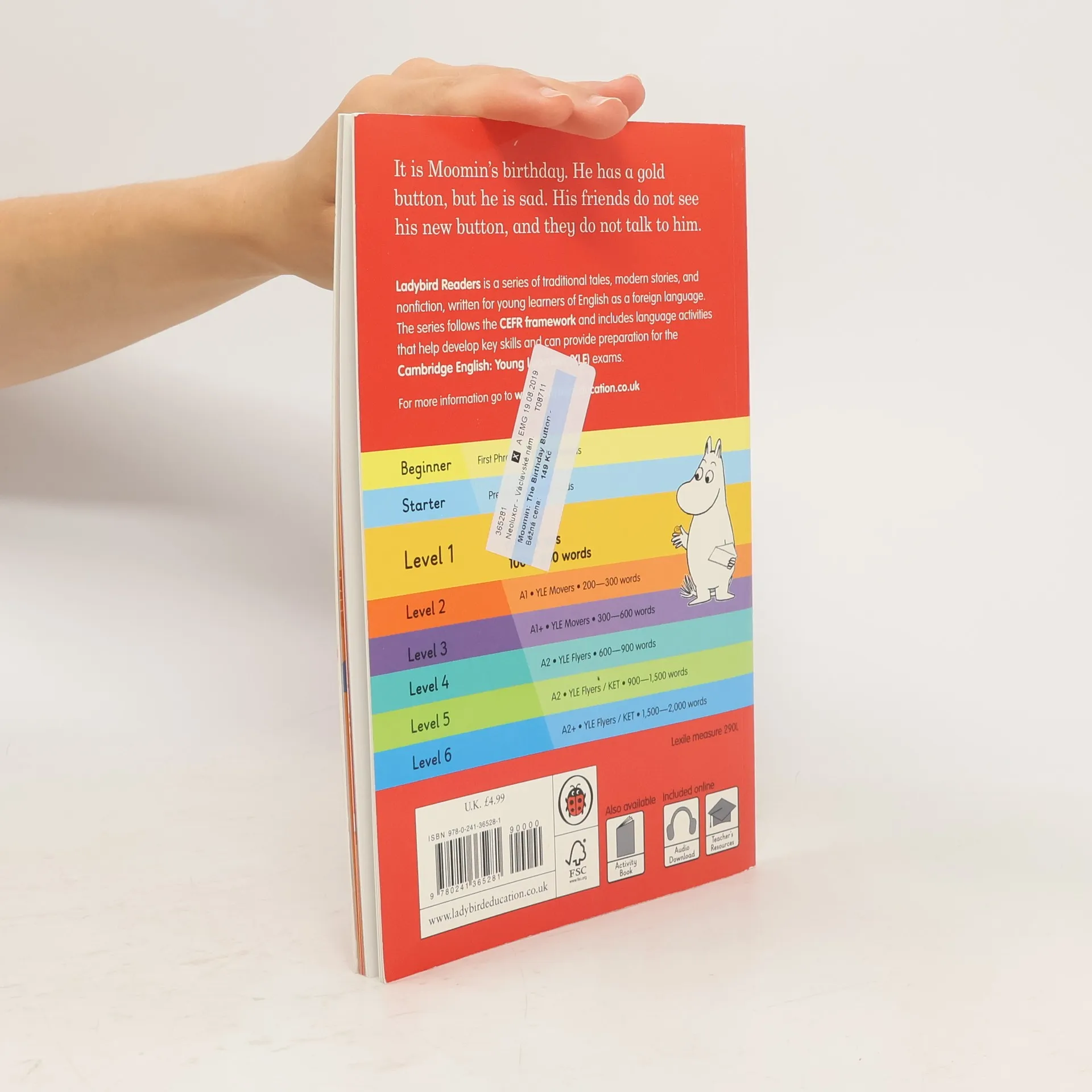 Ladybird Readers is an ELT graded reader series for children aged 3-11 learning English as a foreign or second language. The series includes traditional tales, popular characters, modern stories, and non-fiction. - Beautifully illustrated books, carefully written by language learning experts. - Structured language progression to develop children's reading, writing, speaking, listening and critical thinking skills. - Eight levels follow the Common European Framework of Reference for language learning (CEFR). - Language activities provide preparation for the Cambridge English Pre-A1 to A2 (YLE) tests. - A unique code in each printed book provides access to online audio, extra activities and learning resources. Moomin - The Birthday Button, a Level 1 Reader, is Pre-A1 in the CEFR framework and includes practice for the Cambridge English Pre-A1 Starters tests. Short sentences contain a maximum of two clauses, using the present tense and some simple adjectives. It is Moomin's birthday! He gets a gold button. Why are Moomin's friends not talking to him? Visit the Ladybird Education website for more information.
