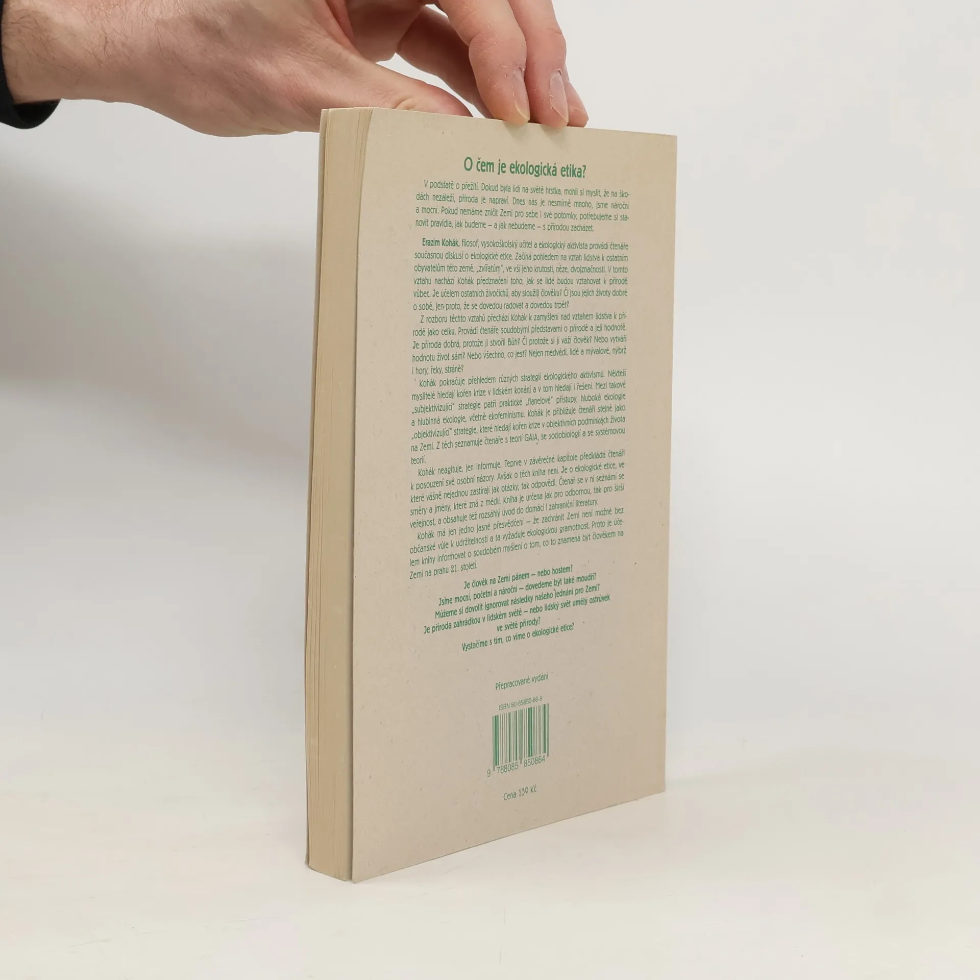 Autor (filosof, vysokoškolský učitel a ekologický aktivista) provádí čtenáře současnou diskusí o ekologické etice. Začíná pohledem na vztah lidstva k ostatním obyvatelům této země, "zvířatům", a od jeho rozboru přechází k zamyšlení nad vztahem lidstva k přírodě jako celku. Provádíčtenáře soudobými představami o přírodě a její hodnotě, poté pokračuje přehledem různých strategií ekologického aktivismu, a to jak "subjektivizujících", tak "objektivizujících". Druhé přepracované vydání.