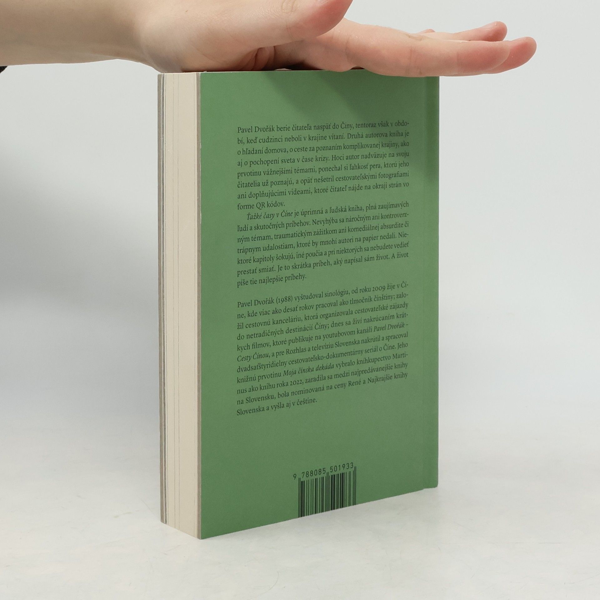 Pavel Dvořák berie čitateľa naspäť do Číny, tentoraz však v období, keď cudzinci neboli v krajine vítaní. Druhá autorova kniha je o hľadaní domova, o ceste za poznaním komplikovanej krajiny, ako aj o pochopení sveta v čase krízy. Hoci autor nadväzuje na svoju prvotinu vážnejšími témami, ponechal si ľahkosť pera, ktorú jeho čitatelia už poznajú, a opäť nešetril cestovateľskými fotografiami ani doplňujúcimi videami, ktoré čitateľ nájde na okraji strán vo forme QR kódov. Ťažké časy v Číne je úprimná a ľudská kniha, plná zaujímavých ľudí a skutočných príbehov. Nevyhýba sa náročným ani kontroverzným témam, traumatickým zážitkom ani komediálnej absurdite či trápnym udalostiam, ktoré by mnohí autori na papier nedali. Niektoré kapitoly šokujú, iné poučia a pri niektorých sa nebudete vedieť prestať smiať. Je to skrátka príbeh, aký napísal sám život. A život píše tie najlepšie príbehy.