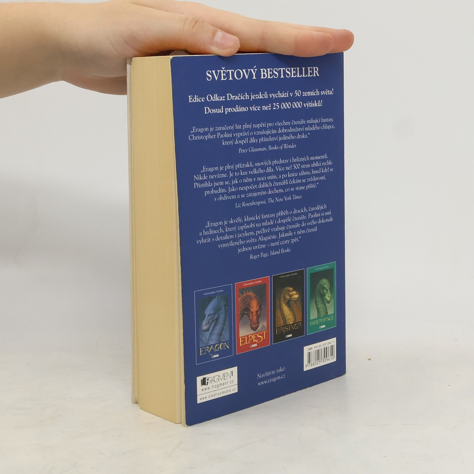 Jeden chlapec, jeden drak, svět dobrodružství. Fantasy bestseller Eragon z pera patnáctiletého Christophera Paoliniho, který nadchl miliony čtenářů po celém světě. Vypráví příběh chudého farmářského chlapce, který najde v Dračích horách modrý kámen, z něhož se vyklube dračí mládě - Safira. Spolu se vydají na nebezpečnou cestu královstvím ovládaným králem, jehož zlo nezná mezí. Dokáže Eragon naplnit své předurčení a převzít břímě legendárních Dračích jezdců? Osud království možná leží v jeho rukou ... První díl tetralogie Odkaz Dračích jezdců.