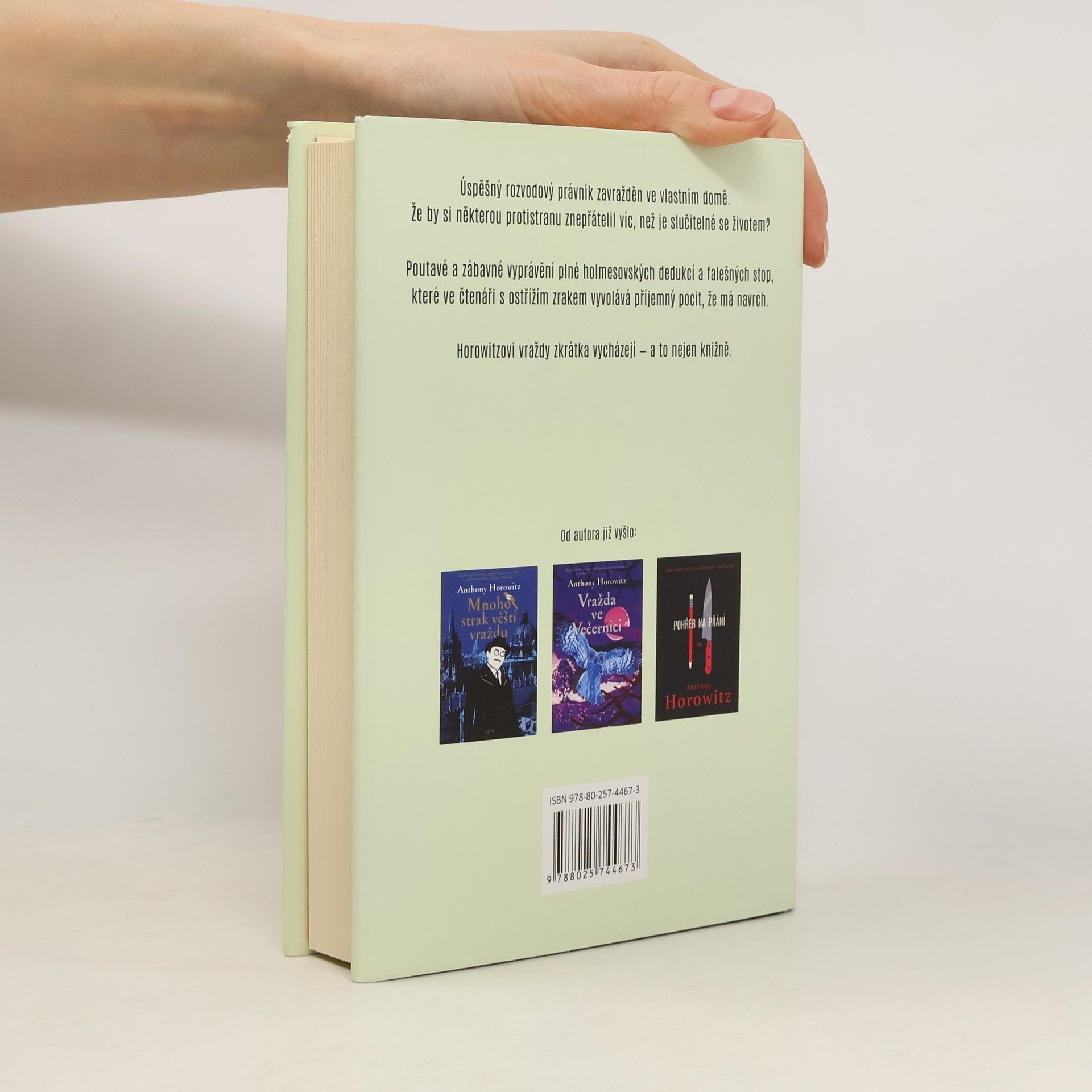 Detektivní román v čele s výstředním, leč geniálním vyšetřovatelem Danielem Hawthornem. Slavný rozvodový advokát celebrit je nalezen ve svém bytě mrtvý. Někdo mu rozbil hlavu láhví vína za 2000 liber. Což vzhledem k faktu, že on sám byl abstinent, působí trochu podivně. Stejně jako trojciferné číslo, které vrah napsal na zeď. Právník si stačil nadělat pár nepřátel, ale který z nich ho nenáviděl natolik, že ho zabil? A jak s tím vším souvisí smrt jeho dávného přítele, k níž došlo jen o den dřív? Policie je v koncích, a tak je znovu povolán neoblíbený, leč brilantní soukromý vyšetřovatel Daniel Hawthorne, který si přizve svého "Watsona", známého spisovatele a scenáristu Anthonyho Horowitze. Anthony by si ale rád trochu zapátral i na vlastní pěst. Zvlášť když má pocit, že před ním jeho společník řadu věcí tají. Navíc mu tahle spolupráce, začíná nepříjemně zasahovat do života.