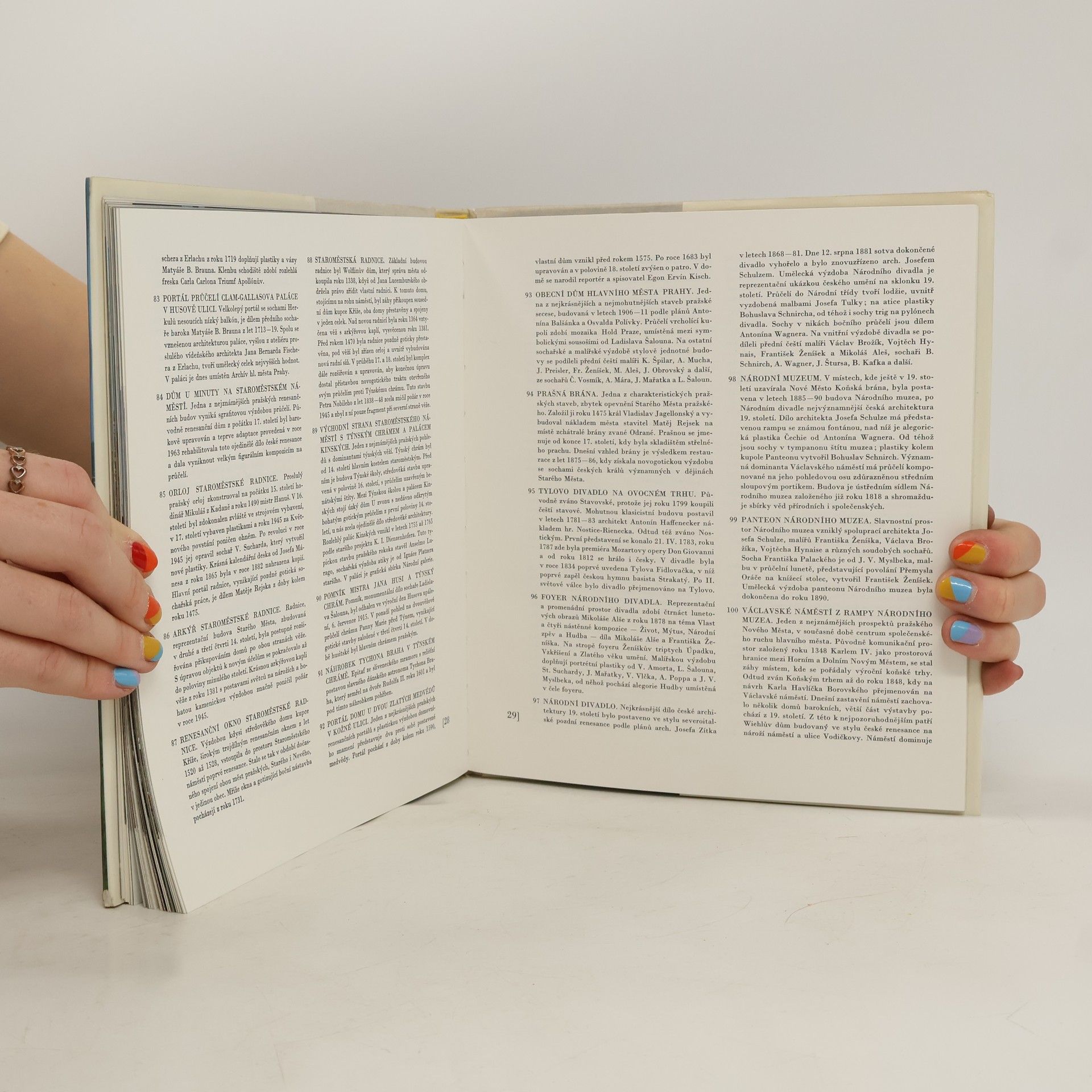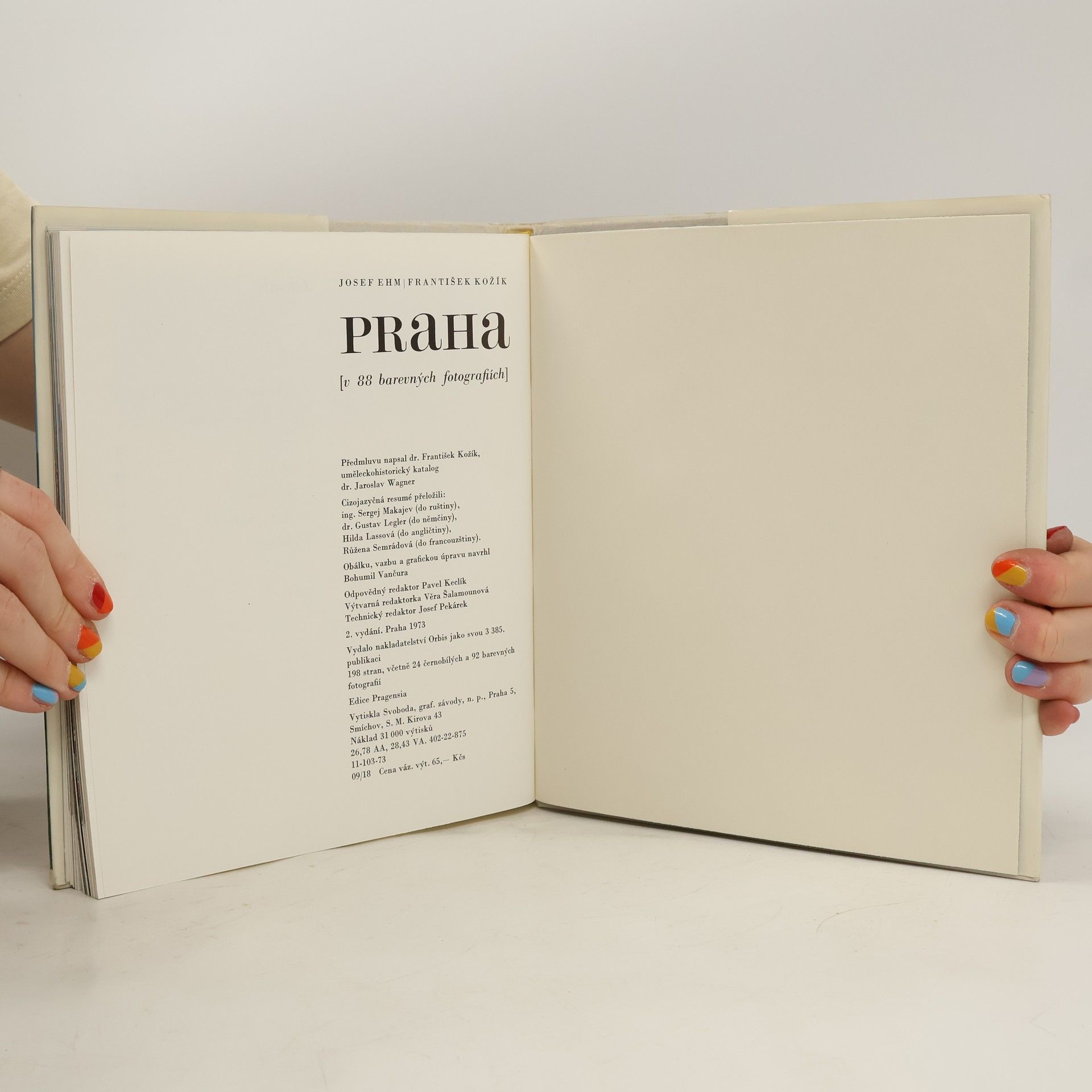 Praha ve fotografiích - 24 černobílých, 92 barevných. Cizojazyčné resumé v ruštině, němčině, angličtině a francouzštině. Reprezentativní publikace, v níž 88 barevných a 24 černobílých fotografií zavádí na Hradčany, Hrad, Malou Stranu, Staré Město, do ulic a náměstí městského centra i do pestré scenérie zahrad a sadů. Souhrnné vysvětlivky k obrázkům obsahují nejnutnější údaje o slozích a architektuře. Knihu uvádí esej F. Kožíka, nastiňující politickou, kulturní a uměleckou historii Prahy.