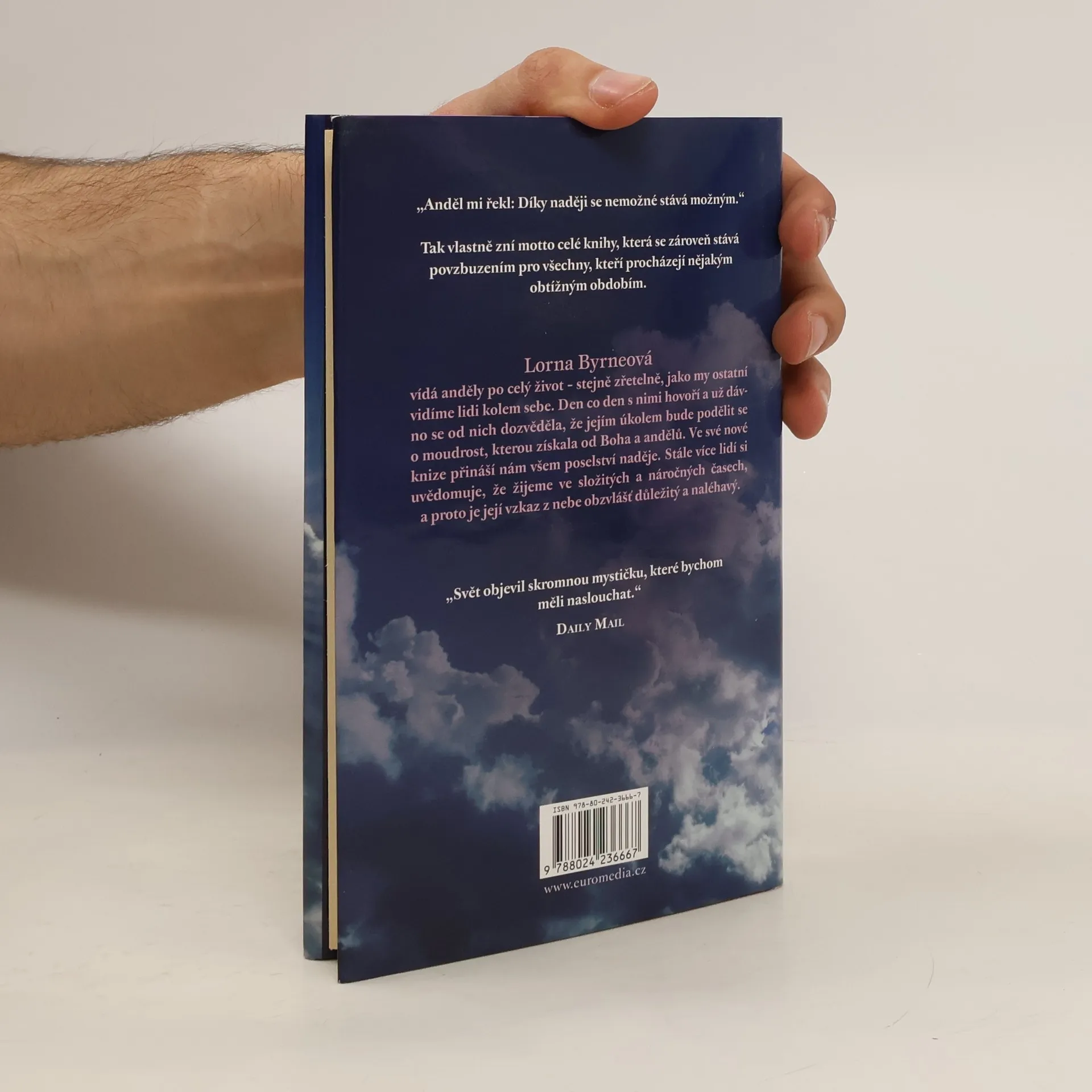 Irská autorka Lorna Byrne, která má od nejútlejšího dětství výjimečnou schopnost vidět anděly a komunikovat s nimi, je českým čtenářům dobře známá. Nesmírnou popularitu si získala jak její autobiografická kniha Andělé v mých vlasech, tak i volné pokračování pod názvem Schody do nebe. Ve svém nejnovějším třetím díle Andělské poselství naděje se autorka obrací přímo ke čtenářům s doporučeními, jak mohou oslovit anděly s prosbou o pomoc. Zdůrazňuje velkou sílu nejen modlitby a lásky, ale především naděje.