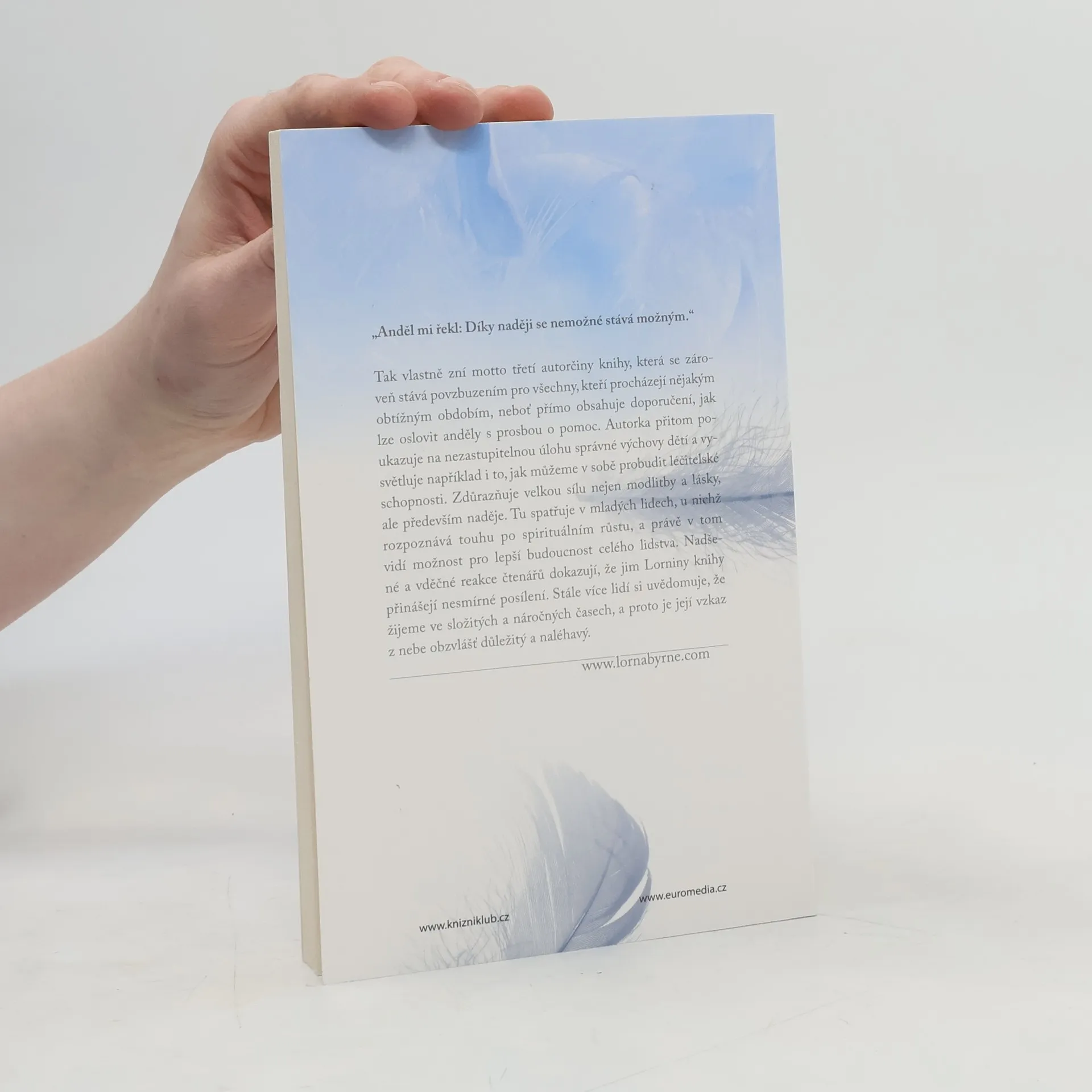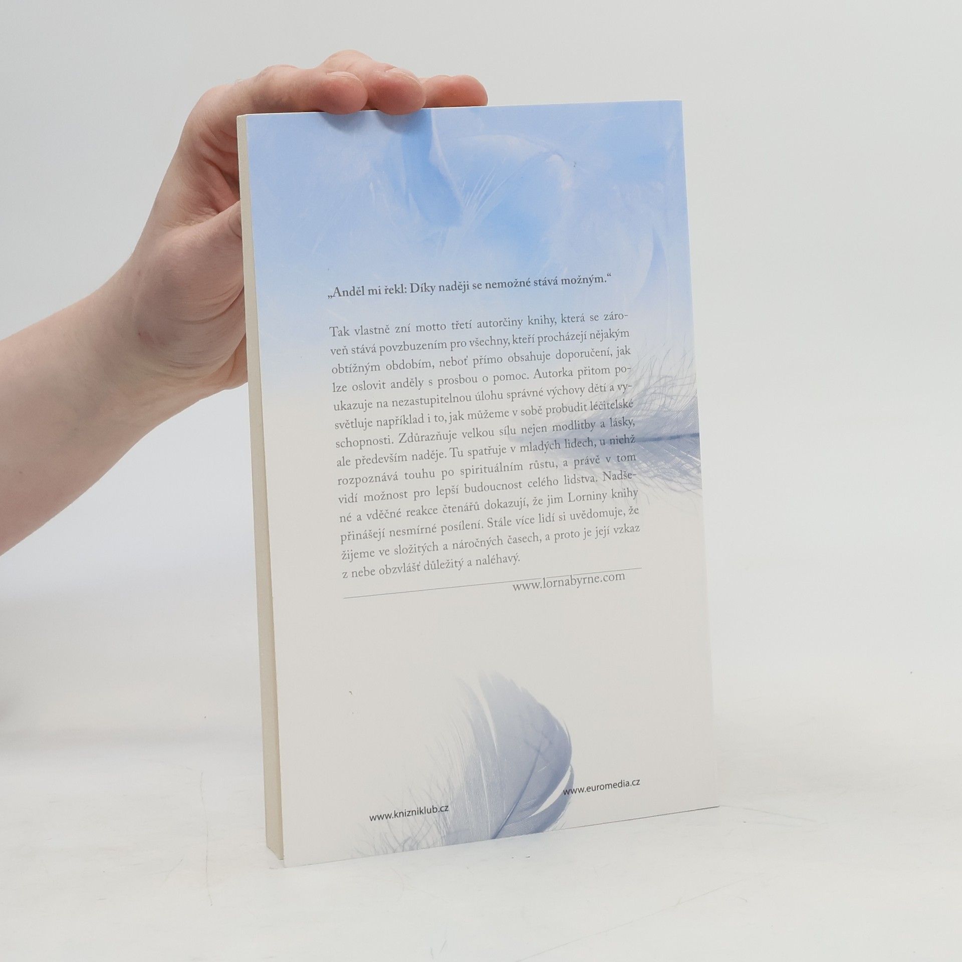 Irská autorka Lorna Byrne, která má od nejútlejšího dětství výjimečnou schopnost vidět anděly a komunikovat s nimi, je českým čtenářům dobře známá. Nesmírnou popularitu si získala jak její autobiografická kniha Andělé v mých vlasech, tak i volné pokračování pod názvem Schody donebe. Ve svém nejnovějším třetím díle Andělské poselství naděje se autorka obrací přímo ke čtenářům s doporučeními, jak mohou oslovit anděly s prosbou o pomoc. Zdůrazňuje velkou sílu nejen modlitby a lásky, ale především naděje.