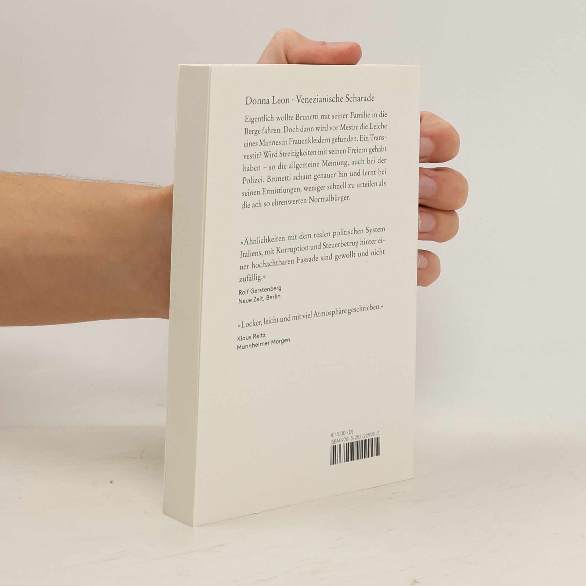 Eigentlich wollte Brunetti mit seiner Familie in die Berge fahren. Doch dann wird vor Mestre die Leiche eines Mannes in Frauenkleidern gefunden. Ein Transvestit? Wird Streitigkeiten mit seinen Freiern gehabt haben so die allgemeine Meinung, auch bei der Polizei. Brunetti schaut genauer hin und lernt bei seinen Ermittlungen, weniger schnell zu urteilen als die ach so ehrenwerten Normalbürger. "