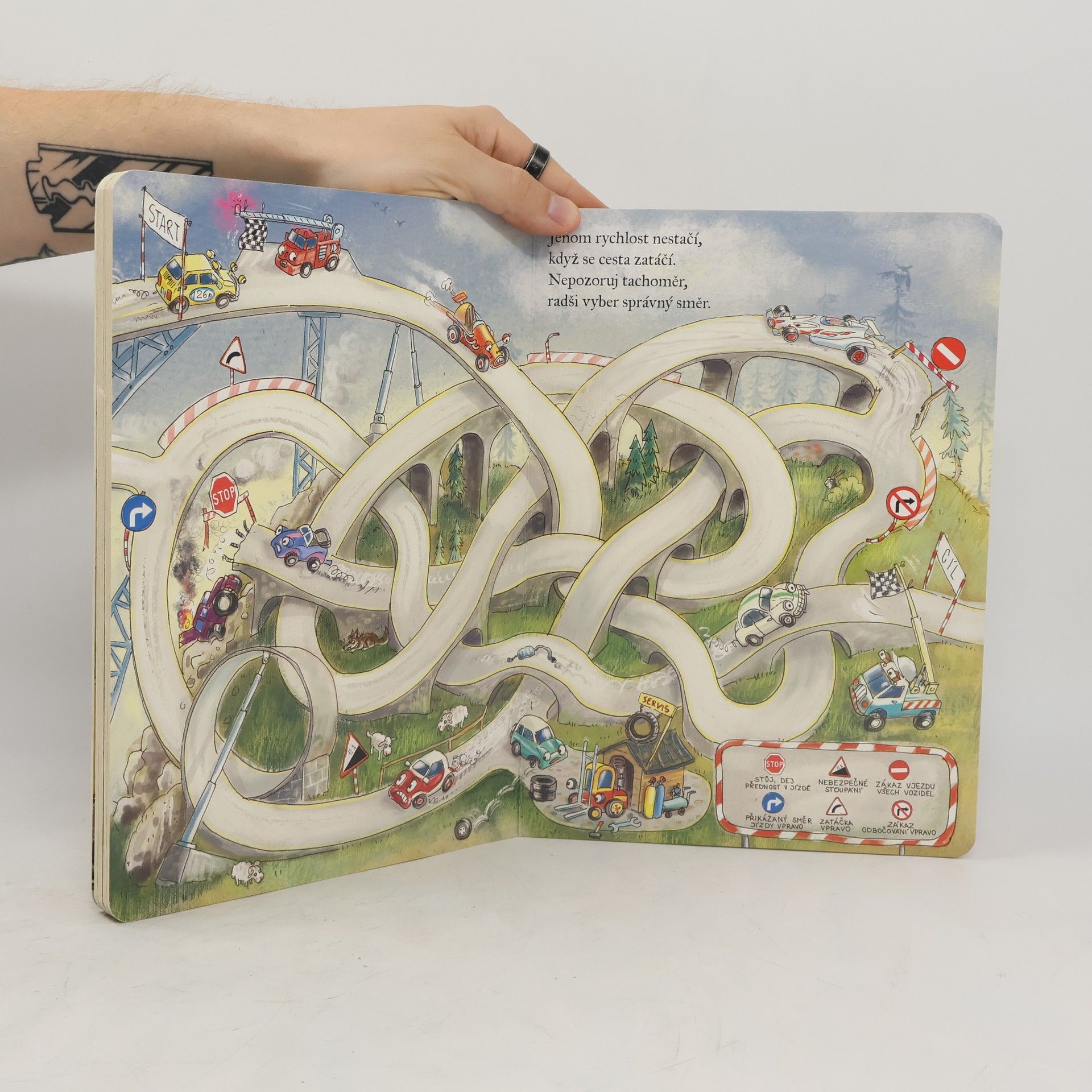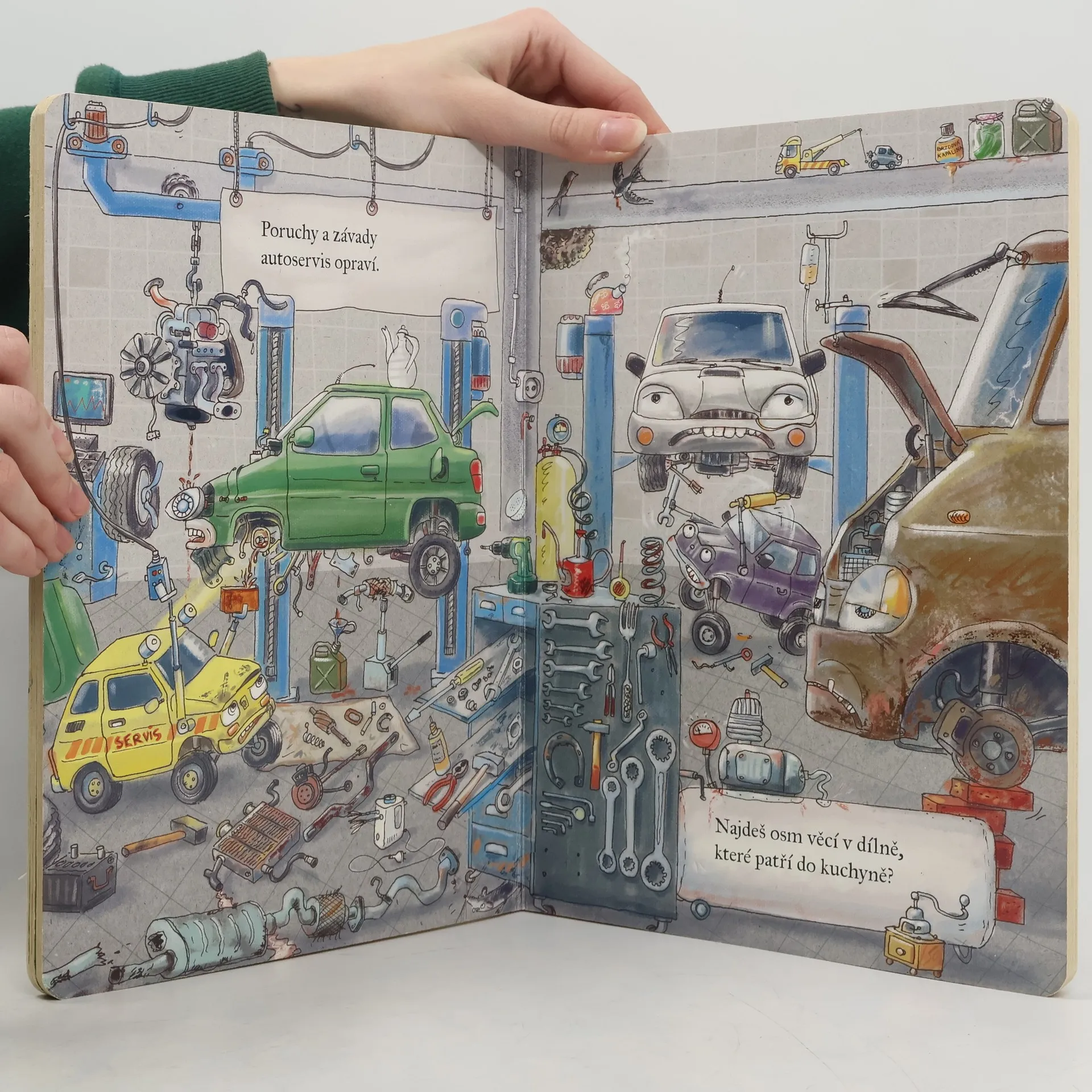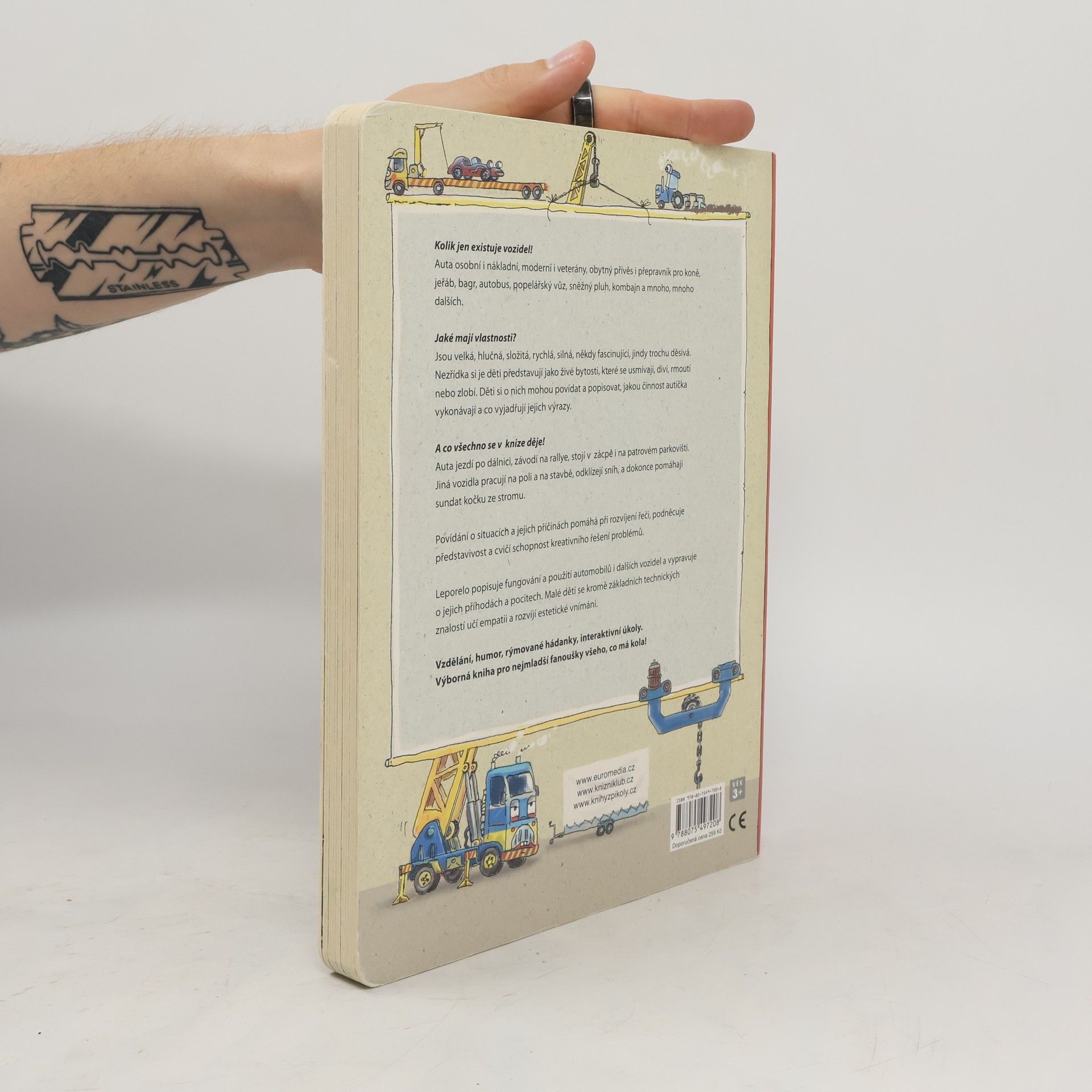 Vzdělání, humor, rýmované hádanky i interaktivní úkoly najdou děti v leporelu určeném pro nejmladší fanoušky všeho, co má kola. Jen si to představte: Kolik existuje vozidel! Auta osobní i nákladní, moderní i veterány, obytný přívěs i přepravník pro koně, jeřáb, bagr, autobus, popelářský vůz, sněžný pluh, kombajn a mnoho, mnoho dalších. Auta jedou po dálnici, závodí na rallye, stojí v zácpě i na patrovém parkovišti. Jiná vozidla pracují na poli a na stavbě nebo odklízejí sníh. Jsou velká, hlučná, složitá, rychlá, silná, někdy fascinující, jindy trochu děsivá. Nezřídka si je děti představují jako živé bytosti, které se usmívají, diví, rmoutí nebo zlobí. Děti si o nich mohou povídat a popisovat, jakou činnost autíčka vykonávají a co vyjadřují jejich výrazy. Povídání o situacích, dojmech a jejich příčinách pomáhá při rozvíjení řeči, podněcuje představivost, učí empatii a cvičí schopnost kreativního řešení problémů.