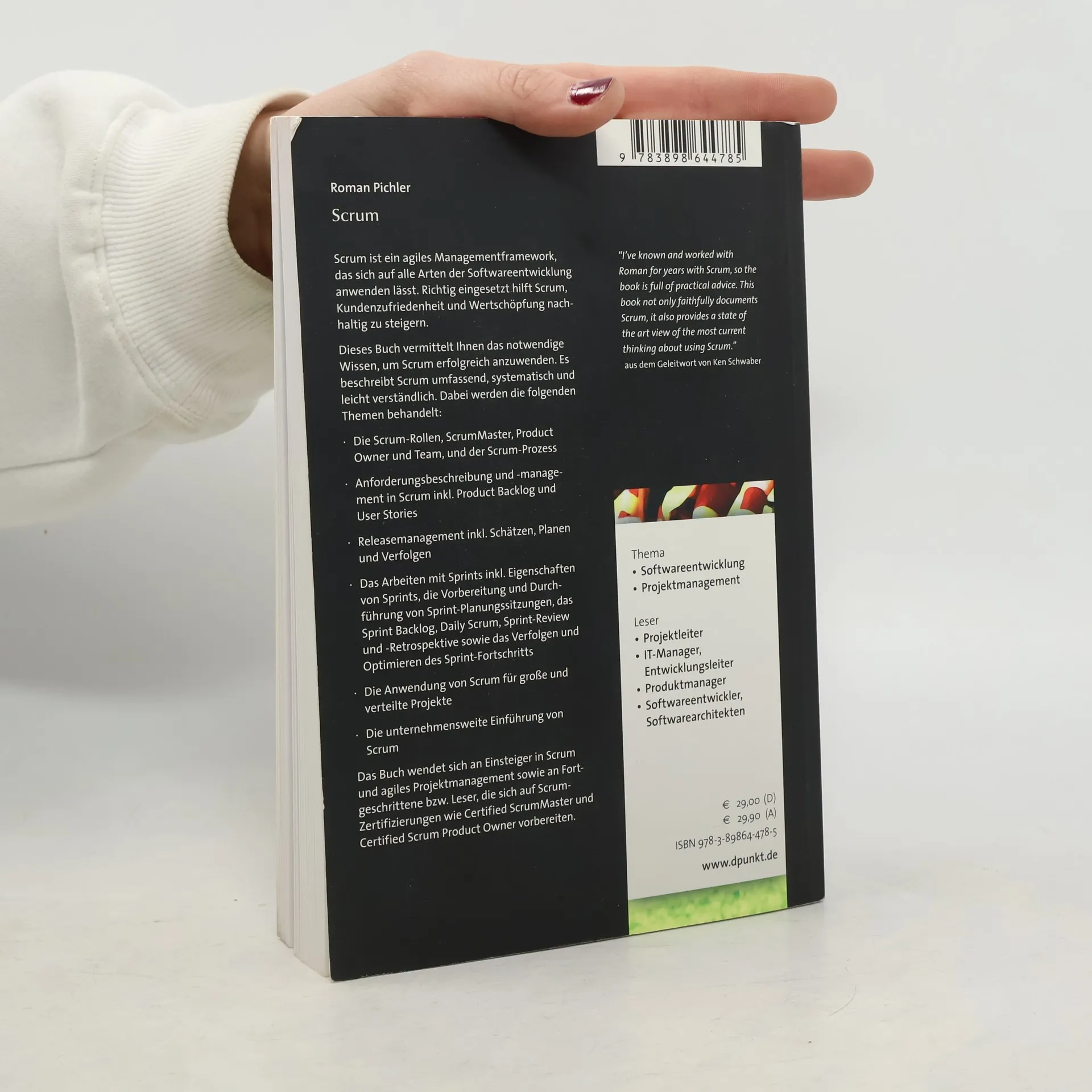 Scrum ist ein agiles Projektmanagementframework, das auf alle Arten der Softwareentwicklung anwendbar ist und die Kundenzufriedenheit sowie die Wertschöpfung nachhaltig steigern kann. Dieses Buch vermittelt das notwendige Wissen für eine erfolgreiche Anwendung von Scrum und behandelt die Themen umfassend, systematisch und verständlich. Dazu gehören die Scrum-Rollen wie ScrumMaster, Product Owner und Team sowie der Scrum-Prozess. Es wird auf Anforderungsbeschreibung und -management in Scrum eingegangen, einschließlich Produkt Backlog und User Stories. Zudem werden Releasemanagement, Schätzungen, Planung und Verfolgung behandelt. Das Buch erläutert das Arbeiten mit Sprints, einschließlich ihrer Eigenschaften, der Vorbereitung und Durchführung von Sprint-Planungssitzungen, des Sprint Backlogs, Daily Scrums, Sprint-Reviews und -Retrospektiven sowie der Optimierung des Sprint-Fortschritts. Außerdem wird die Anwendung von Scrum für große und verteilte Projekte sowie die unternehmensweite Einführung von Scrum thematisiert. Es richtet sich an Einsteiger und Fortgeschrittene, die sich auf Scrum-Zertifizierungen wie Certified ScrumMaster und Certified Scrum Product Owner vorbereiten. "I've known and worked with Roman for years with Scrum, so the book is full of practical advice." (aus dem Geleitwort von Ken Schwaber)