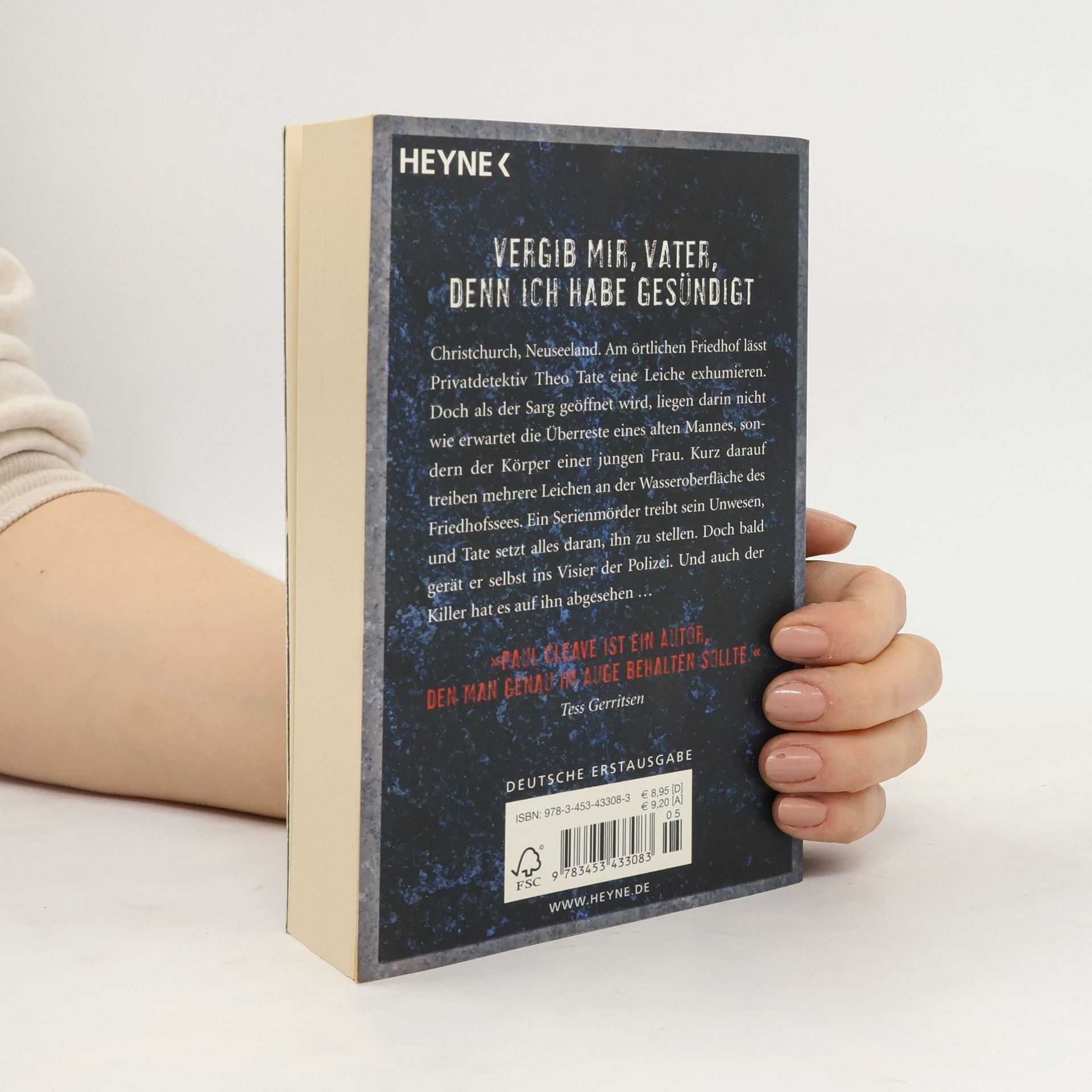 Vergib mir, Vater, denn ich habe gesündigt Christchurch, Neuseeland. Am örtlichen Friedhof lässt Privatdetektiv Theo Tate eine Leiche exhumieren. Doch als der Sarg geöffnet wird, liegen darin nicht wie erwartet die Überreste eines alten Mannes, sondern der Körper einer jungen Frau. Kurz darauf treiben mehrere Leichen an der Wasseroberfläche des Friedhofssees. Ein Serienmörder treibt sein Unwesen und Tate setzt alles daran, ihn zu stellen. Doch bald gerät er selbst ins Visier der Polizei. Und auch der Killer hat es auf ihn abgesehen …