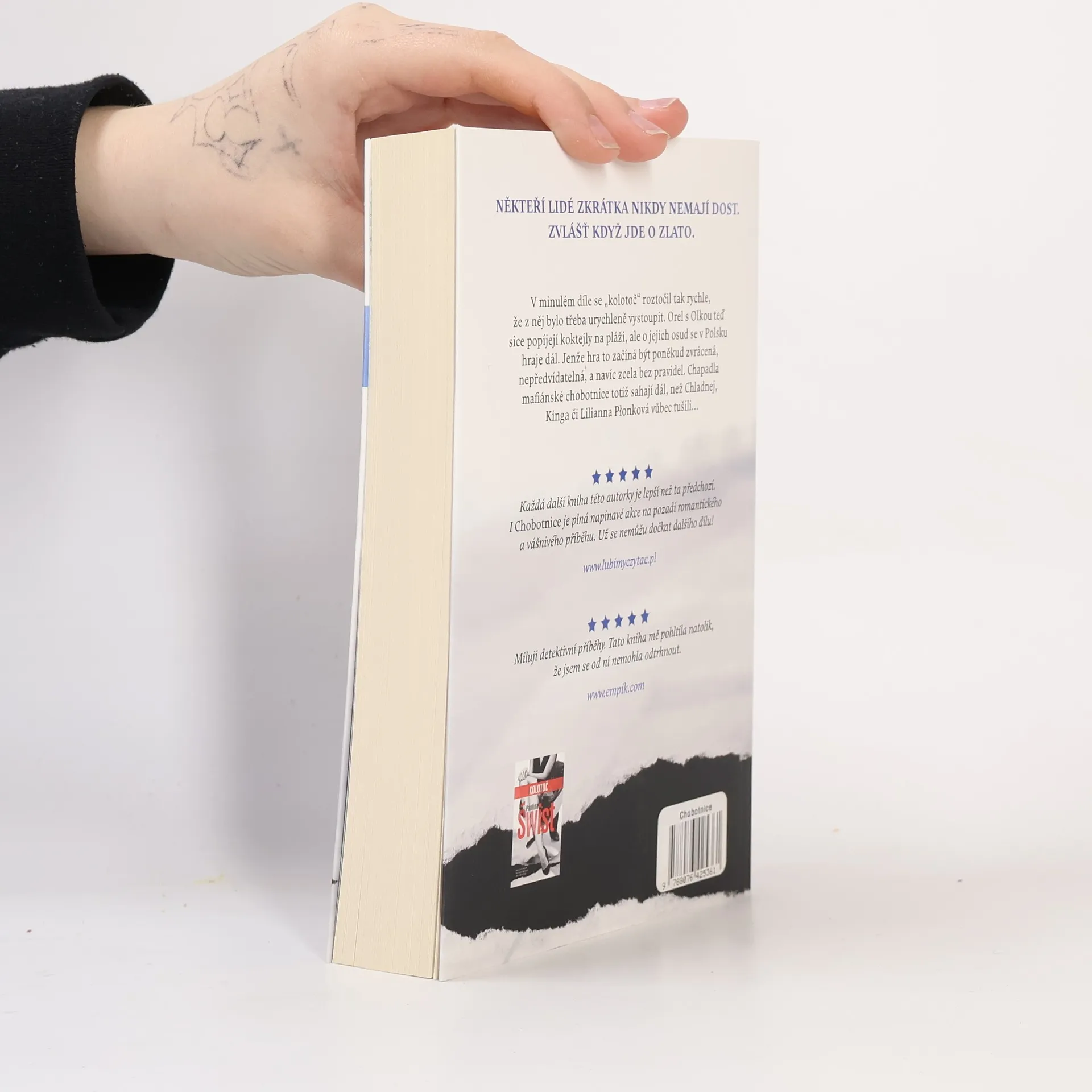 Román Chobotnice od Pauliny Świst je další silná kniha od nejpopulárnější polské debutantky posledních několika let. Po bestselleru s názvem Kolotoč nastal čas na pokračování, kde už nepřichází na scénu jen finanční machinace a plamenná vášeň, ale také pašování zlata a aféra katolické církve. Policista z ústřední vyšetřovací kanceláře Michał Grosicki jede na služební misi do Horního Slezska. Do zločinecké organizace se mu podaří proniknout natolik dobře, že jej nechá zatknout tamní prokurátor Zimnicki. Ale to je teprve začátek nového obřího spiknutí, do něhož jsou zapojení i nám dobře známí hrdinové z prvního dílu – Orel a Olka. Vše nasvědčuje tomu, že příběh finančních podvodů zdaleka neskončil útěkem z Polska… Četba Chobotnice je nefalšovaná jízda bez řídítek. Aféra střídá aféru a ve hře je toho stále víc. To všechno se přitom – jak už jsme zvyklí – odehrává v atmosféře žhavé vášně. Paulina Świst dokáže jako žádná jiná autorka brilantně spojovat bravurní líčení děje s odvážnou erotikou a tajemstvími právnického světa. Spisovatelka pracuje zároveň jako advokátka specializující se na trestní právo a důkladně díky tomu zná temné stránky polského trestního systému. Na základě vlastních zkušeností vystavěla další detektivní příběh, který by se klidně mohl odehrát i ve skutečnosti. Ostatně kdo ví, jestli se skutečně nestal…