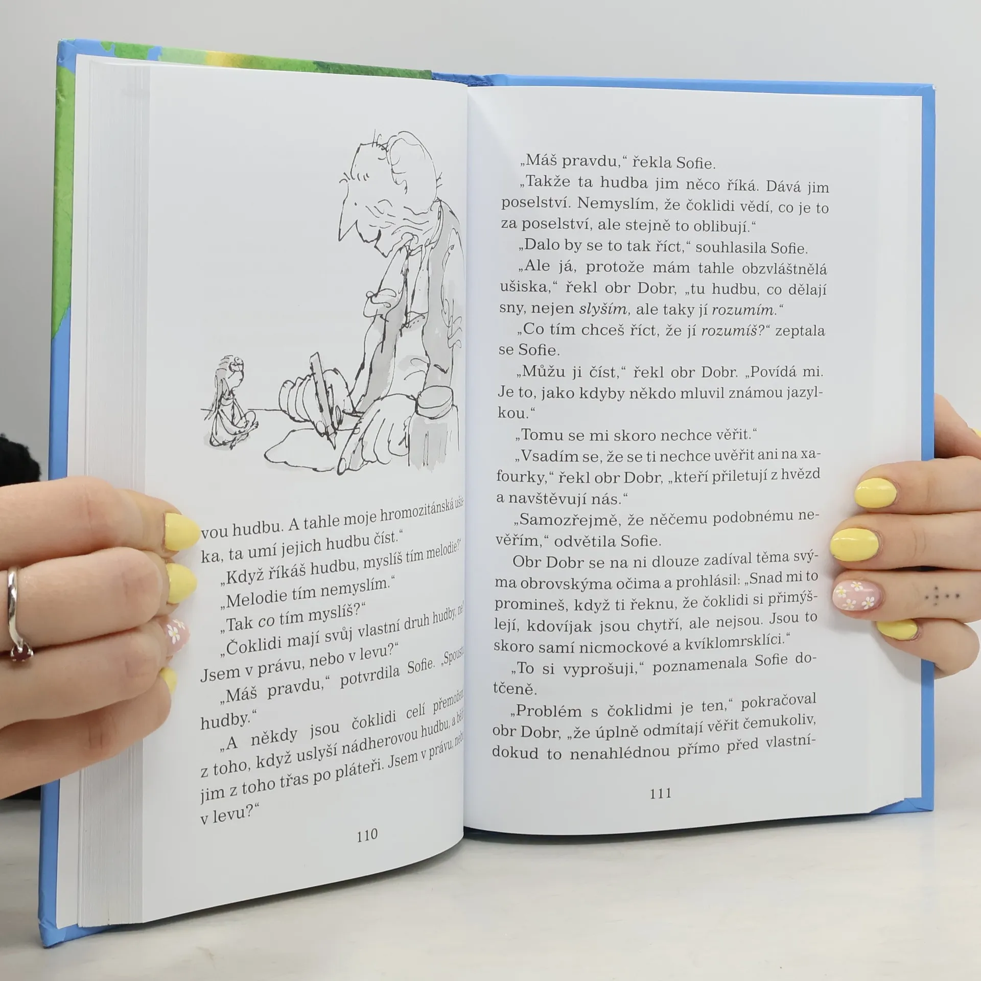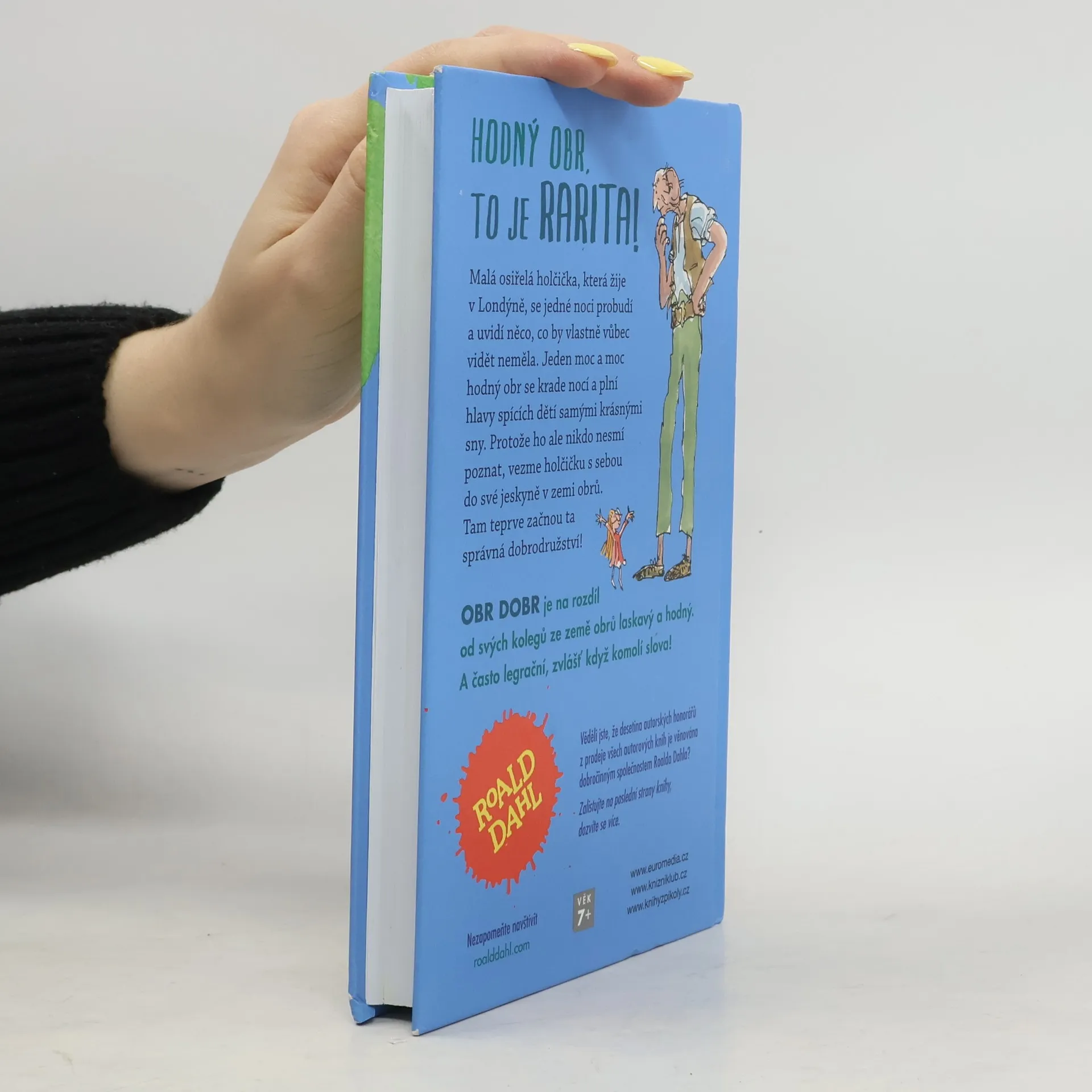 Malá osiřelá holčička, která žije v Londýně, se jedné noci probudí a uvidí něco, co by vlastně vůbec vidět neměla. Jeden moc a moc hodný obr se krade nocí a plní hlavy spících dětí samými krásnými sny. Protože ho ale nikdo nesmí poznat, vezme holčičku s sebou do své jeskyně v zemi obrů. Tam teprve začnou ta správná dobrodružství!