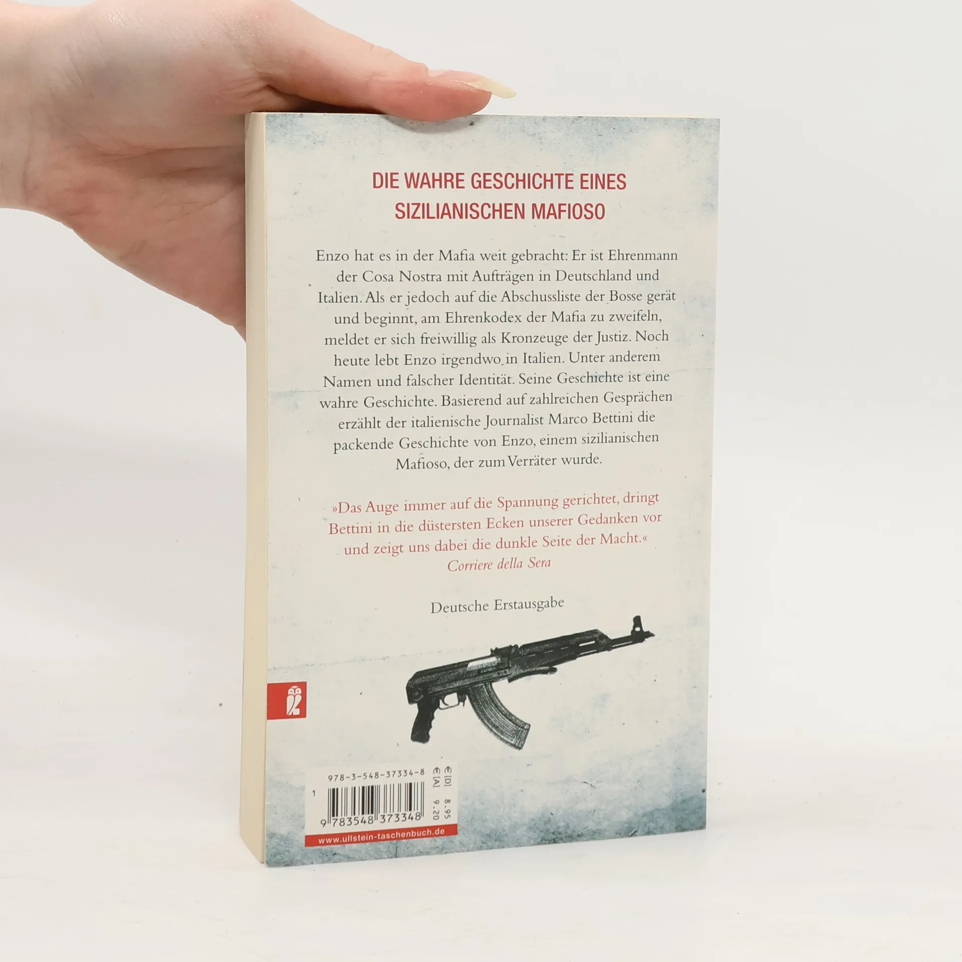 Enzo hat es in der Mafia weit gebracht: Er ist Ehrenmann der Cosa Nostra mit Aufträgen in Deutschland und Italien. Als er jedoch auf die Abschussliste der Bosse gerät und beginnt, am Ehrenkodex der Mafia zu zweifeln, wird er zum Kronzeugen der Justiz. Noch heute lebt Enzo irgendwo in Italien. Unter anderem Namen und falscher Identität. Seine Geschichte ist eine wahre Geschichte. Basierend auf zahlreichen Gesprächen erzählt der italienische Journalist Marco Bettini die packende Geschichte von Enzo, einem sizilianischen Mafioso, der zum Verräter wurde.