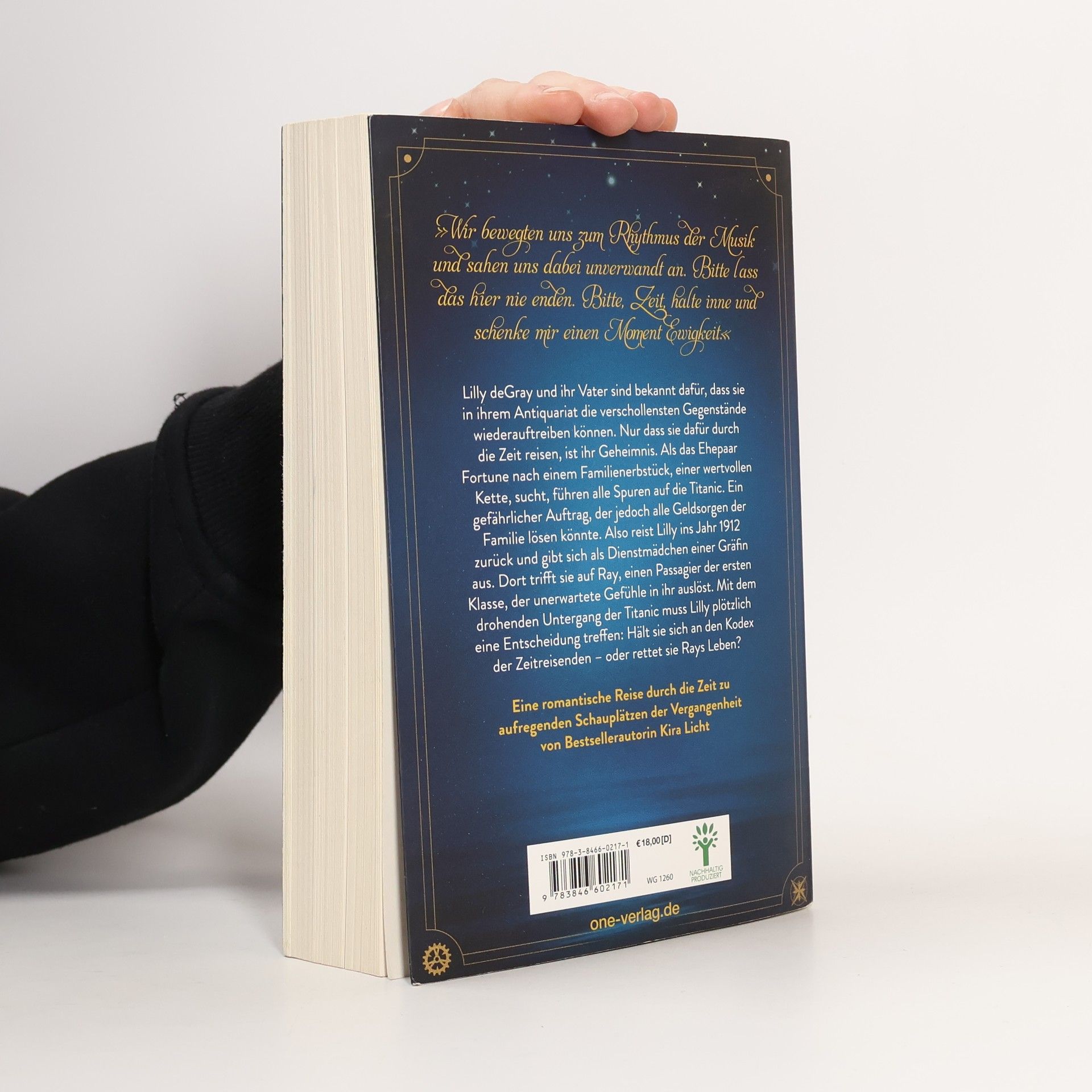 Der Auftakt einer neuen Urban-Fantasy-Dilogie mit Suchtpotenzial von Bestsellerautorin Kira Licht Lilly deGray und ihr Vater sind bekannt dafür, dass sie in ihrem Antiquariat die verschollensten Gegenstände wieder auftreiben können. Nur dass sie dafür durch die Zeit reisen, ist ihr Geheimnis. Als das Ehepaar Fortune nach einem Familienerbstück, einer wertvollen Kette, sucht, führen alle Spuren auf die Titanic. Ein gefährlicher Auftrag, der jedoch alle Geldsorgen der Familie lösen könnte. Also reist Lilly ins Jahr 1912 zurück und gibt sich als Dienstmädchen einer Gräfin aus. Dort trifft sie auf Ray, einen Passagier der ersten Klasse, der unerwartete Gefühle in ihr auslöst. Mit dem drohenden Untergang der Titanic muss Lilly plötzlich eine Entscheidung treffen: Hält sie sich an den Kodex der Zeitreisenden - oder rettet sie Rays Leben?