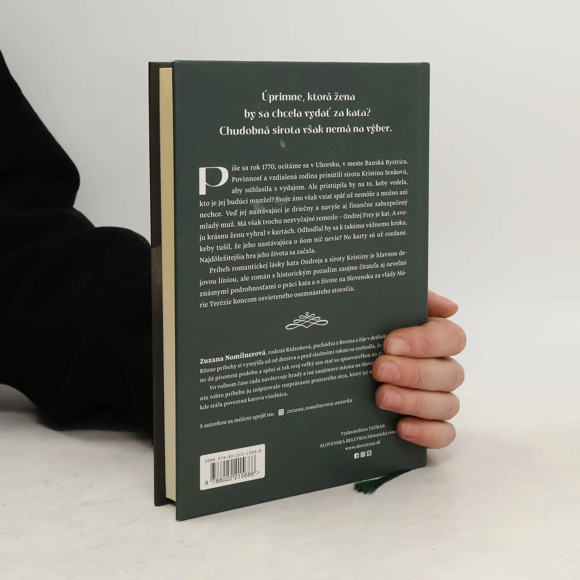 Aké je to byť katovou ženou? Sirota Kristína Srnková to čoskoro zistí. Driečny Ondrej Frey vyhral jej ruku v kartách a ona súhlasila, že sa zaňho vydá. Netušila však, čím sa jej nastávajúci živí. No ani mladý muž nepredpokladal, že jeho verenica o ňom nič nevie… Píše sa rok 1770, ocitáme sa v Uhorsku, v meste Banská Bystrica, v osvietenom osemnástom storočí za vlády Márie Terézie. Debut Zuzany Nomilnerovej je inšpirovaný rozprávaním jej prastarého otca. Rodáčka z Brezna často počúvala v detstve príbehy o katovi, ktorý tam chodieval za prácou na koni až z Banskej Bystrice, a prastarý otec jej poukazoval aj miesta, kde sa kedysi popravovalo. Autorka sa už vtedy rozhodla, že príbeh musí raz napísať. Tak vznikol dojímavý román o každodennom živote kata, prostredníctvom ktorého sa dozvieme nielen, čo musí kat vedieť, čo patrí k jeho povinnostiam, ale aj podrobnosti o tom, aké druhy mučenia v tých časoch existovali. A romantický vzťah medzi Kristínou a Ondrejom je plný vášnivých vzplanutí, ale na svojej ceste za šťastím sa obaja musia popasovať s mnohými peripetiami…
