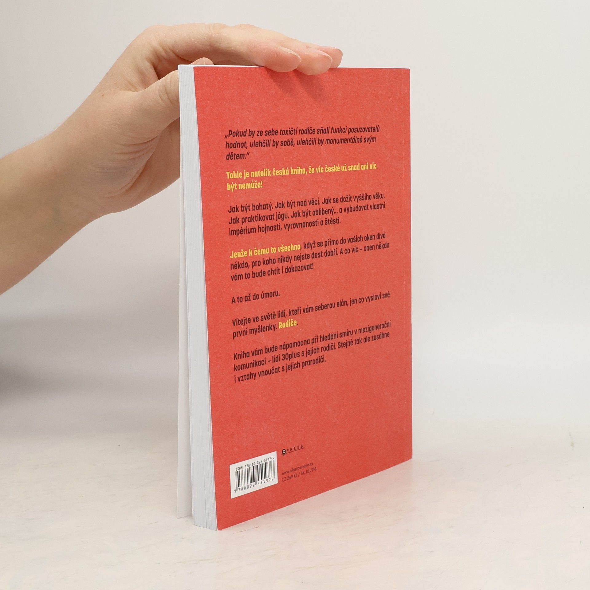 Vítejte ve světě lidí, kteří vám seberou elán, jen co vysloví své první myšlenky: Rodiče. Jak být bohatý. Jak být nad věcí. Jak se dožít vyššího věku. Jak být oblíbený… a vybudovat vlastní impérium hojnosti, vyrovnanosti a štěstí. Podobné návody najdete všude. Jenže k čemuto všechno, když se přímo do vašich oken dívá někdo, pro koho nikdy nejste dost dobří? A co víc – onen někdo vám to bude chtít i dokazovat… Nic není bezvýchodné. Tato kniha vám bude nápomocna při hledání smíru v mezigenerační komunikaci – lidí 30plus s jejich rodiči. A neopomene ani vztahy vnoučat s prarodiči.