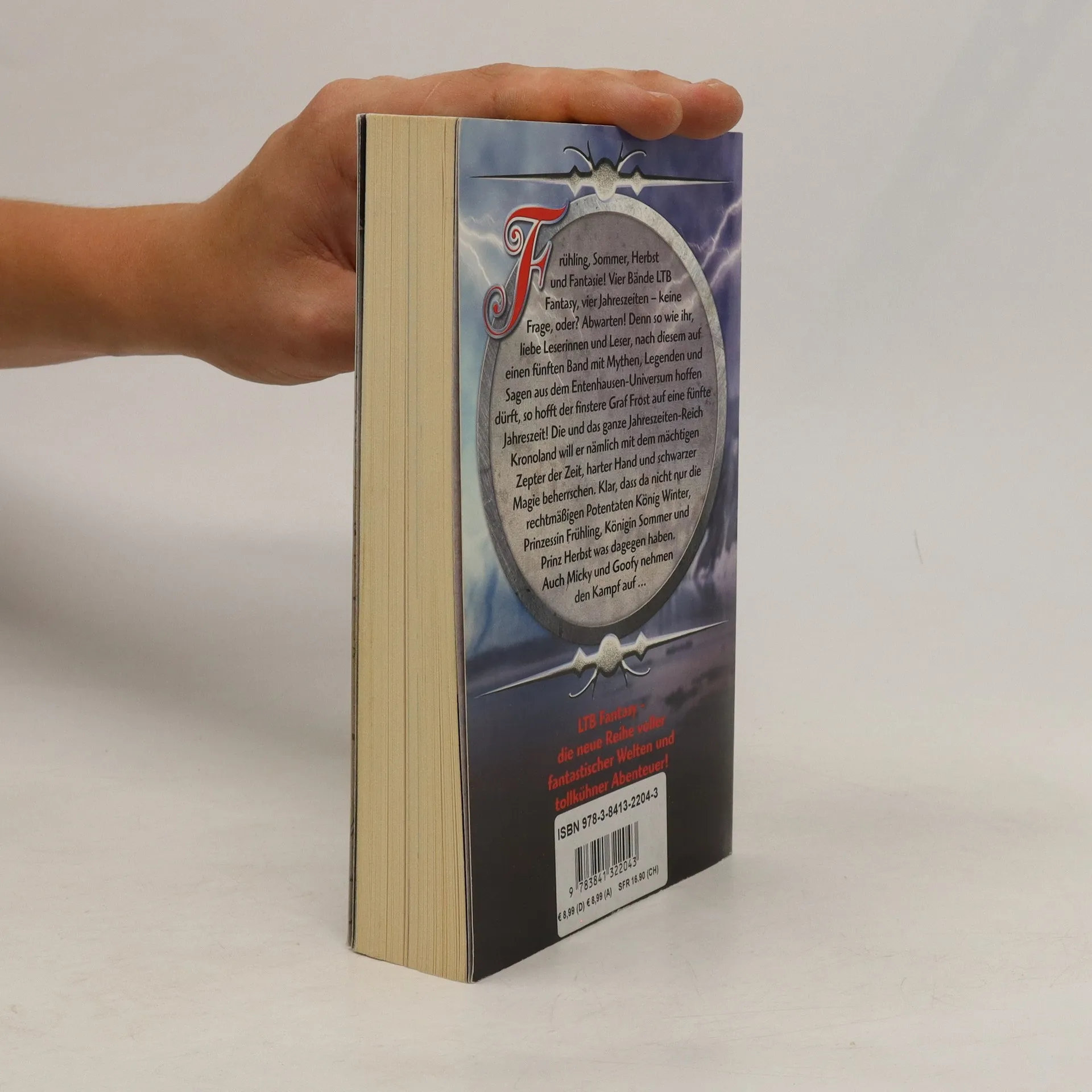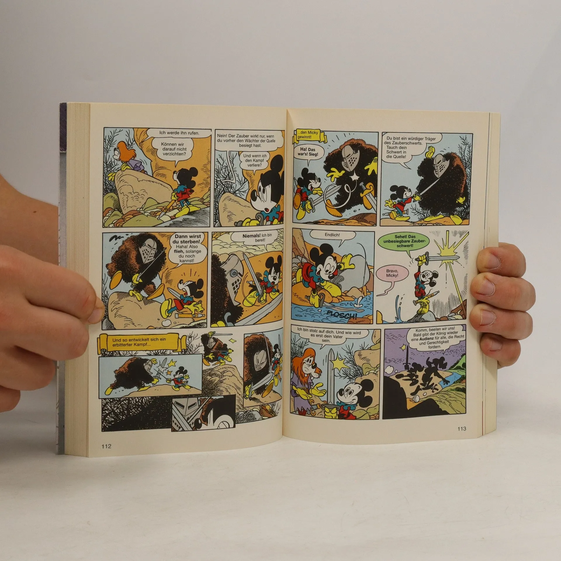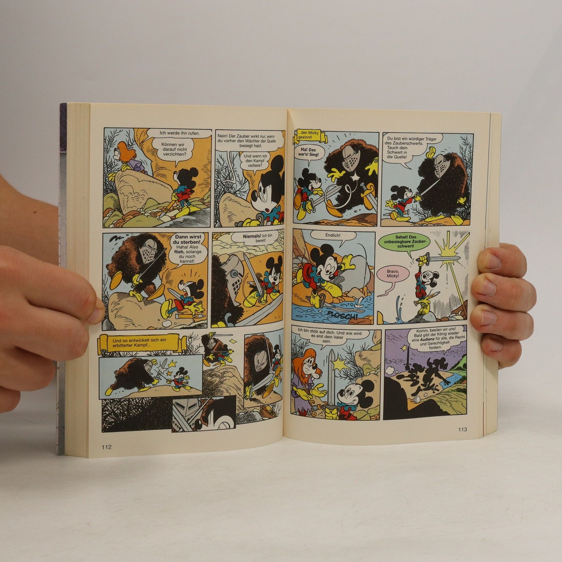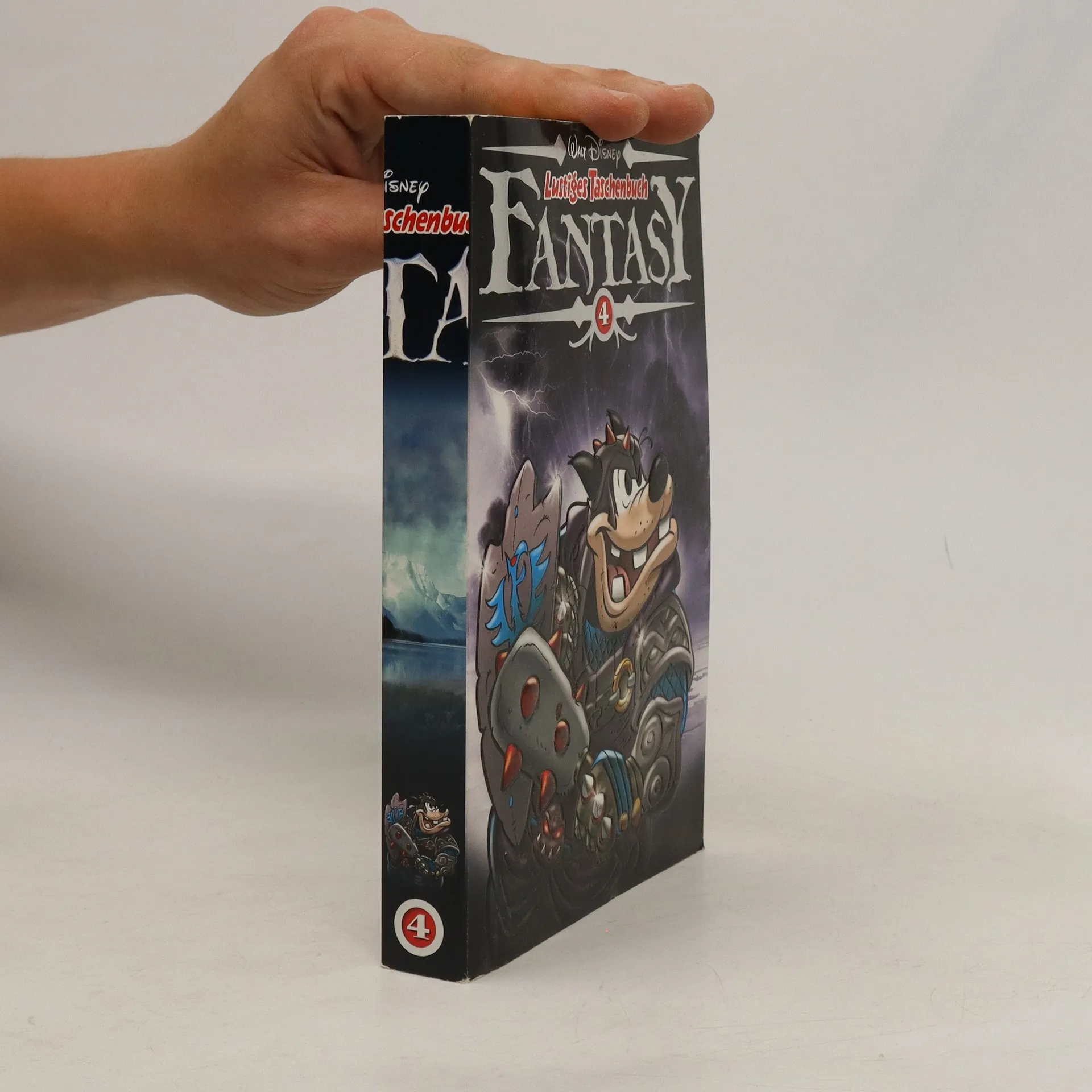 The German publication order and cover order differ from the Italian originals. This is why the numberings and covers do not match. Contains the following stories: - Die Sage von Hundertturm - Das unbesiegbare Schwert - Der Kampf der Finsternis gegen das Licht - Unentschieden - Alles Käse? - Die Welt der zwei Sonnen - Kostpröbchen - Graf Frost und das Zepter der Zeit - Ein wahrer Ritter Im fernen Reich Hundertturm droht Gefährliches. Der Herr des Bösen hat einen großen Teil der Welt bereits an sich gerissen. Er besitzt sechs magische Talismane, die vor einer langen Zeit in Hundertturm hergestellt wurden. Wenn nun auch noch der siebte und somit letzte Talisman in seine Hände gelangt, würde das den Untergang Hundertturms bedeuten. Donald, der letzte Nachkomme von Duckin, soll die Gefahr abwenden. Duckin, das ist der Schmied der magischen Pfanne. Leider weiß Donald weder, dass er Duckin'sches Blut hat, noch dass es sich bei der magischen Pfanne um den siebten Talisman handelt. Gemeinsam mit Tick, Trick und Track macht er sich auf die Suche danach. Trolle, Monster und andere Gefahren lassen nicht lange auf sich warten.