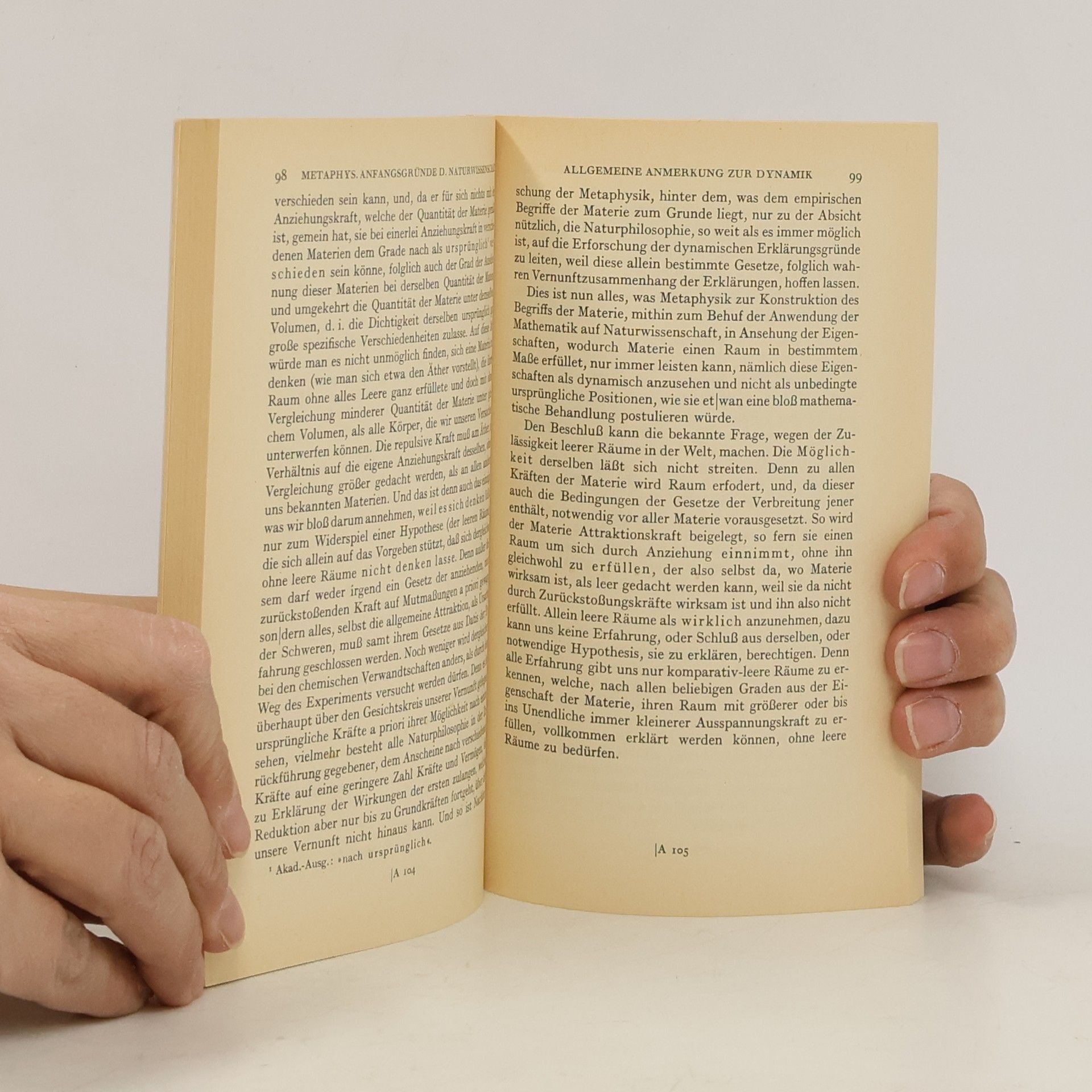 Aus dem Inhalt: Metaphysische Anfangsgründe der Naturwissenschaft: Vorrede Erstes Hauptstück: Metaphysische Anfangsgründe der Phoronomie Erklärung 1-5 / Grundsatz 1 / Lehrsatz 1 Zweites Hauptstück der Metaphysischen Anfangsgründe der Dynamik Erklärung 1-7 / Lehrsatz 1-8 / Allgemeiner Zusatz zur Dynamik / Allgemeine Anmerkung zur Dynamik Drittes Hauptstück: Metaphysische Anfangsgründe der Mechanik Erklärung 1 und 2 / Lehrsatz 1-4 / Allgemeine Anmerkung zur Mechanik Viertes Hauptstück: Metaphysische Anfangsgründe der Phänomenologie Erklärung / Lehrsatz 1-3 / Allgemeine Anmerkungen zur Phänomenologie Über den Gebrauch teleologischer Prinzipien in der Philosophie schovat popis