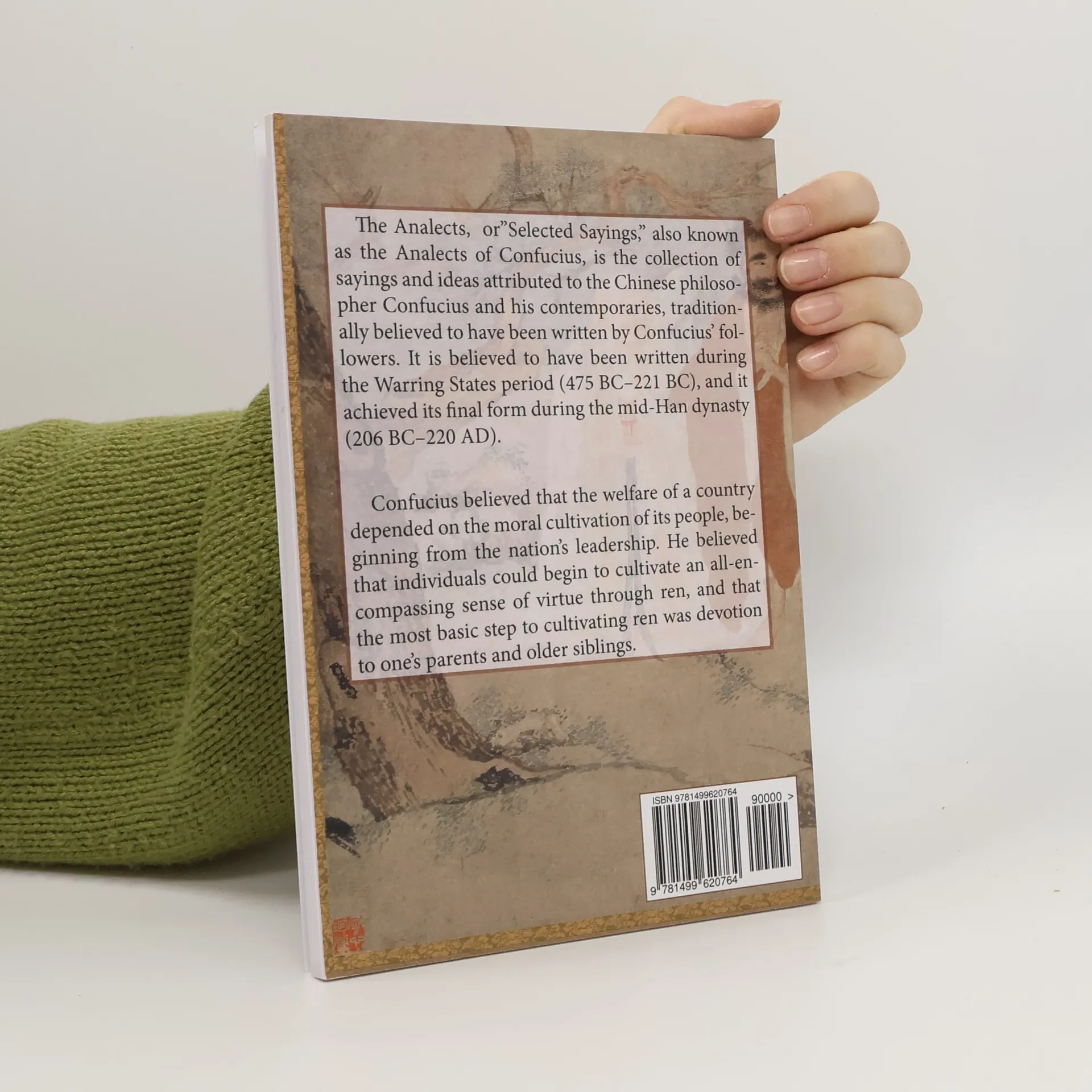 The Analects, or "Selected Sayings"), also known as the Analects of Confucius, is the collection of sayings and ideas attributed to the Chinese philosopher Confucius and his contemporaries, traditionally believed to have been written by Confucius' followers. It is believed to have been written during the Warring States period (475 BC–221 BC), and it achieved its final form during the mid-Han dynasty (206 BC–220 AD).Confucius believed that the welfare of a country depended on the moral cultivation of its people, beginning from the nation's leadership. He believed that individuals could begin to cultivate an all-encompassing sense of virtue through ren, and that the most basic step to cultivating ren was devotion to one's parents and older siblings.