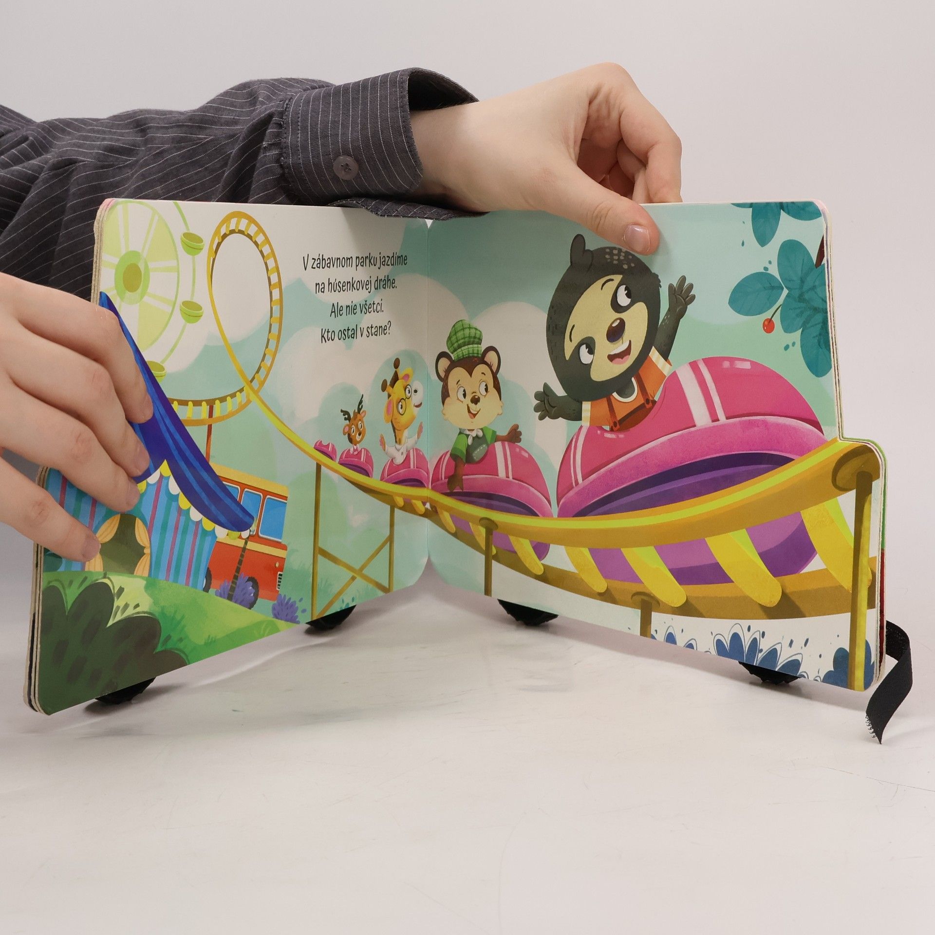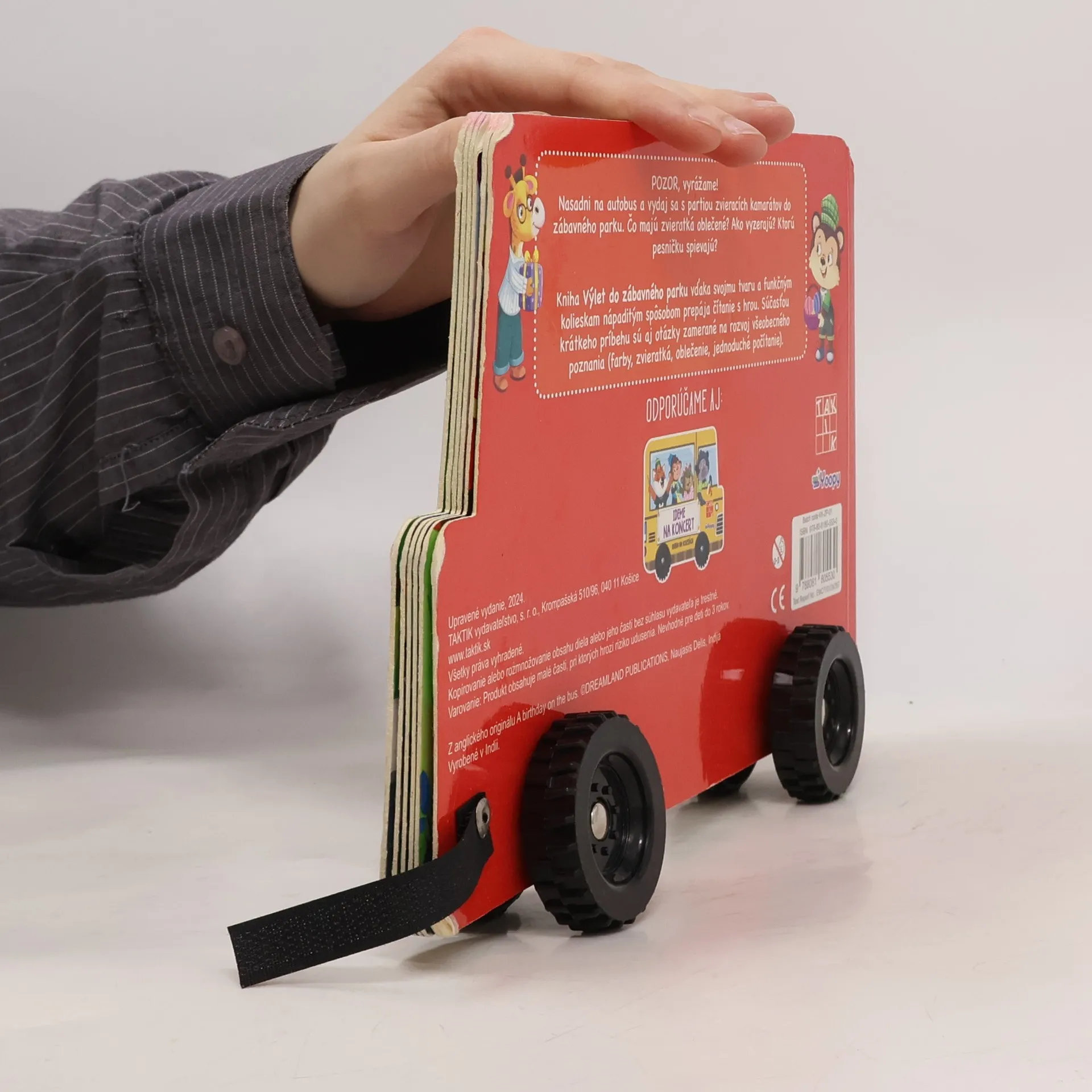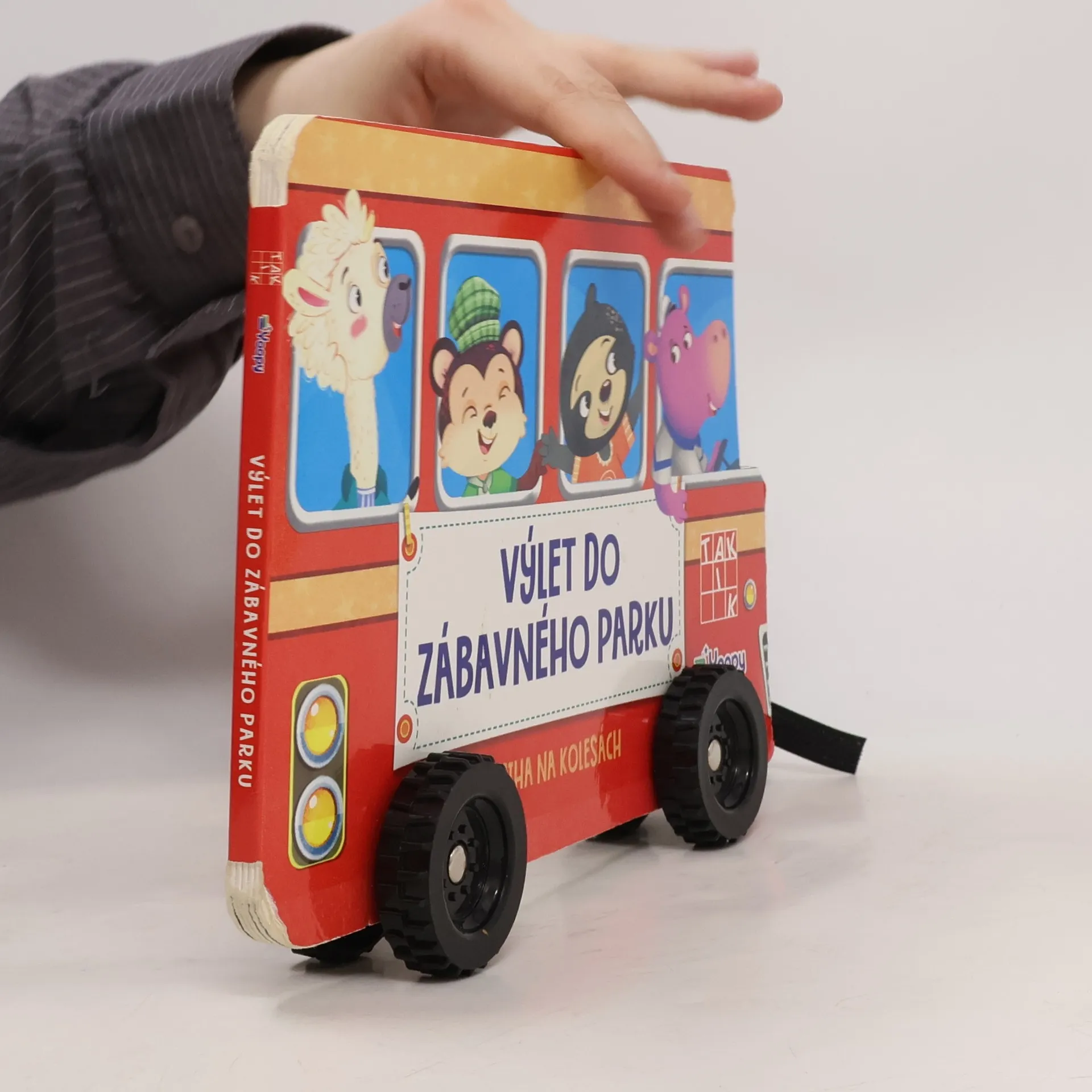 POZOR, vyrážame! Nasadni na autobus a vydaj sa s partiou zvieracích kamarátov do zábavného parku. Kniha Výlet do zábavného parku v tvare autíčka nápaditým spôsobom prepája čítanie s hrou. Súčasťou krátkeho príbehu sú aj otázky zamerané na rozvoj všeobecného poznania (farby, zvieratká, oblečenie, jednoduché počítanie). Kniha upúta otáčajúcimi sa kolieskami. Deti ju môžu používať nielen na čítanie, ale aj ako hračku. V edícii vyšla aj kniha Ideme na koncert.