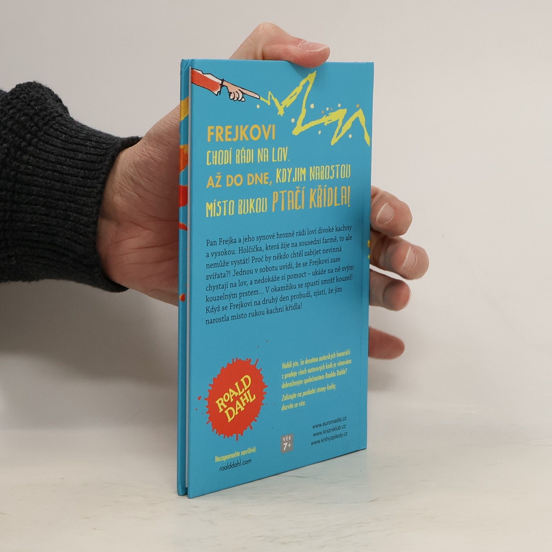(2. vydání) Pan Frejka a jeho synové hrozně rádi loví divoké kachny a vysokou. Holčička, která žije na sousední farmě, to ale nemůže vystát! Proč by někdo chtěl zabíjet nevinná zvířata?! Jednou v sobotu uvidí, že se Frejkovi zase chystají na lov, a nedokáže si pomoct – ukáže na ně svým kouzelným prstem... V okamžiku se spustí smršť kouzel! Když se Frejkovi na druhý den probudí, zjistí, že jim narostla místo rukou kachní křídla! Jak to vypadá, když jedna obyčejná člověčí rodinka bydlí v ptačím hnízdě, a kachní rodinka se přestěhuje do domečku? A co všechno budou muset Frejkovi změnit, aby se stali znovu lidmi? Kniha je určena dětem od 7 let.