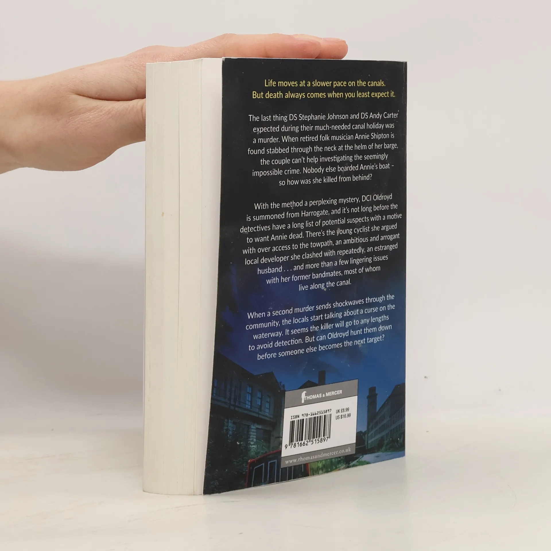 The last thing DS Stephanie Johnson and DS Andy Carter expected during their much-needed canal holiday was a murder. When retired folk musician Annie Shipton is found stabbed through the neck at the helm of her barge, the couple can't help investigating the seemingly impossible crime. Nobody else boarded Annie's boat - so how was she killed from behind? With the method a perplexing mystery, DCI Oldroyd is summoned from Harrogate, and it's not long before the detectives have a long list of potential suspects with a motive to want Annie dead. There's the young cyclist she argued with over access to the towpath, an ambitious and arrogant local developer she clashed with repeatedly, an estranged husband and more than a few lingering issues with her former bandmates, most of whom live along the canal.