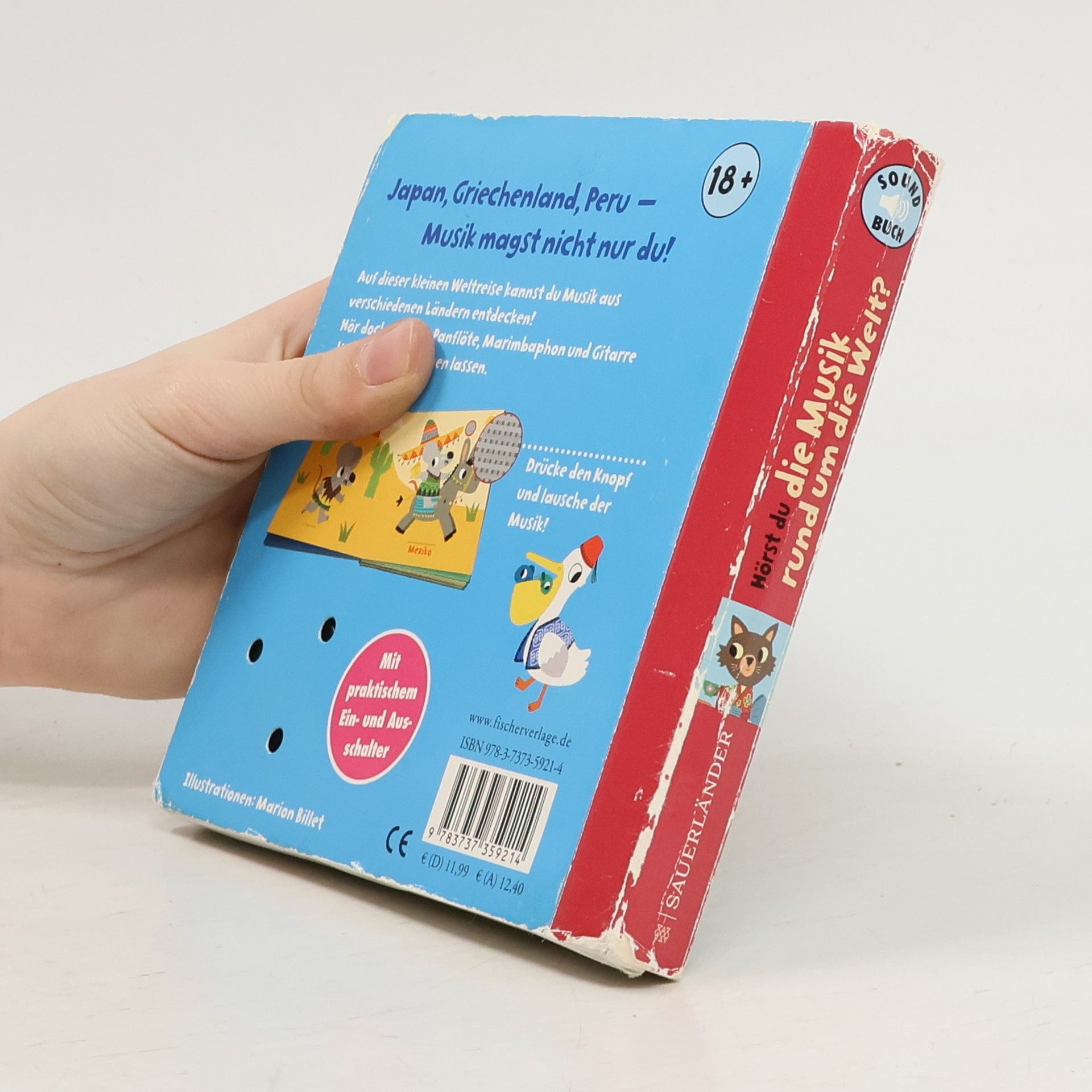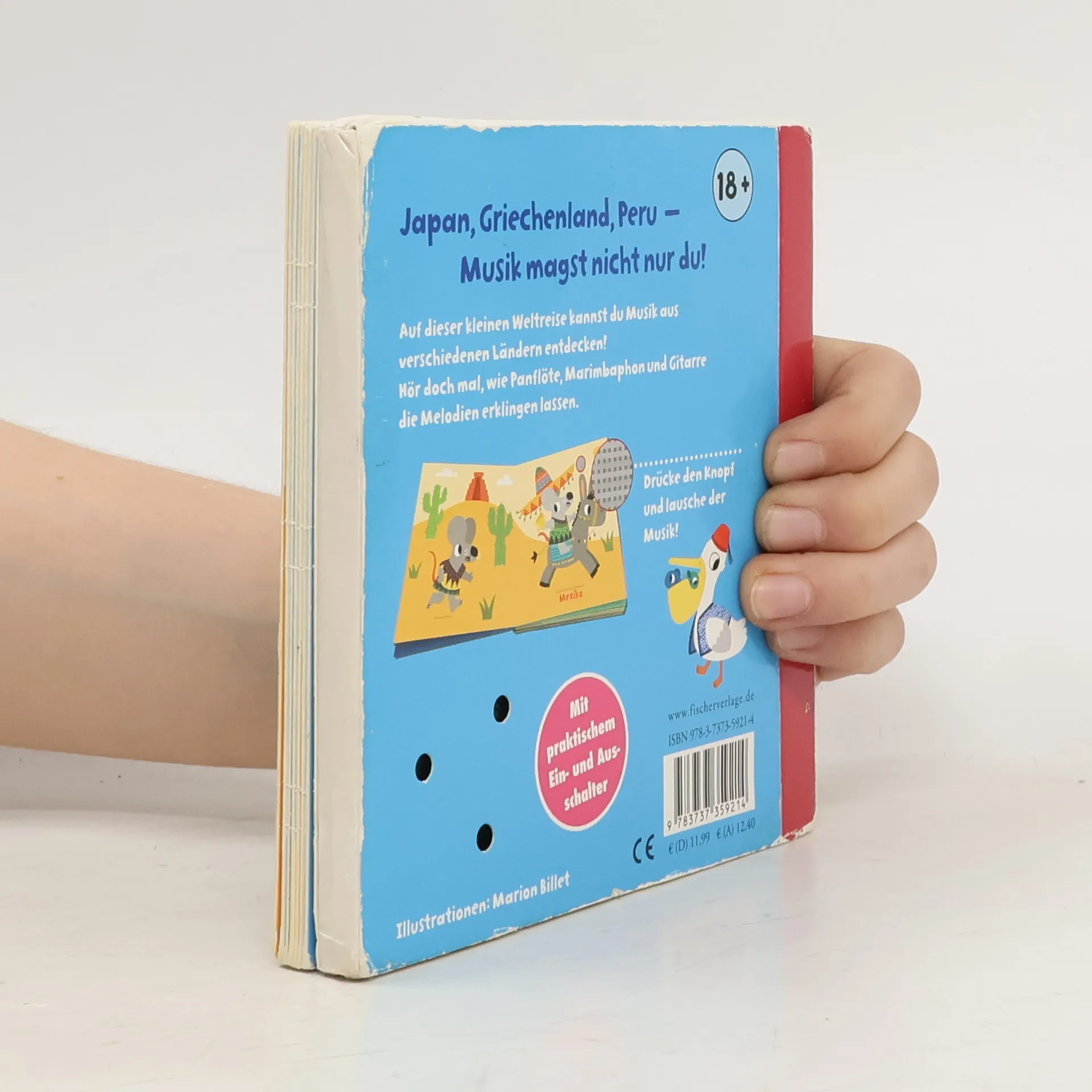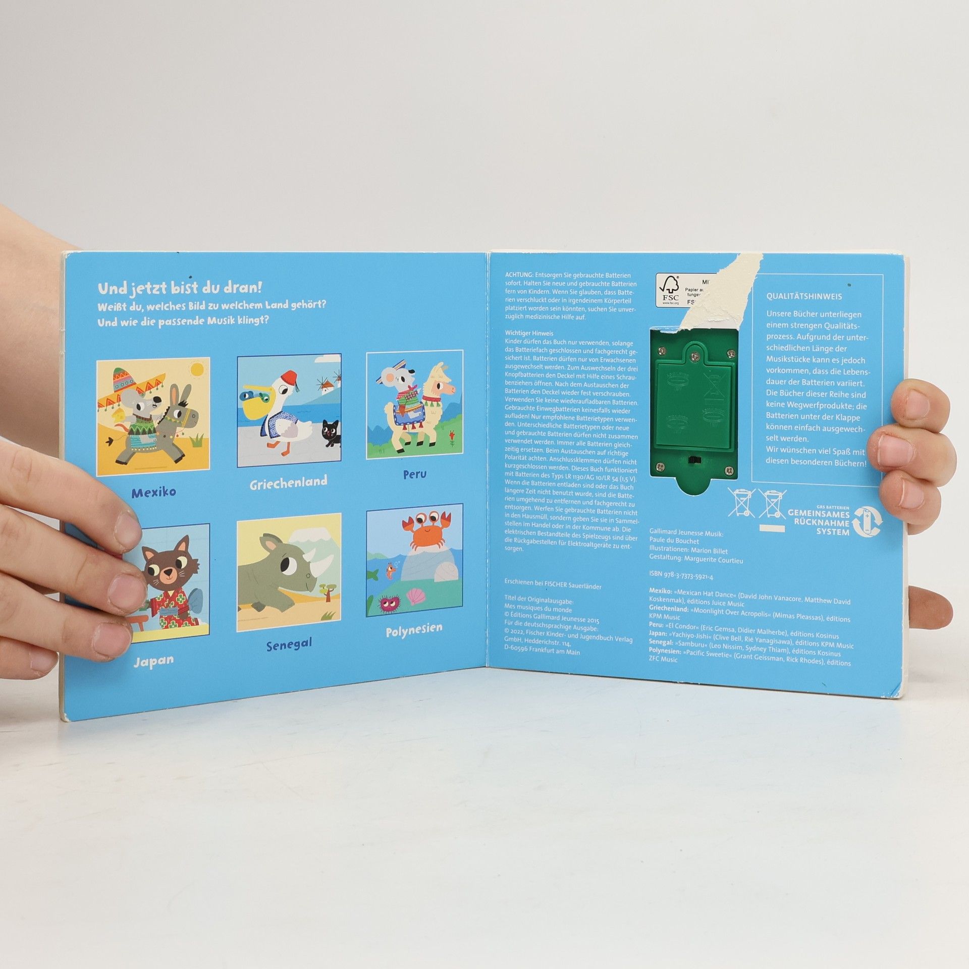 Hörspaß für Kinder ab 18 Monaten Kinder lieben Musik und sind besonders fasziniert von ungewöhnlichen Klängen. Hier können sie Melodien aus aller Welt lauschen. Der rhythmischen Tanzmusik aus Griechenland, den sanften Klängen aus Japan, der beschwingten Melodie aus Mexiko, der getragenen Panflöte aus Peru. Um den Musikstücken zu lauschen, können die Kinder die auf den Seiten integrierten Soundchips durch einfaches Berühren aktivieren und auch wieder stoppen. Mit praktischem Ein- und Ausschaltknopf auf der letzten Seite. QUALITÄTSHINWEIS Unsere Bücher unterliegen einem strengen Qualitätsprozess. Aufgrund der unterschiedlichen Länge der Musikstücke kann es jedoch vorkommen, dass die Lebensdauer der Batterien variiert. Die Bücher dieser Reihe sind keine Wegwerfprodukte; die Batterien unter der kleinen Klappe hinten im Buch können deshalb einfach ausgewechselt werden. Wir wünschen viel Spaß mit diesen besonderen Büchern!