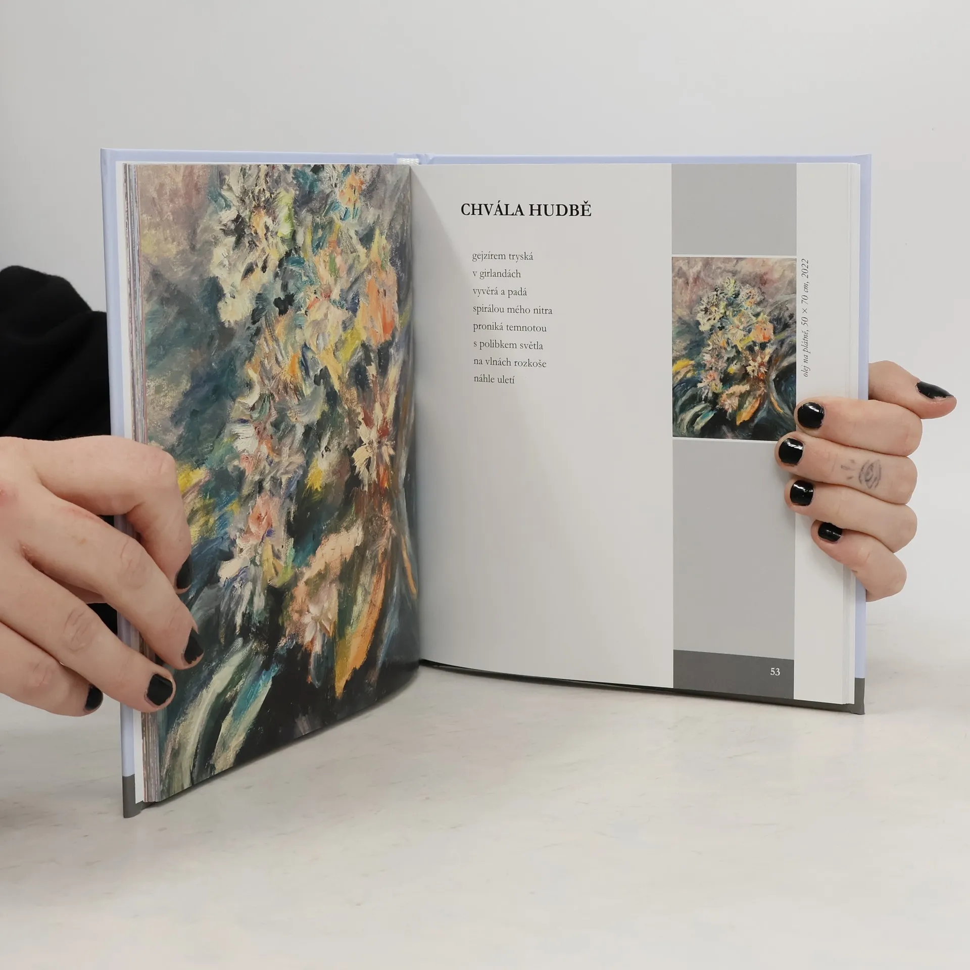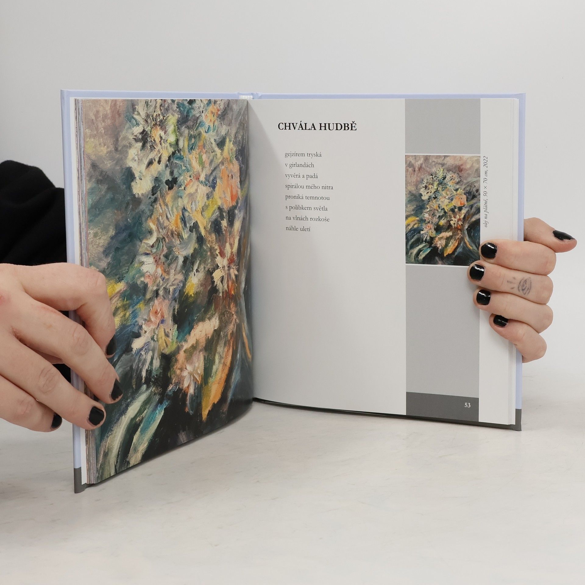 Básně této sbírky nás vtáhnou do romantické a tajuplné krajiny severních Čech, kde se ponoříme do rozsáhlých bukových lesů, chladných roklin i hlubokých a tichých údolí. Autorka nás také provede spletitými mezilidskými vztahy a dávno zapomenutými příběhy z mládí, dotýká se aktuálního dění ve společnosti, ale i problematikou člověka a přírody. Nedílnou součástí sbírky jsou autorčiny obrazy, které společně vnímáme jako intenzivní prolínání výtvarného vyjádření básně s básnickým pojetím obrazu.