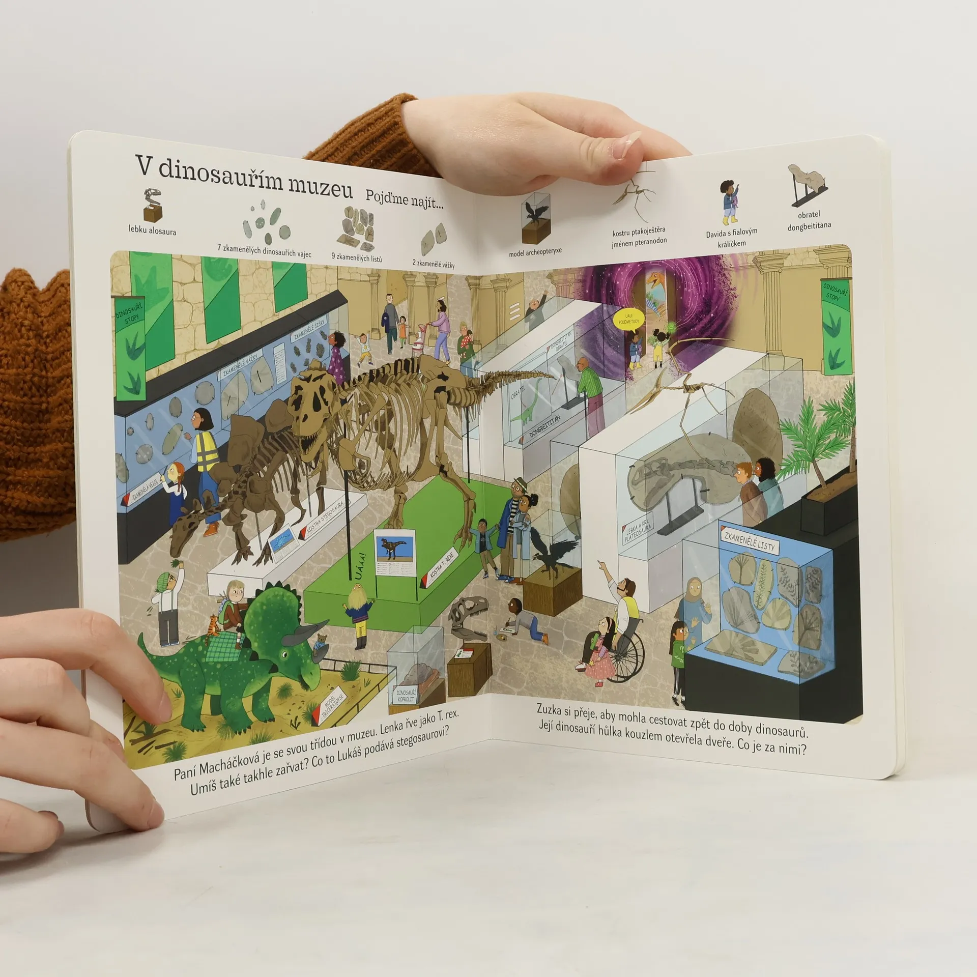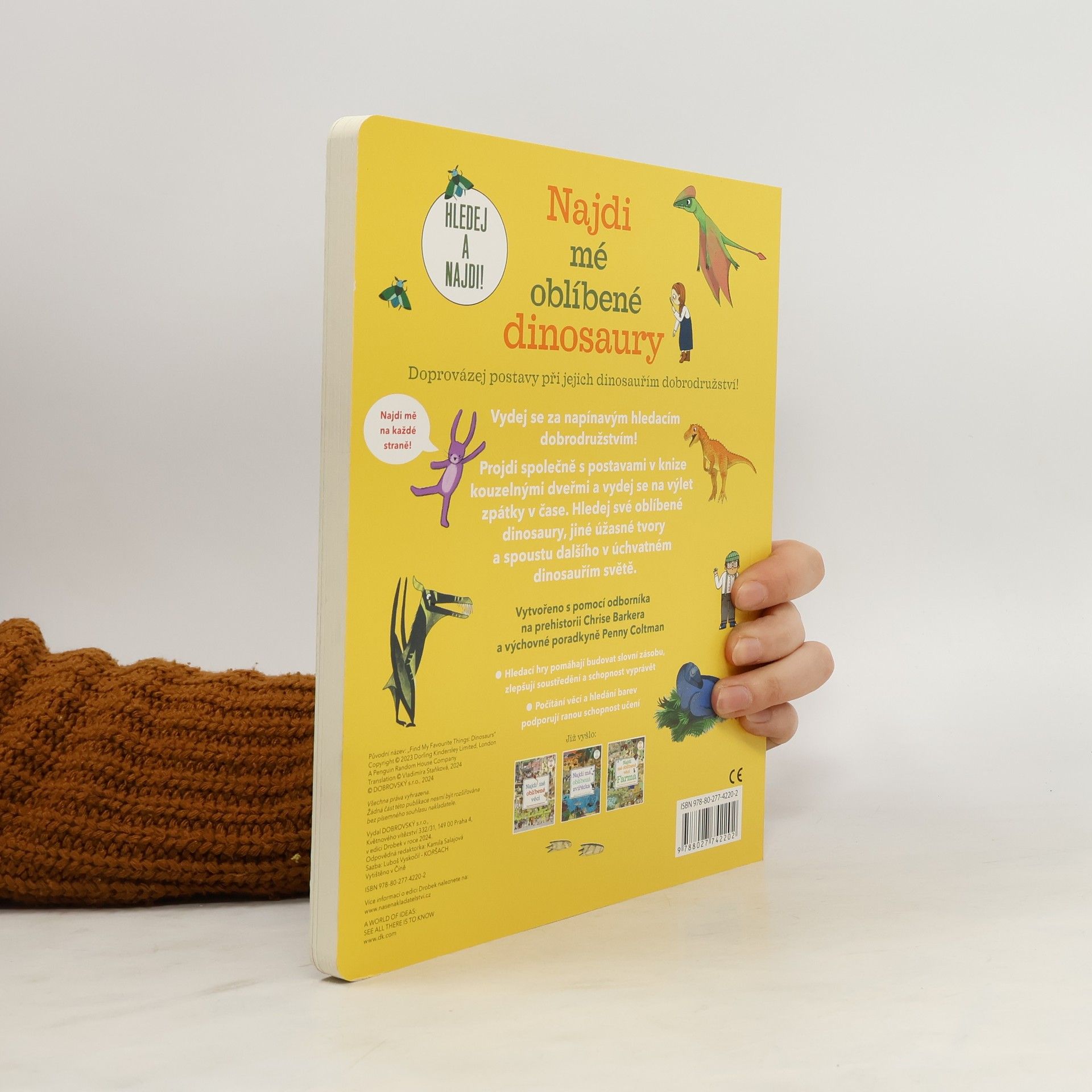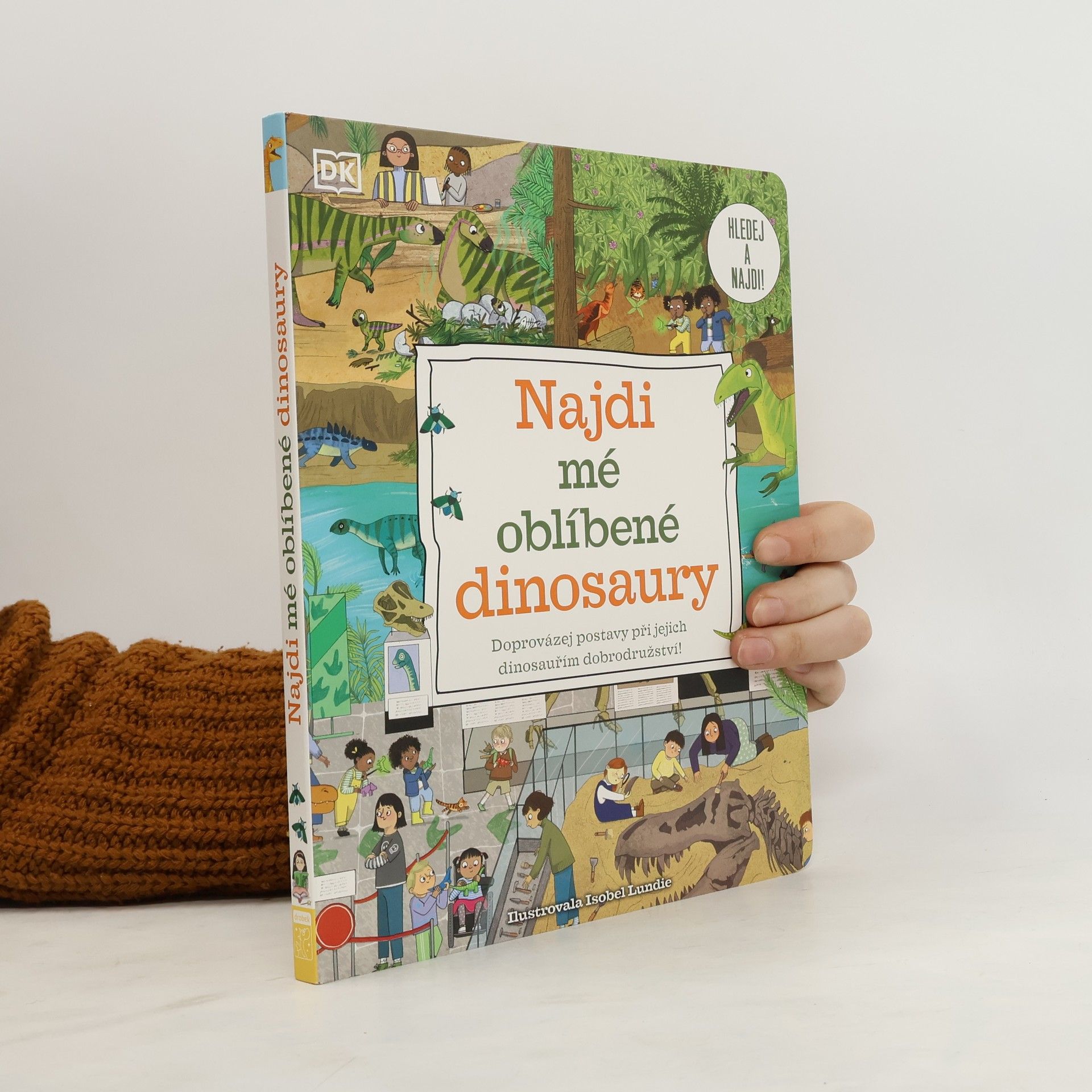 Vydejte se společně se svými dětmi za napínavým dobrodružstvím! Projděte s postavami v knize kouzelnými dveřmi a užijte si výlet zpátky v čase. Hledejte své oblíbené dinosaury, jiné úžasné tvory a spoustu dalšího v úchvatném, pestře ilustrovaném dinosauřím světě. Tato skvělá interaktivní kniha s pevnými stránkami je ideální pro předškoláky i zdatné čtenáře – ti všichni se v ní naučí rozeznávat postavy i hledat a počítat zajímavé předměty na obrázcích plných zábavných scén. Hledací hry pomáhají budovat slovní zásobu, zlepšují soustředění a schopnost vyprávět. Počítání věcí a hledání barev podporuje ranou schopnost učení. Děti mohou na jednotlivých stránkách pozorovat rozličné věci a tvory, ale také jednotlivé žáky. Následně se je naučí spočítat, pojmenovat a vymyslet jim příběh. Na každé straně jsou také drobné nápovědy, které podpoří všímavost, konverzační dovednosti a zvídavost. Kniha byla vytvořena ve spolupráci s odborníkem na prehistorii Chrisem Barkerem a výchovnou poradkyní Penny Coltman.