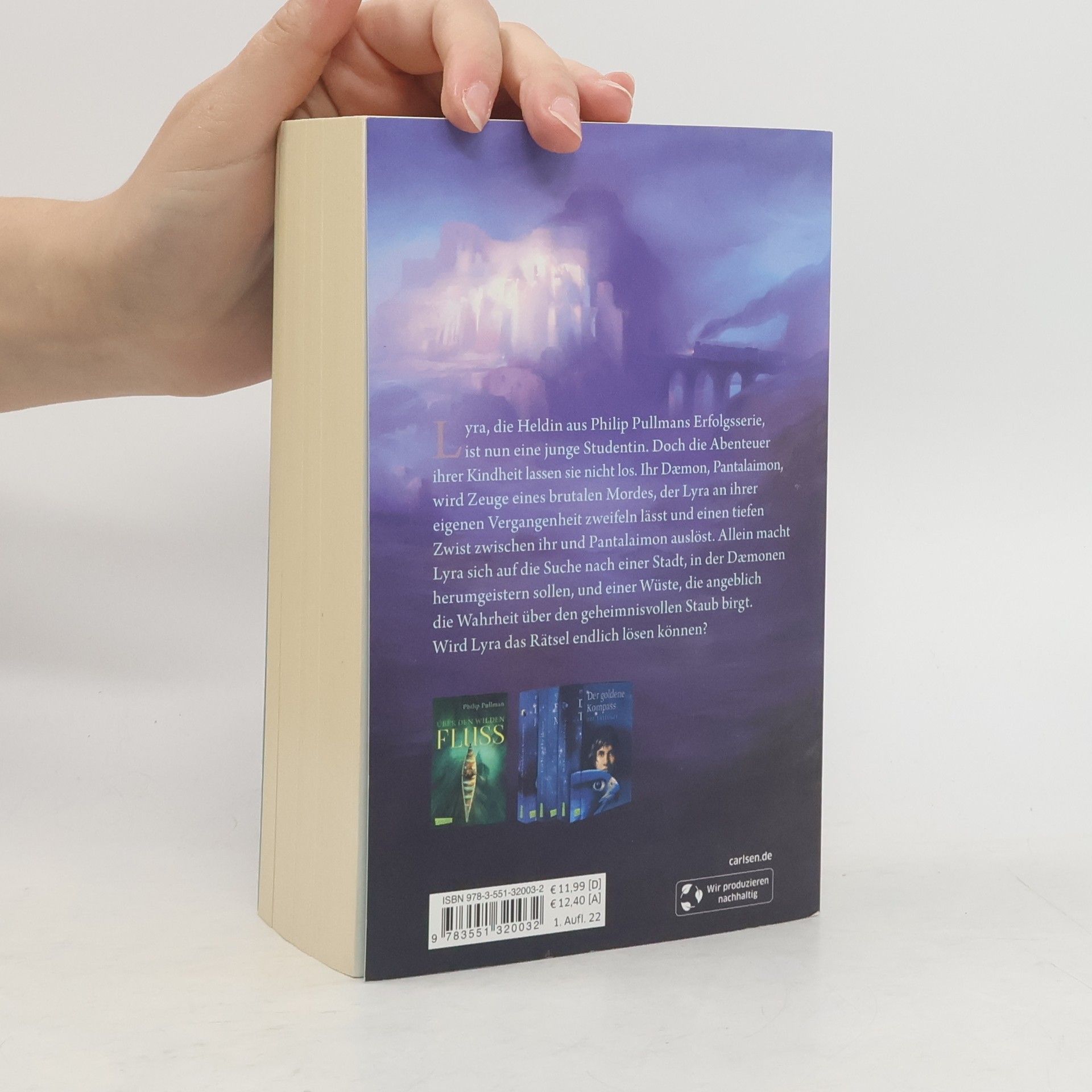 Endlich: der packende vierte Band der »His Dark Materials«-Serie als Taschenbuch! Lyra, die Heldin aus Philip Pullmans Erfolgsserie, ist nun eine junge Studentin. Doch die Abenteuer ihrer Kindheit lassen sie nicht los. Ihr Dæmon, Pantalaimon, wird Zeuge eines brutalen Mordes, der Lyra an ihrer eigenen Vergangenheit zweifeln lässt und einen tiefen Zwist zwischen ihr und Pantalaimon auslöst. Allein macht Lyra sich auf die Suche nach einer Stadt, in der Dæmonen herumgeistern sollen, und einer Wüste, die angeblich die Wahrheit über den geheimnisvollen Staub birgt. Wird Lyra das Rätsel endlich lösen können? Alle Bände der unvergleichlichen Fantasy-Serie »His Dark Materials«: Über den wilden Fluss (Band 0) Der Goldene Kompass (Band 1) Das Magische Messer (Band 2) Das Bernstein-Teleskop (Band 3) Ans andere Ende der Welt (Band 4)