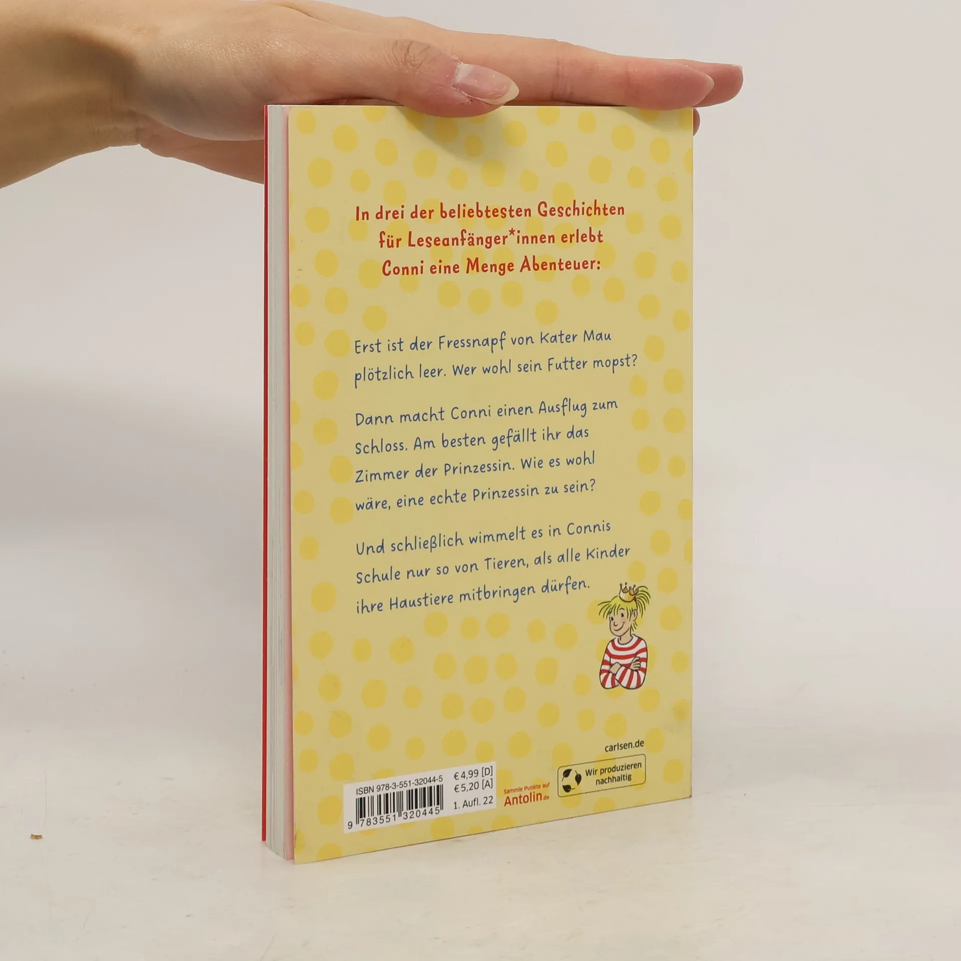 Drei spannende Conni-Erstlesegeschichten in einem Band! Erst ist Kater Maus Fressnapf plötzlich leer. Wer da wohl sein Futter mopst? Dann macht Conni einen Ausflug zum Schloss. Am besten gefällt ihr das Zimmer der Prinzessin. Wie es wohl wäre, eine echte Prinzessin zu sein? Und schließlich wimmelt es in Connis Schule nur so von Tieren, als alle Kinder ihre Haustiere mitbringen dürfen. Dreifacher Conni-Spaß Perfektes Geschenk zur Einschulung Kurze Sätze, einfache Worte