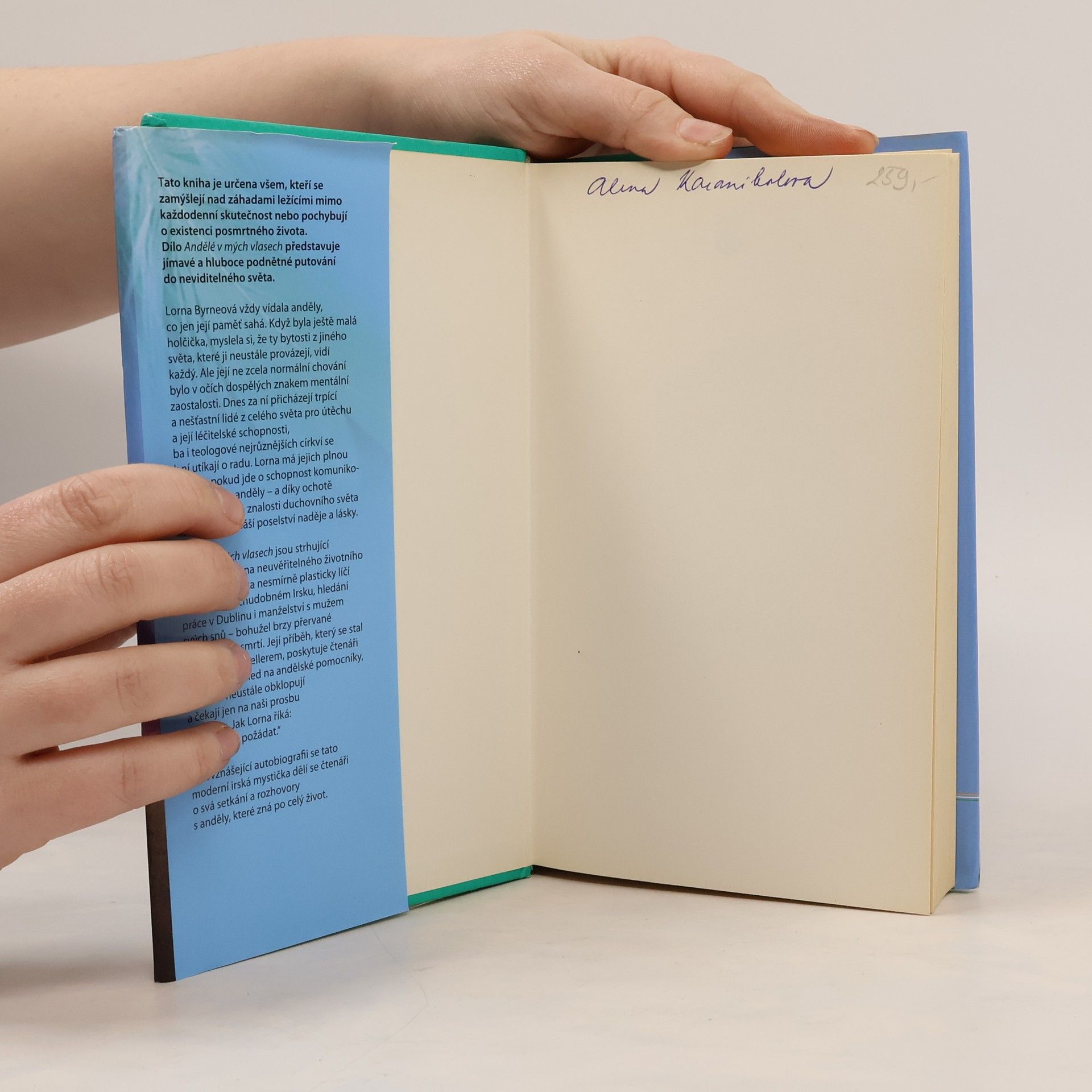 Podtitul: Skutečný příběh moderní irské mystičky. Lorna Byrne, moderní irská mystička, od nejútlejšího věku vídala anděly a hovořila s nimi. Nyní poklidně žije na irském venkově. V knize Andělé v mých vlasech, která je strhující kronikou jejího neuvěřitelného životního příběhu, poprvé otevřeně hovoří o svých zážitcích. Autorka živě líčí své dětství v Irsku, hledání práce v Dublinu i manželství s mužem svých snů. Lornin příběh se okamžitě stal bestsellerem. Poskytuje čtenáři jedinečný pohled na andělské pomocníky, kteří nás neustále obklopují a pouze čekají na naši prosbu o pomoc. Jak sama Lorna říká: Stačí jen je požádat.