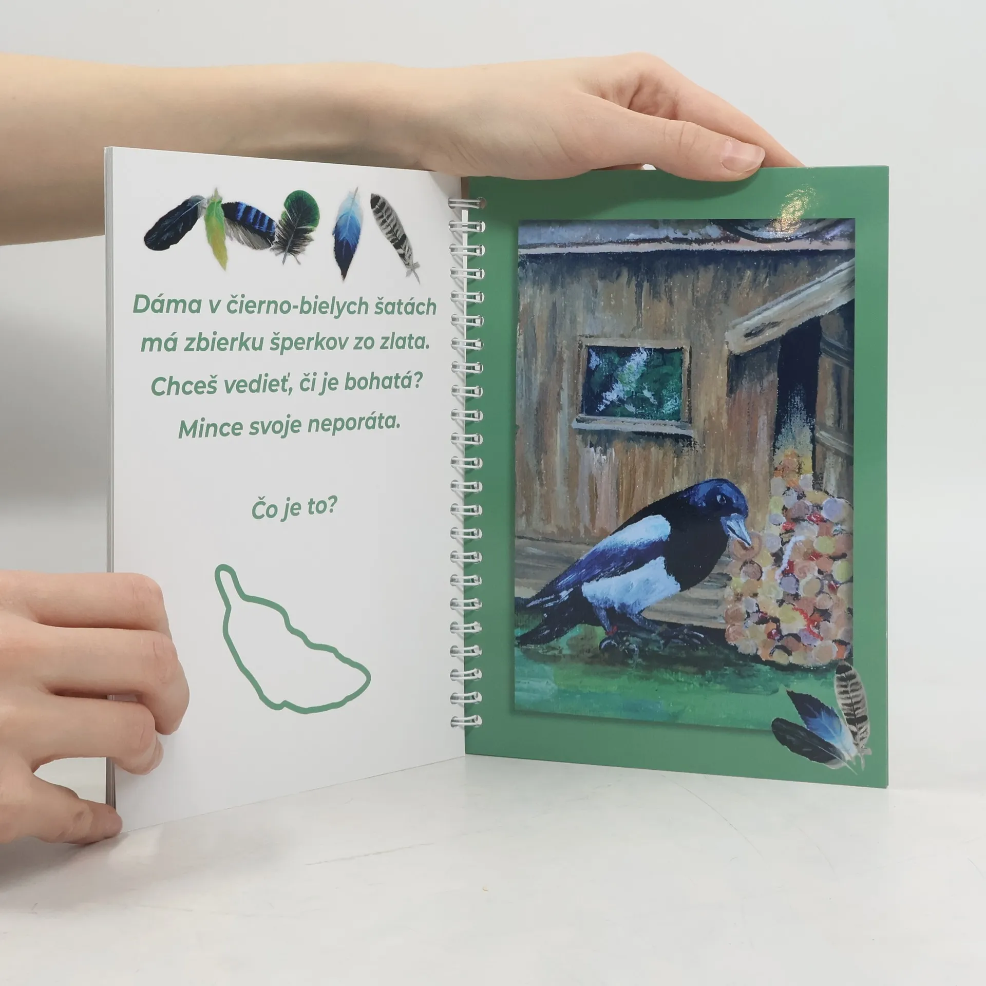 Kniha zavedie deti do nádherného sveta skrytého v korunách i v tôni stromov a prostredníctvom hádaniek a krásnych ilustrácií im predstaví jeho obyvateľov. Riešením hádaniek si deti môžu hravou formou overiť svoje vedomosti o vtákoch. Pri práci s hádankami im pomôžu nálepky vtáčích pierok, ktoré sú kľúčom k správnym odpovediam. Nálepky vtáčích pierok sú súčasťou knihy.