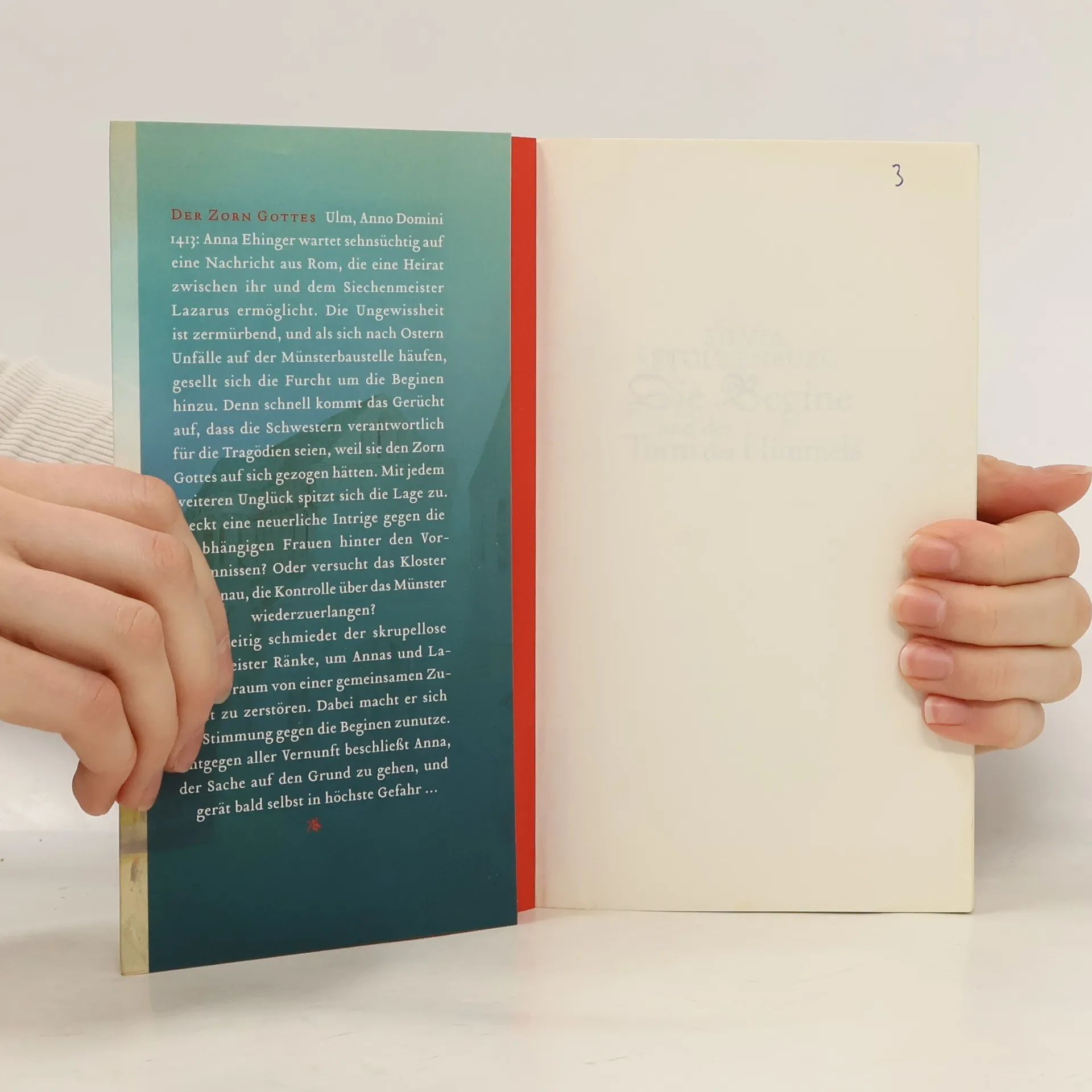 Ulm im Jahre 1413. Die Begine Anna Ehinger wähnt sich kurz vor der erträumten Zukunft mit Siechenmeister Lazarus, da stürzt auf der Münsterbaustelle ein Steinmetz von einem Gerüst und erliegt im Spital seinen Verletzungen. Das Unglück ist der Auftakt zu einer Serie von Unfällen, die den Bau des umstrittenen Münsters heimsuchen. Die Beginensammlung wird zum Sündenbock, sie soll den Zorn Gottes über die Stadt gebracht haben. Anna, die um die Beginen fürchtet, beschließt, der Sache auf den Grund zu gehen, und gerät bald selbst in höchste Gefahr …
