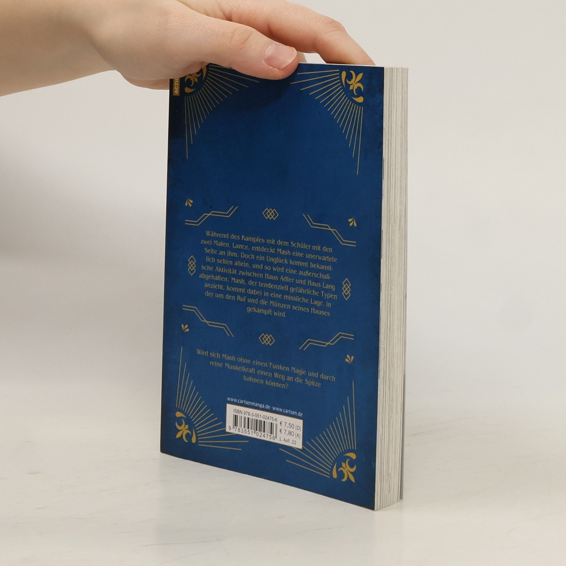 "Während des Kampfes mit dem Schüler mit den zwei Malen, Lance, entdeckt Mash eine unerwartete Seite an ihm. Doch ein Unglück kommt bekanntlich selten allein, und so wird eine außerschulische Aktivität zwischen Haus Adler und Haus Lang abgehalten. Mash, der tendenziell gefährliche Typen anzieht, kommt dabei in eine missliche Lage, in der um den Ruf und die Münzen seines Hauses gekämpft wird." (www.carlsen.de)