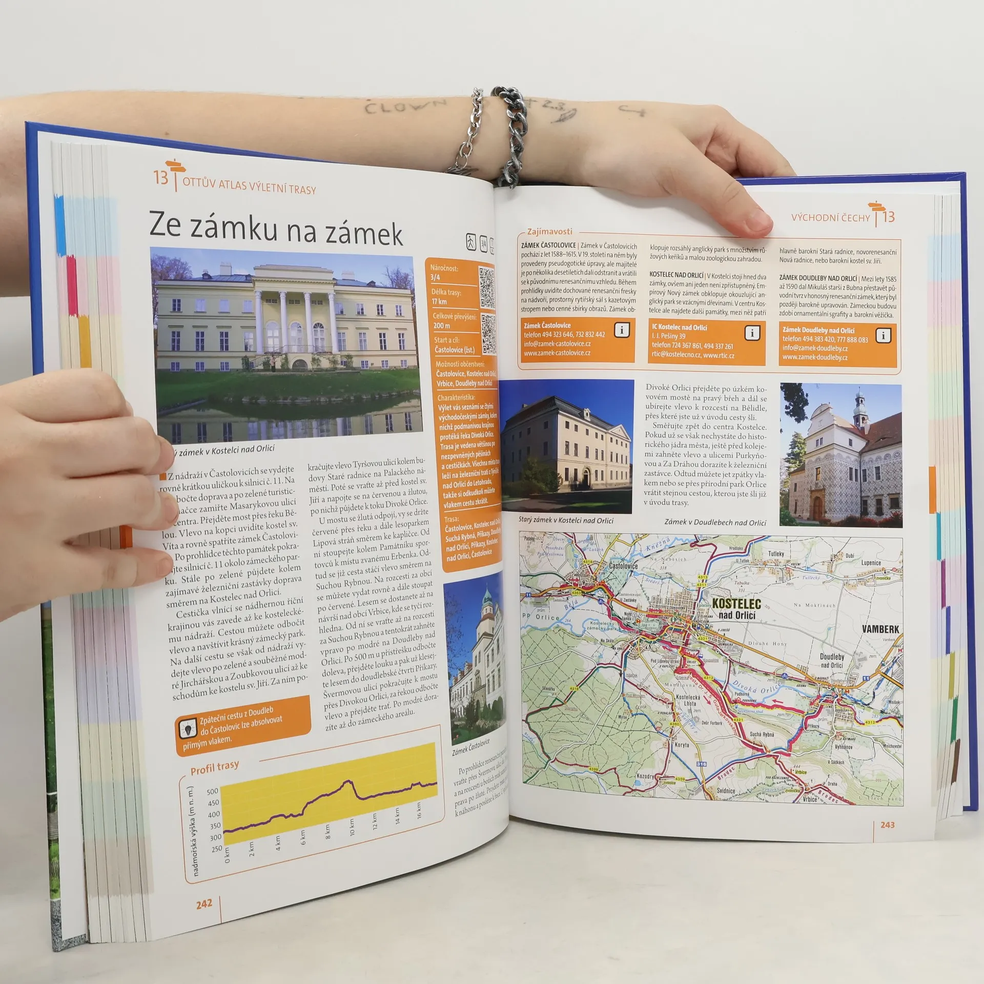 Unikátní vydání turistického atlasu se zaměřuje na nejkrásnější místa Čech, Moravy a Slezska, včetně pohraničí a okolních zemí. Průvodce je rozdělen do 12 oblastí, přičemž každá nabízí více než 20 atraktivních pěších a cyklistických výletů s popisem významných přírodních a historických památek. Trasy začínají a končí v místech s dobrou dostupností hromadné dopravy a občerstvení. Výletní trasy jsou přehledně označeny a rozděleny podle náročnosti do čtyř stupňů, přičemž u každé je graf s celkovým převýšením, což umožňuje turistům vybrat si trasu odpovídající jejich schopnostem. Každá trasa obsahuje stručnou charakteristiku a popis povrchu cesty, u cyklistických tras je doporučen vhodný typ kola. Na konci každé trasy najdete informace o památkách a zajímavostech včetně užitečných kontaktů. Součástí výletů je také tip na úpravu trasy podle vlastních potřeb. Podrobná mapka zobrazuje příslušný úsek s barevně zvýrazněnou trasou, a přiložené fotografie zachycují atmosféru kraje. Kniha obsahuje QR kódy, které umožňují načíst údaje o trasách do navigace nebo chytrého telefonu. Stačí stáhnout gpx soubor a nechat se vést na svých výletech.