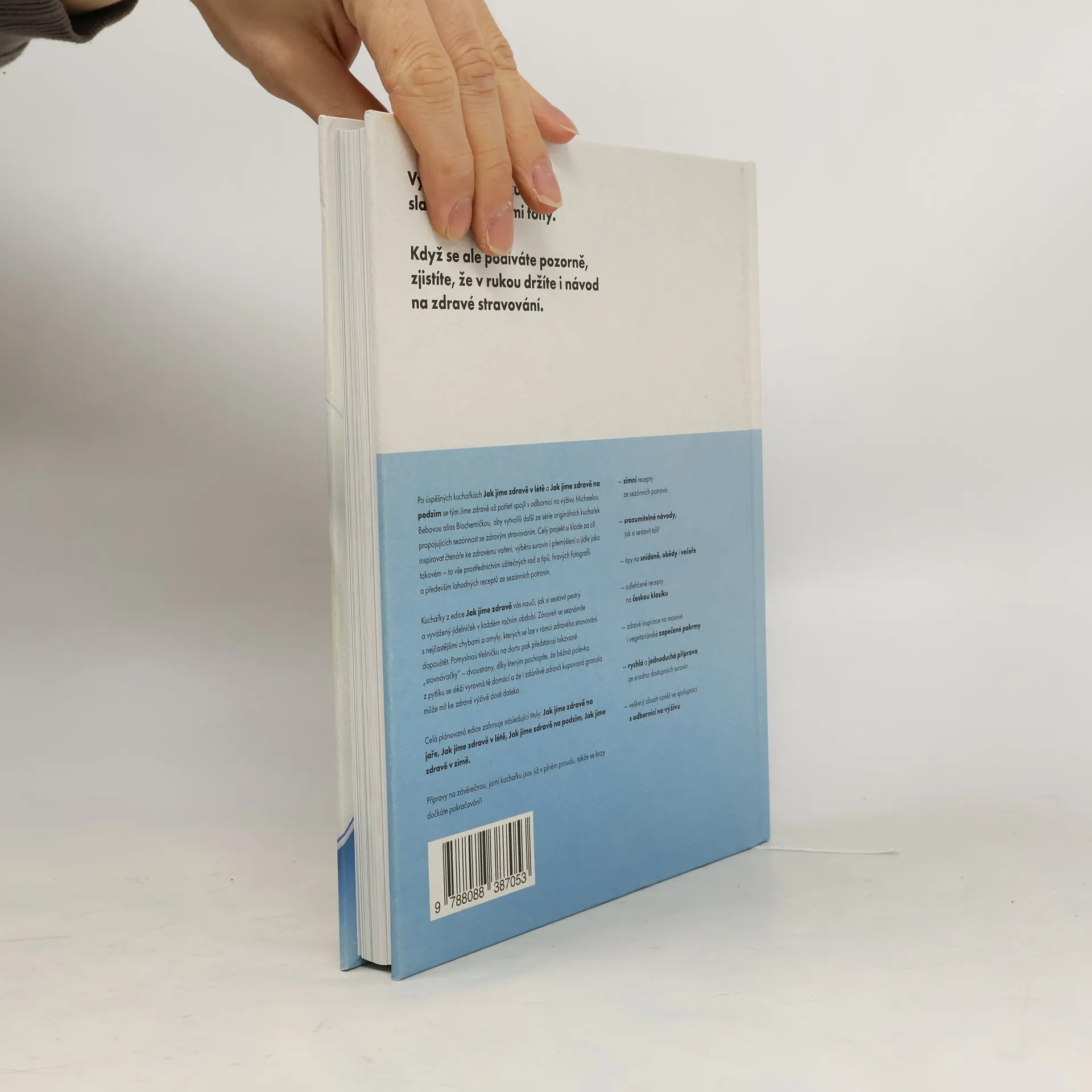 Po úspěšných kuchařkách Jak jíme zdravě v létě a Jak jíme zdravě na podzim se tým Jíme zdravě opět spojil s odbornicí na výživu Michaelou Bebovou, aby vytvořili další originální kuchařku propojující sezónnost se zdravým stravováním. Kniha vám pomůže sestavit jídelníček pro celou rodinu, zajišťující pestrou a vyváženou stravu. Obsahuje také nejčastější chyby, kterých se dopouštíme při vaření. Zajímavé „srovnávačky“ ukazují rozdíly mezi běžnými polévkami z pytlíku a domácími variantami, stejně jako to, jak mohou být některé zakoupené granoly daleko od zdravé výživy. Kniha nabízí více než 90 sezónních receptů a je rozdělena do tří kapitol: „Snídaně“, „Hlavní jídla“ a „Kvašení a fermentace“. Autoři se zaměřili na křupavé granoly, zapečené ovesné kaše, obložené chleby a krémové polévky, které můžete jíst od rána do večera. Velká pozornost je věnována zapečeným receptům z jednoho hrnce a klasické české kuchyni v odlehčené podobě. Během mrazivých večerů můžete objevovat tajemství výroby domácího zelí, kimči, vodního kefíru či kváskového chleba. Názvy jako casserole, hash nebo suflé vás možná překvapí, ale nebojte se – jsou to jen variace na známá jídla, která obohatí vaše kulinářské zážitky.
