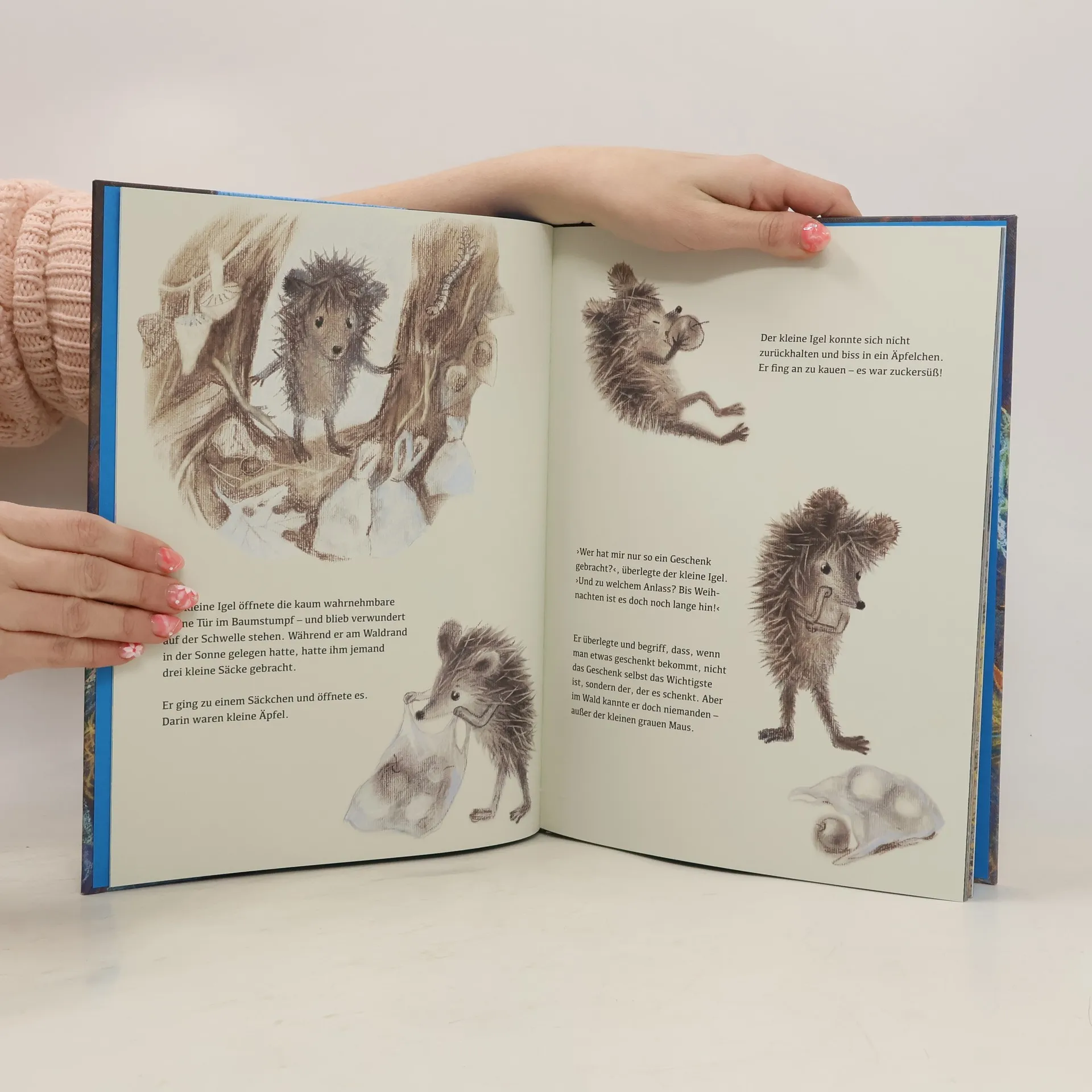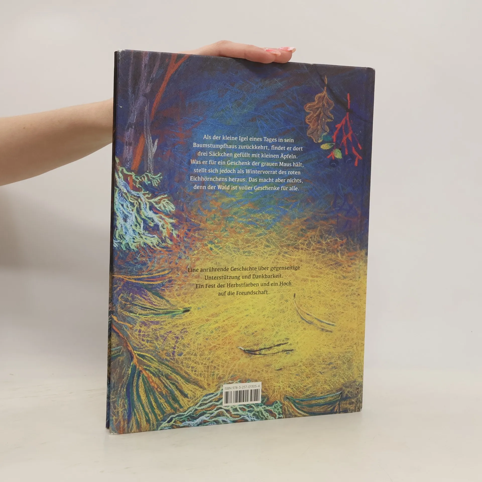 "Der kleine Igel ist zurück! Im Herbst sonnt er sich gern auf einem Hügel und beobachtet die Menschen im Dorf. Als er in sein Baumstumpfhaus zurückkehrt, findet er dort drei Säckchen gefüllt mit kleinen Äpfeln. Was er für ein Geschenk der grauen Maus hält, stellt sich bald als Wintervorrat des roten Eichhörnchens heraus. Das macht aber nichts, denn der Wald ist voller Geschenke für alle." (www.buchhandel.de)