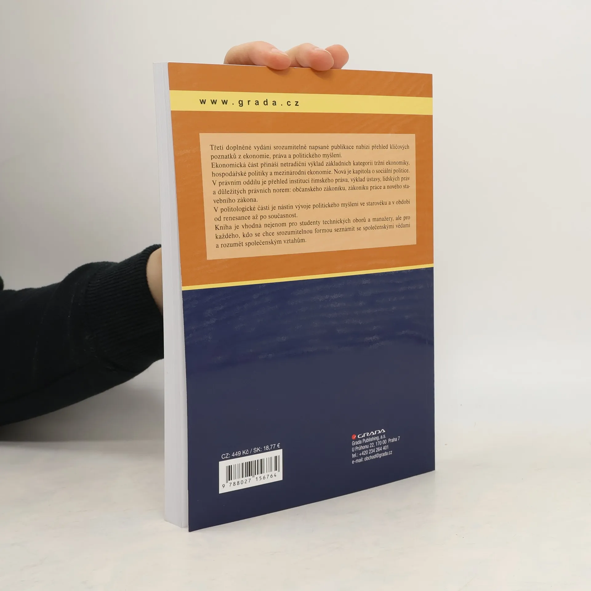 Na trhu ojedinělá publikace, vytvořená především pro exaktně uvažující techniky, přibližuje podstatu a souvislosti tří důležitých společenskovědních oborů: ekonomie, práva a politologie. Nové vydání je kompletně aktualizováno a doplněno kupříkladu o problematiku tržních struktur, informace o brexitu a o nové kapitoly věnované stavebnímu zákonu a politickému myšlení starověku. V ekonomické části kniha poutavým a netradičním způsobem vysvětluje základní kategorie tržní ekonomiky, poukazuje na odlišnosti v mikroekonomickém a makroekonomickém pohledu na hospodářské jevy, objasňuje podstatu a možnosti realizace účinné hospodářské politiky a podává přehledný výklad základních pojmů mezinárodní ekonomie. Teorie je efektivně kombinována s praktickými příklady a grafy. V kapitolách věnovaných právu je stručný přehled historického vývoje práva od dob antiky doplněn fundovaným výkladem ústavy, lidských práv a zákoníku práce. Velká pozornost je věnována vybraným ustanovením občanského zákoníku a stavebnímu zákonu.