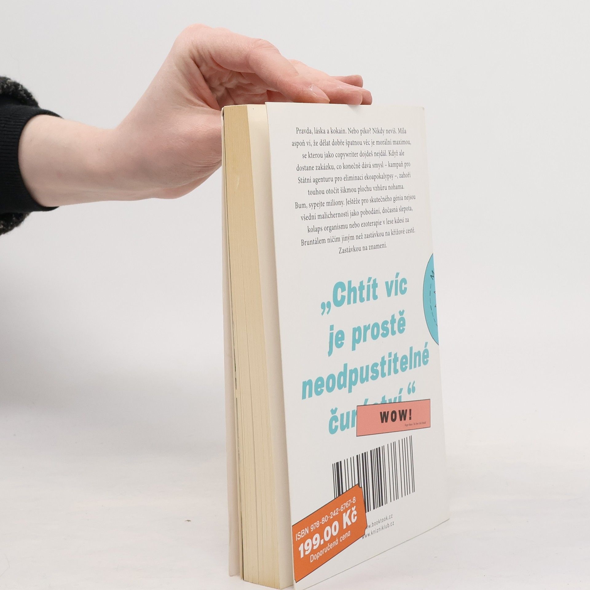 Pravda, láska a kokain. Nebo piko? Nikdy nevíš. Míla aspoň ví, že dělat dobře špatnou věc je morální maximou, se kterou jako copywriter dojdeš nejdál. Když ale dostane zakázku, co konečně dává smysl – kampaň pro Státní agenturu pro eliminaci ekoapokalypsy –, zahoří touhou otočit šikmou plochu vzhůru nohama. Bum, sypejte miliony. Ještěže pro skutečného génia nejsou všední malichernosti jako pobodání, dočasná slepota, kolaps organismu nebo esoterapie v lese kdesi za Bruntálem ničím jiným než zastávkou na křížové cestě. Zastávkou na znamení.