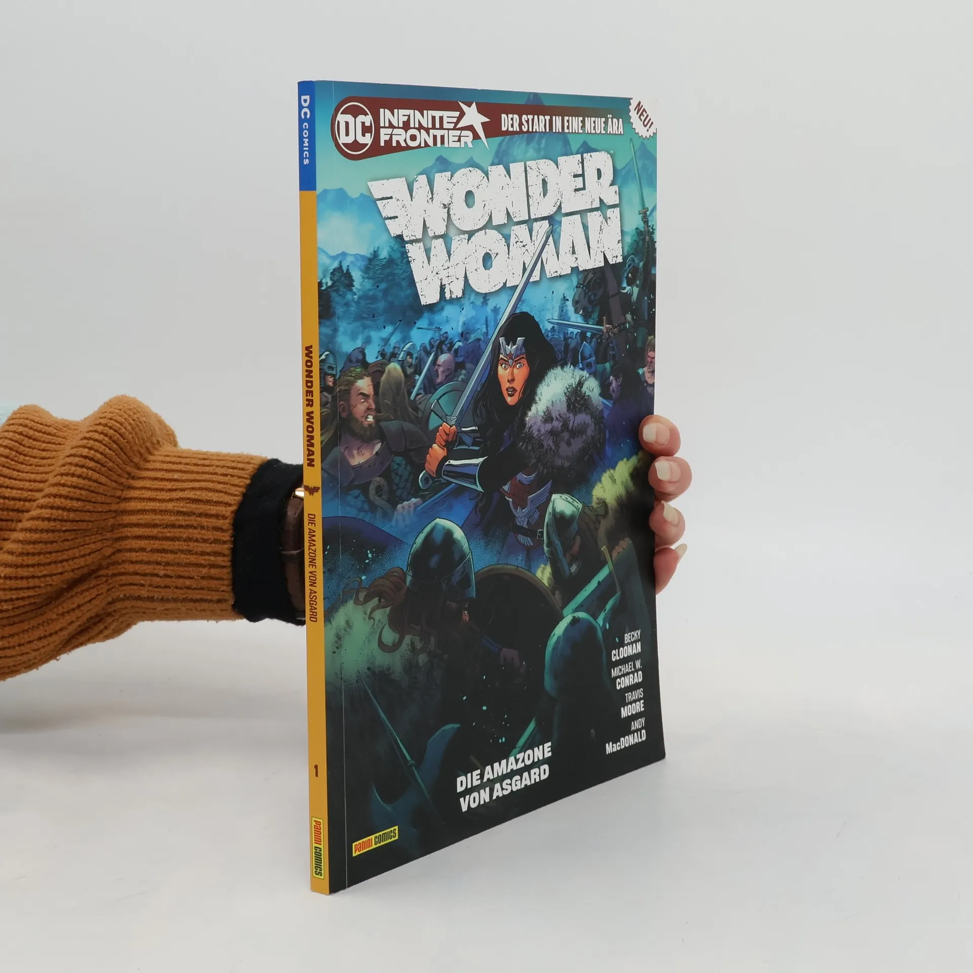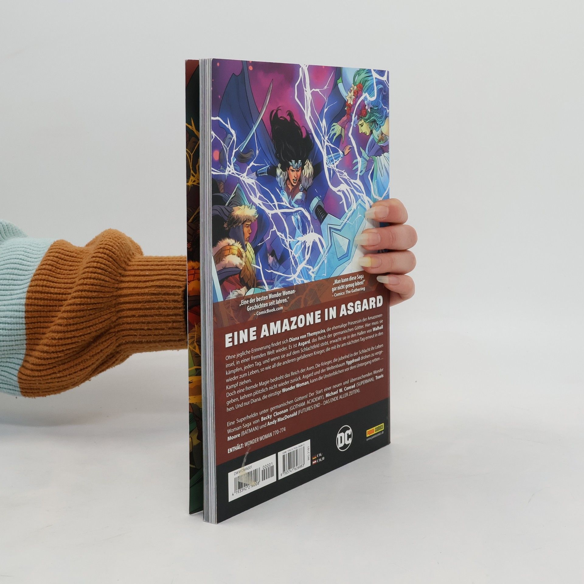 AMAZONE IN ASGARD Ohne jegliche Erinnerung findet sich Diana von Themyscira, die ehemalige Prinzessin der Amazoneninsel, in einer fremden Welt wieder. Es ist Asgard, das Reich der germanischen Götter. Hier muss sie kämpfen, jeden Tag, und wenn sie auf dem Schlachtfeld stirbt, erwacht sie in den Hallen von Walhall wieder zum Leben, so wie all die anderen gefallenen Krieger, die mit ihr am nächsten Tag erneut in den Kampf ziehen. Doch eine fremde Magie bedroht das Reich der Asen. Die Krieger, die jubelnd in der Schlacht ihr Leben geben, kehren plötzlich nicht wieder zurück. Asgard und der Weltenbaum Yggdrasil drohen zu vergehen. Und nur Diana, die einstige Wonder Woman, kann die Unsterblichen vor dem Untergang retten … Eine Superheldin unter germanischen Göttern! Der Start einer neuen und überraschenden Wonder Woman-Saga von Becky Cloonan (GOTHAM ACADEMY), Michael W. Conrad (SUPERMAN), Travis Moore (BATMAN) und Andy MacDonald (FUTURES END – DAS ENDE ALLER ZEITEN). ENTHÄLT: WONDER WOMAN 770–774