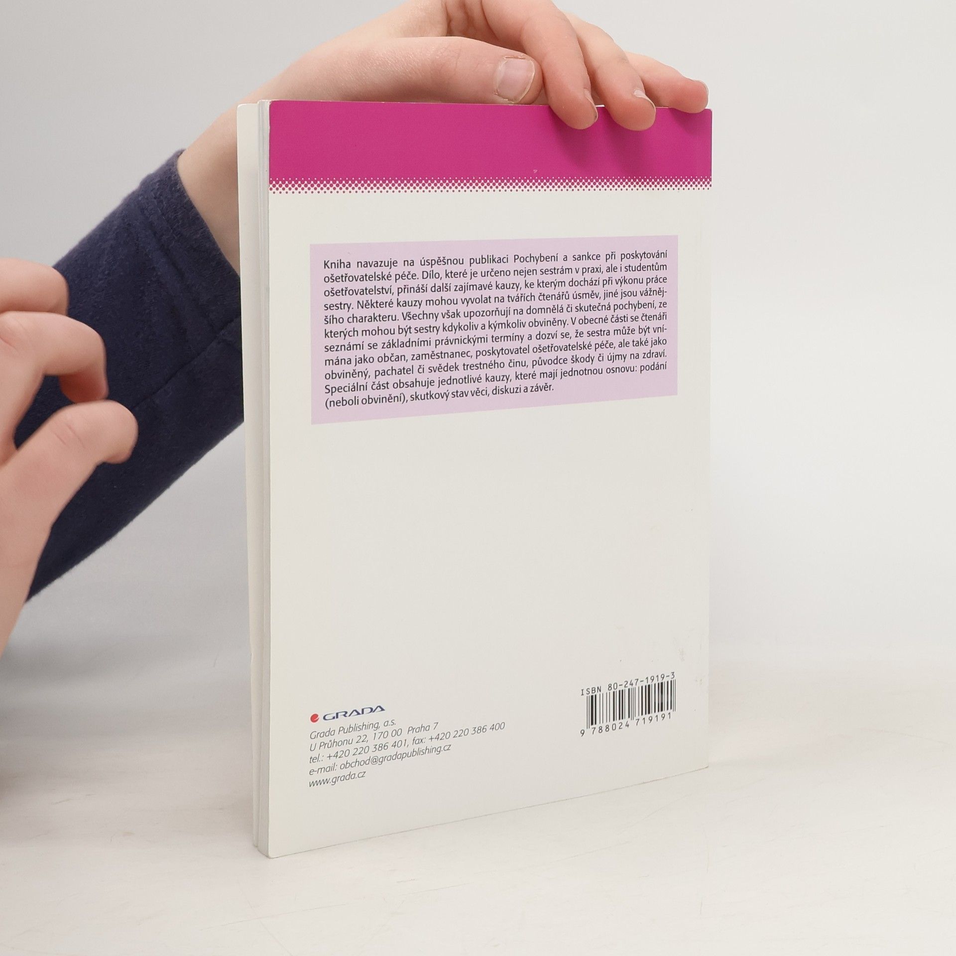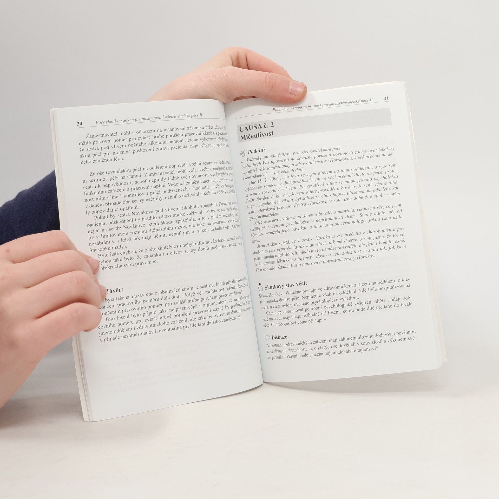 Další kniha z pera známého autora navazuje na úspěšnou publikaci Pochybení a sankce při poskytování ošetřovatelské péče. Dílo, které je určeno nejen sestrám v praxi, ale i studentům ošetřovatelství, přináší další zajímavé kauzy, ke kterým dochází při výkonu práce sestry. Některé kauzy mohou vyvolat na tvářích čtenářů úsměv, jiné jsou vážnějšího charakteru. Všechny však upozorňují na domnělá či skutečná pochybení, ze kterých mohou být sestry kdykoliv a kýmkoliv obviněny. V obecné části se čtenáři seznámí se základními právnickými termíny a dozví se, že sestra může být vnímána jako občan, zaměstnanec, poskytovatel ošetřovatelské péče, ale také jako obviněný, pachatel či svědek trestného činu, původce škody či újmy na zdraví. Speciální část obsahuje jednotlivé kauzy, které mají jednotnou osnovu: podání (neboli obvinění), skutkový stav věci, diskusi a závěr.
