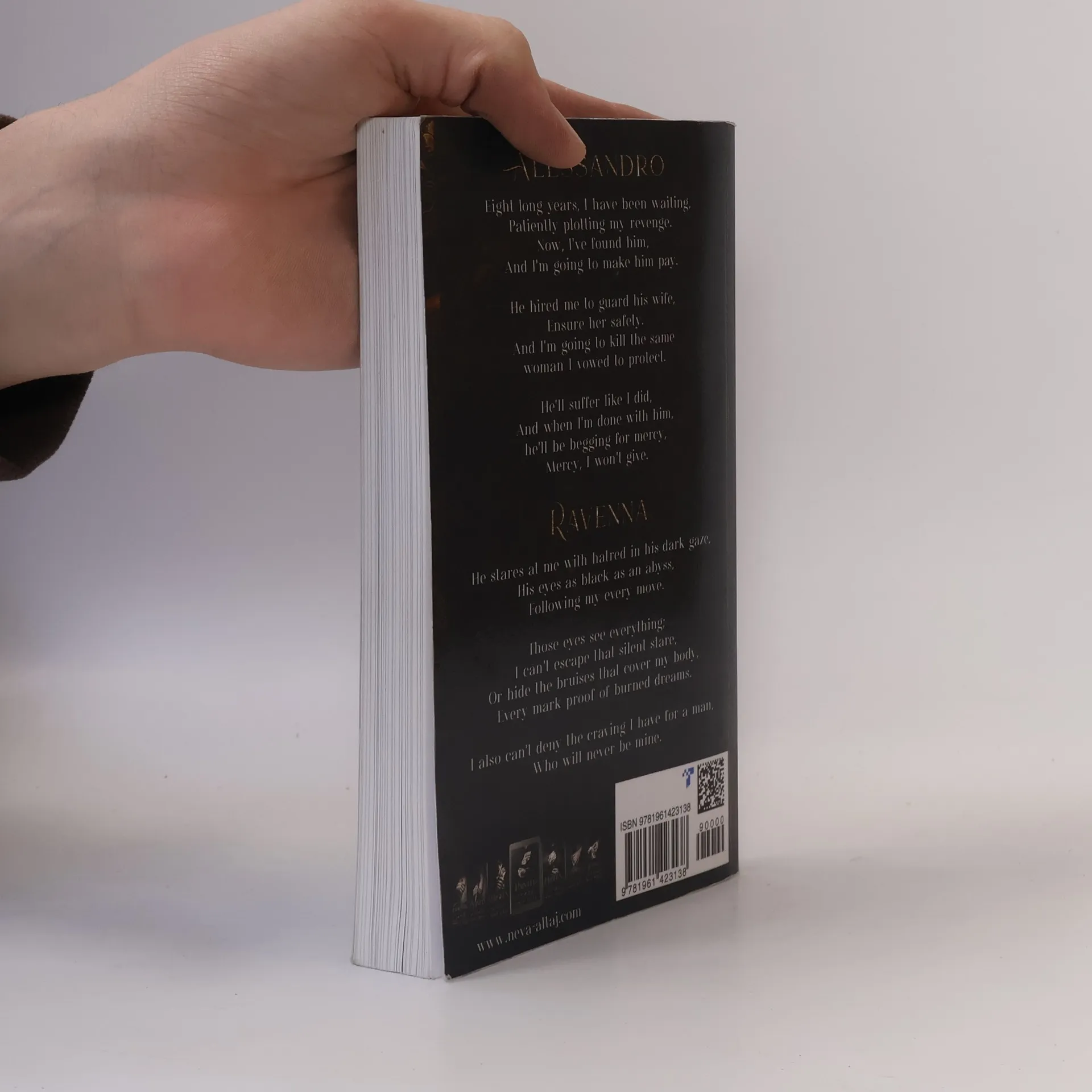 AlessandroEight long years, I have been waiting,Patiently plotting my revenge.Now, I've found him,And I'm going to make him pay.He hired me to guard his wife,Ensure her safety.And I'm going to kill the same woman I vowed to protect.He'll suffer like I did,And when I'm done with him, he'll be begging for mercy,Mercy, I won't give.RavennaHe stares at me with hatred in his dark gaze,His eyes as black as an abyss,Following my every move.Those eyes see everything;I can't escape that silent stare,Or hide the bruises that cover my body,Every mark proof of burned dreams.I also can't deny the craving I have for a man,Who will never be mine.