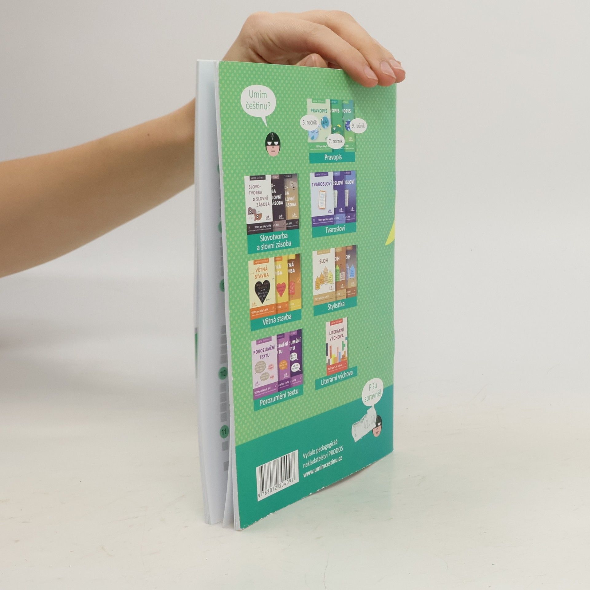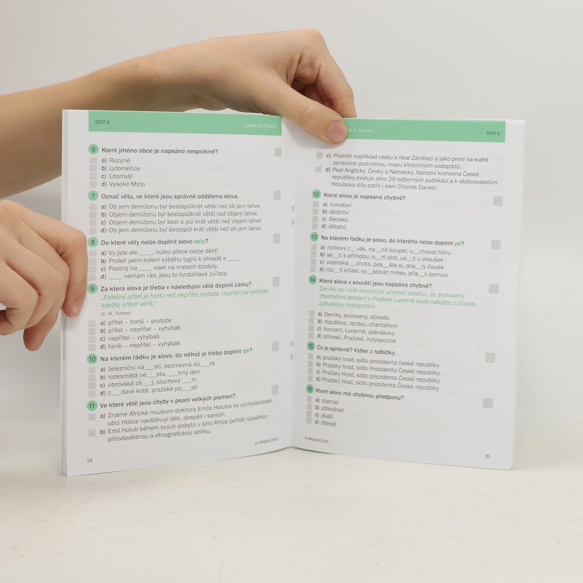 Potřebujete si procvičit češtinu? Přijímací zkoušky jsou možná daleko, ale čas se krátí. Připravte se na ně s testy Umím češtinu? – a začněte třeba pravopisem. Co najdete v Pravopisu pro 7. ročník? * 10 didaktických testů, každý s 20 různorodými úlohami z českého jazyka * otázky zaměřené na vyjmenovaná slova, shodu přísudku s podmětem, psaní velkých a malých písmen, předpon s- a z-, skupin mě/mně, na psaní interpunkce a na další oblasti gramatiky * 5 diktátů * přehledně zpracované výsledky * zábavnou křížovku na závěr Vyplňujte testy Umím češtinu? – Pravopis i online na počítači nebo v mobilním telefonu na umimcestinu.cz. I když nemáte po ruce sešit, můžete v přípravách na přijímačky pokračovat. Pusťte se do toho a (nepro) TESTUJTE!