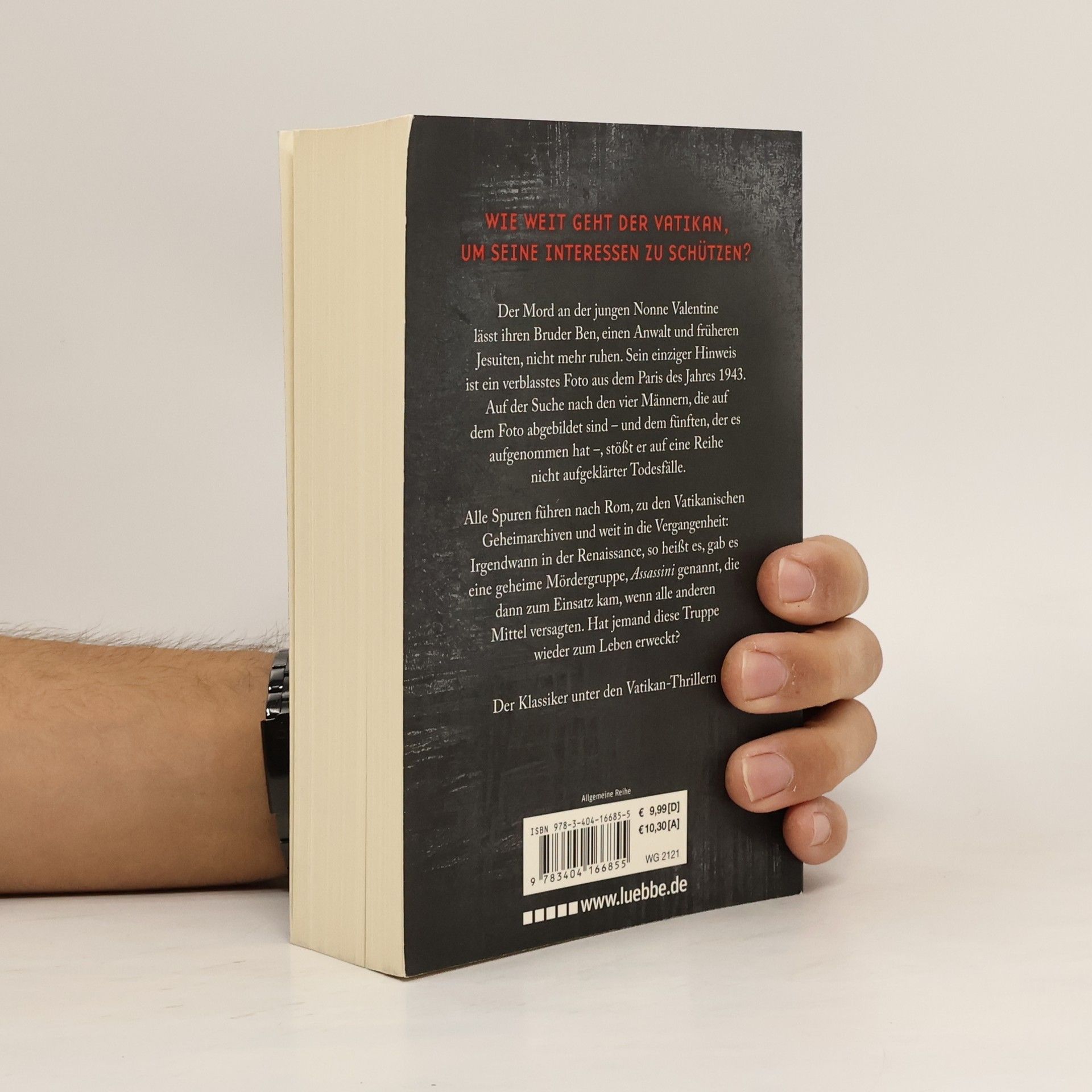 Der Mord an der jungen Nonne Valentine läßt ihren Bruder Ben, einen Anwalt und früheren Jesuiten, nicht mehr ruhen. Sein einziger Hinweis ist ein verblasstes Foto aus dem Paris des Jahres 1943. Auf der Suche nach den vier Männern, die auf dem Foto abgebildet sind - und dem fünften, der es aufgenommen hat -, stößt er auf eine Reihe unaufgeklärter Todesfälle. Alle Spuren führen nach Rom, zu den geheimen vatikanischen Archiven und weit in die Vergangenheit: Irgendwann in der Renaissance, so heißt es, gab es eine geheime Mördergruppe, Assassini genannt, die dann zum Einsatz kam, wenn alle anderen Mittel versagten. Hat jemand diese Truppe wieder zum Leben erweckt?