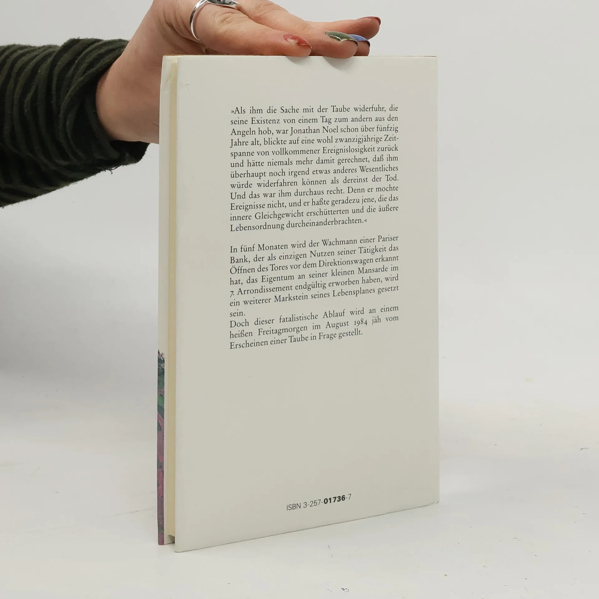 In fünf Monaten wird der Wachmann einer Pariser Bank, der als einzigen Nutzen seiner Tätigkeit das Öffnen des Tores vor dem Direktionswagen erkannt hat, das Eigentum an seiner kleinen Mansarde endgültig erworben haben, wird ein weiterer Markstein seines Lebensplanes gesetzt sein. Doch dieser fatalistische Ablauf wird an einem heißen Freitagmorgen im August 1984 jäh vom Erscheinen einer Taube in Frage gestellt.