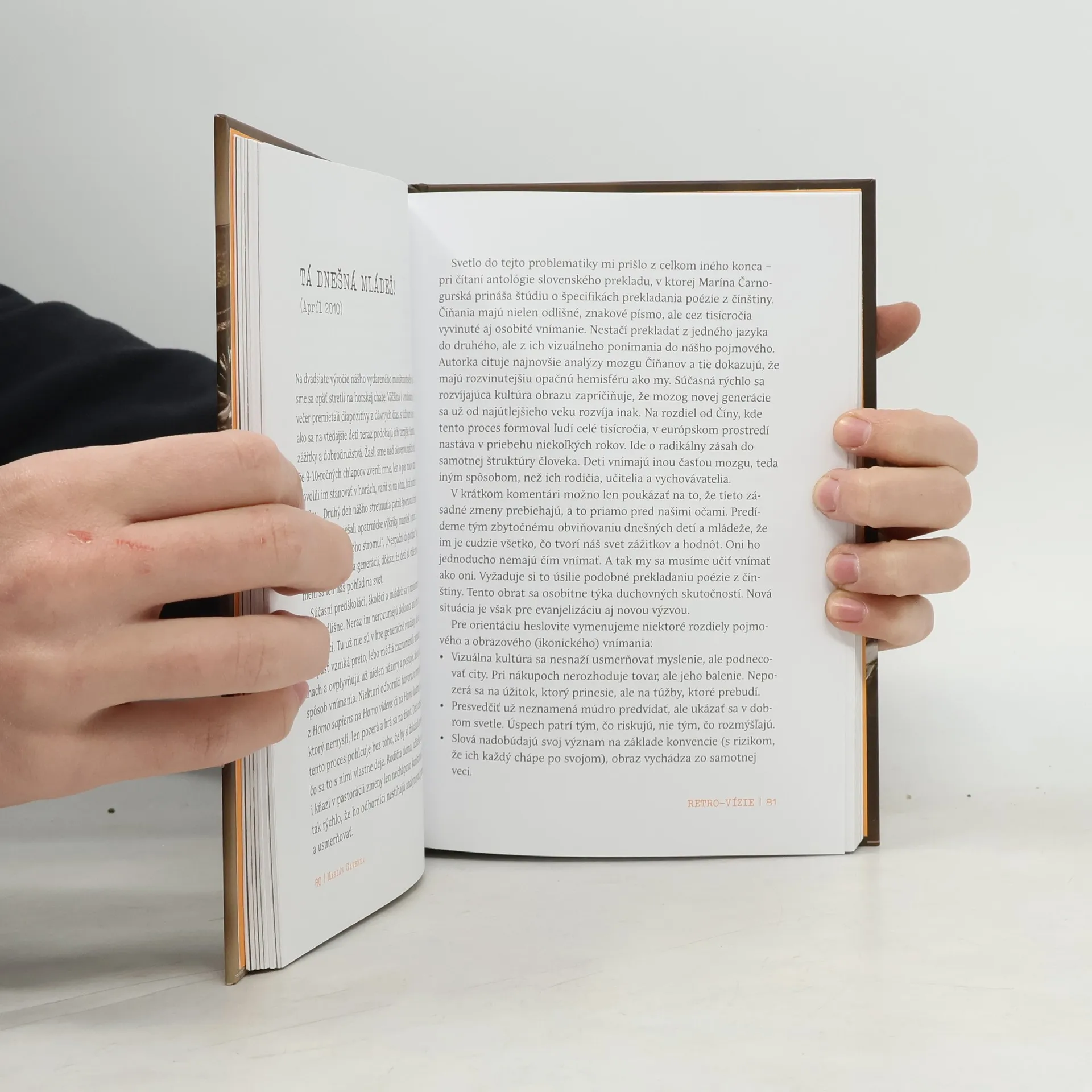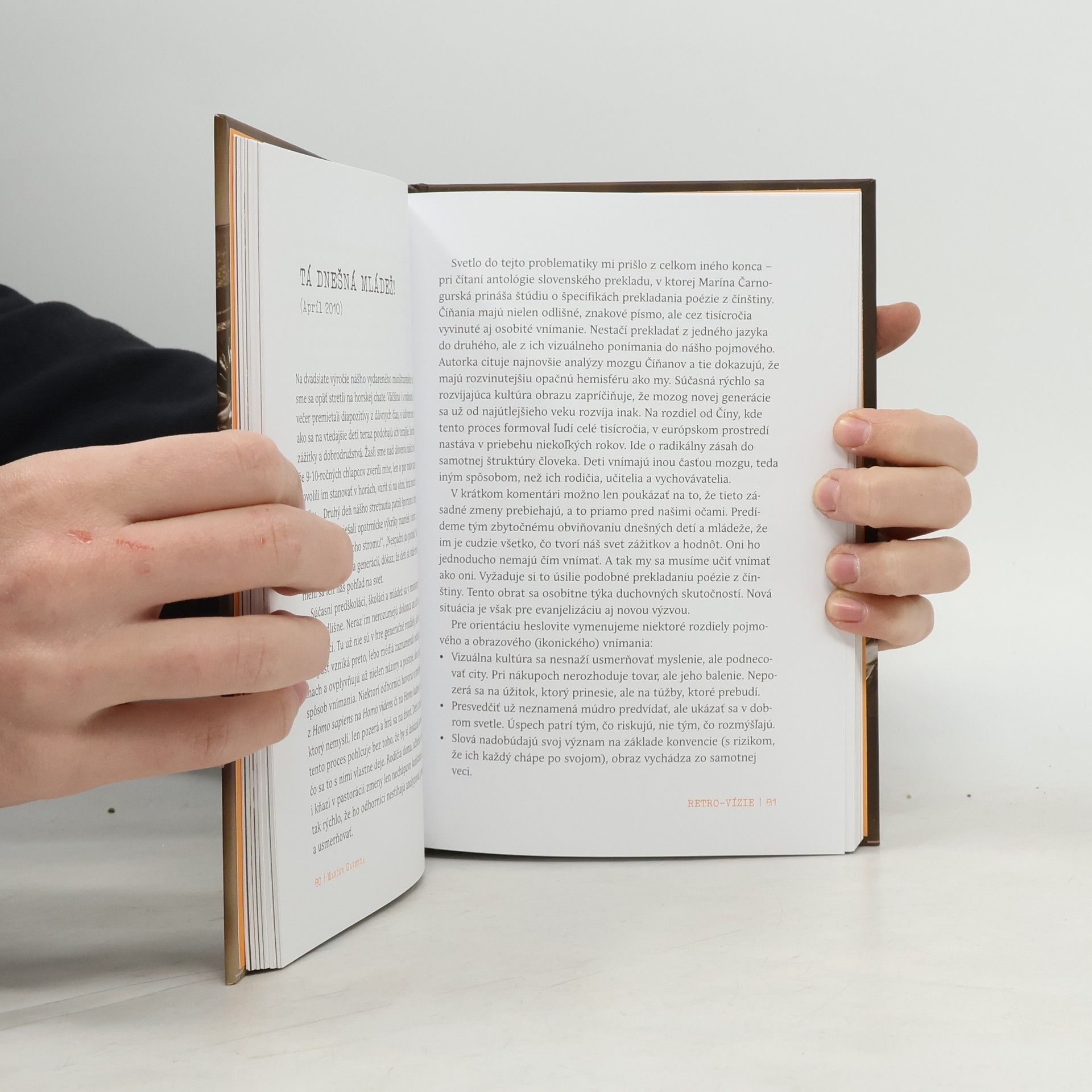 Retro-vízie tvoria komentáre, odzrkadľujúce niekdajšie aktuálne dianie, šíriace sa postoje a ich interpretácie v médiách. V rozpätí rokov 2006 až 2017 boli odvysielané na vlnách Vatikánskeho rozhlasu a primárne určené praktizujúcim veriacim. Odzneli v éteri a v ňom sa aj rozplynuli. Po zotretí nánosu času sa ukázalo, že myšlienky medzitým zreli. Vývoj potvrdil, že obsahujú čoraz naliehavejšie vízie budúcnosti, vyjadrené v nedávnej minulosti. Ich cieľom nie je analýza z ekonomického, politického či sociologického aspektu. Na veci sa pozerajú z perspektívy viery a ukazujú, aké riešenie ponúka duchovný prístup k životu. Snažia sa pomenovať príčiny a demaskovať skryté súvislosti. Preto námety nie sú vždy optimistické. No čitateľ čoskoro zbadá, že vyúsťujú do pozitívneho a konštruktívneho záveru.