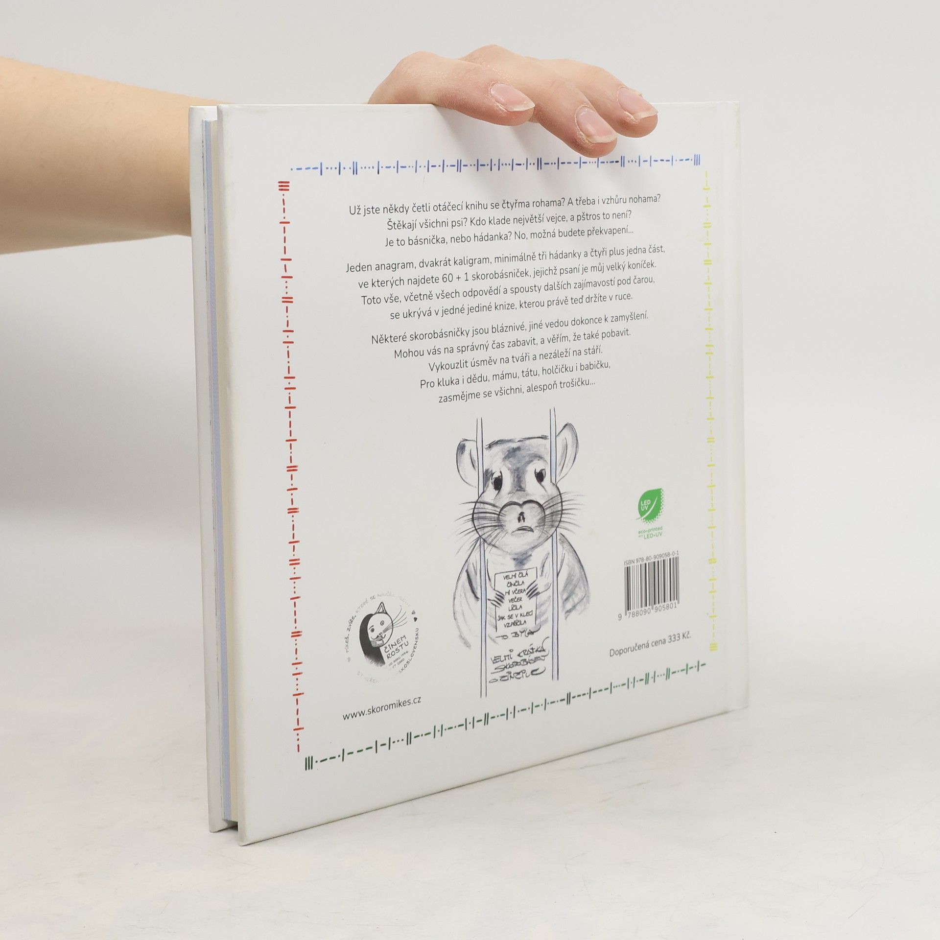 Už jste někdy četli otáčecí knihu se čtyřma rohama? A třeba i vzhůru nohama? Štěkají všichni psi? Kdo klade největší vejce, a pštros to není? Je to básnička nebo hádanka? No, možná budete překvapení… Jeden anagram, dvakrát kaligram, minimálně tři hádanky a čtyři plus jedna část, ve kterých najdete 60 + 1 skorobásniček, jejichž psaní je můj velký koníček. Toto vše, včetně všech odpovědí a spousty dalších zajímavostí pod čarou, se ukrývá v jedné jediné knize, kterou právě teď držíte v ruce. Některé skorobásničky jsou bláznivé, jiné vedou dokonce k zamyšlení. Mohou vás na správný čas zabavit, a věřím, že také pobavit. Vykouzlit úsměv na tváři a nezáleží na stáří. Pro kluka i dědu, mámu, tátu, holčičku i babičku, zasmějme se všichni, alespoň trošičku…