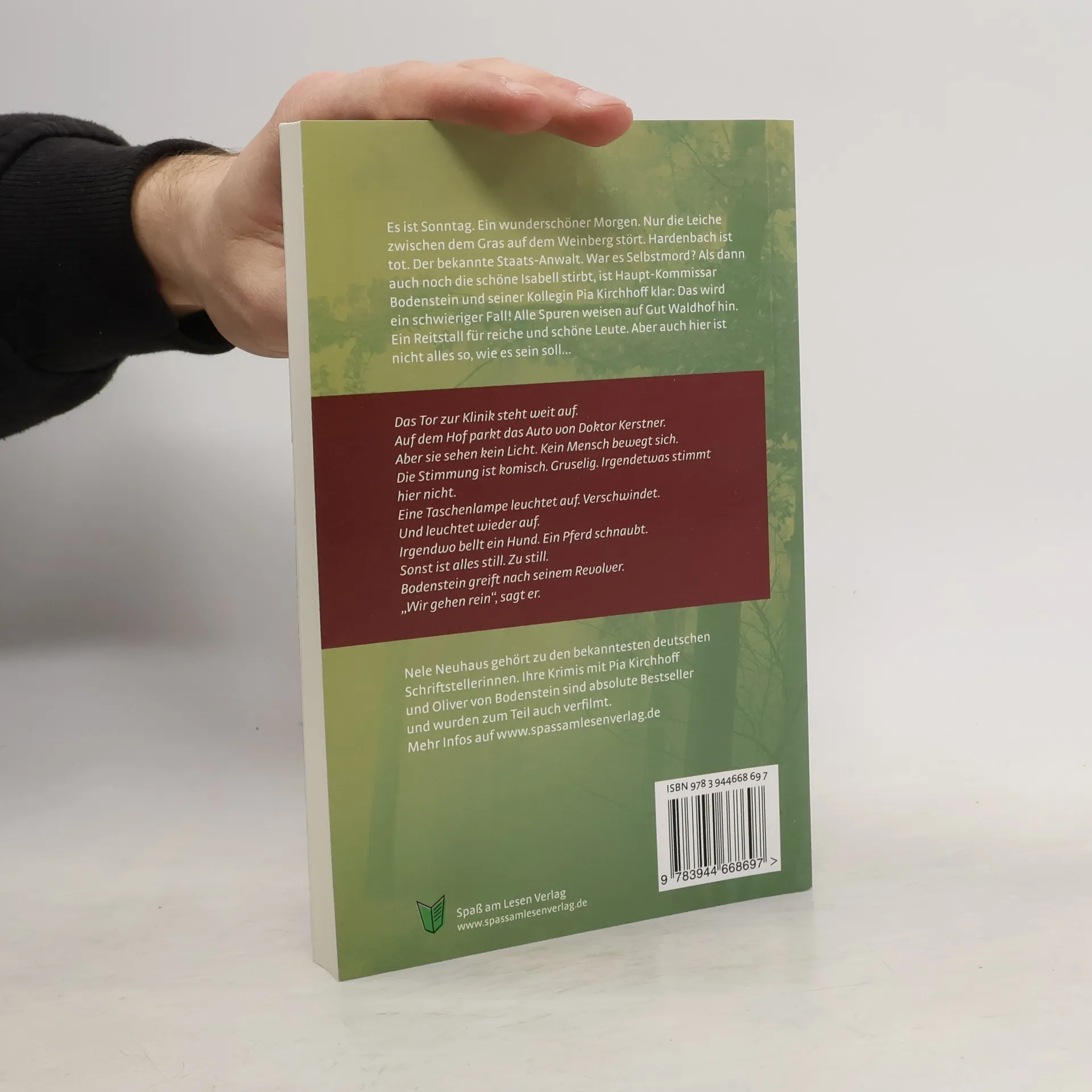 Es ist Sonntag. Ein wunderschöner Morgen. Nur die Leiche zwischen dem Gras auf dem Weinberg stört. Hardenbach ist tot. Der bekannte Staats-Anwalt. War es Selbstmord? Als dann auch noch die schöne Isabell stirbt, ist Haupt-Kommissar Bodenstein und seiner Kollegin Pia Kirchhoff klar: Das wird ein schwieriger Fall! Alle Spuren weisen auf Gut Waldhof hin. Ein Reitstall für reiche und schöne Leute. Aber auch hier ist nicht alles so, wie es sein soll… Das Tor zur Klinik steht weit auf. Auf dem Hof parkt das Auto von Doktor Kerstner. Aber sie sehen kein Licht. Kein Mensch bewegt sich. Die Stimmung ist komisch. Gruselig. Irgendetwas stimmt hier nicht. Eine Taschenlampe leuchtet auf. Verschwindet. Und leuchtet wieder auf. Irgendwo bellt ein Hund. Ein Pferd schnaubt. Sonst ist alles still. Zu still. Bodenstein greift nach seinem Revolver. „Wir gehen rein“, sagt er. Nele Neuhaus gehört zu den bekanntesten deutschen Schriftstellerinnen. Ihre Krimis mit Pia Kirchhoff und Oliver von Bodenstein sind absolute Bestseller und wurden zum Teil auch verfilmt.