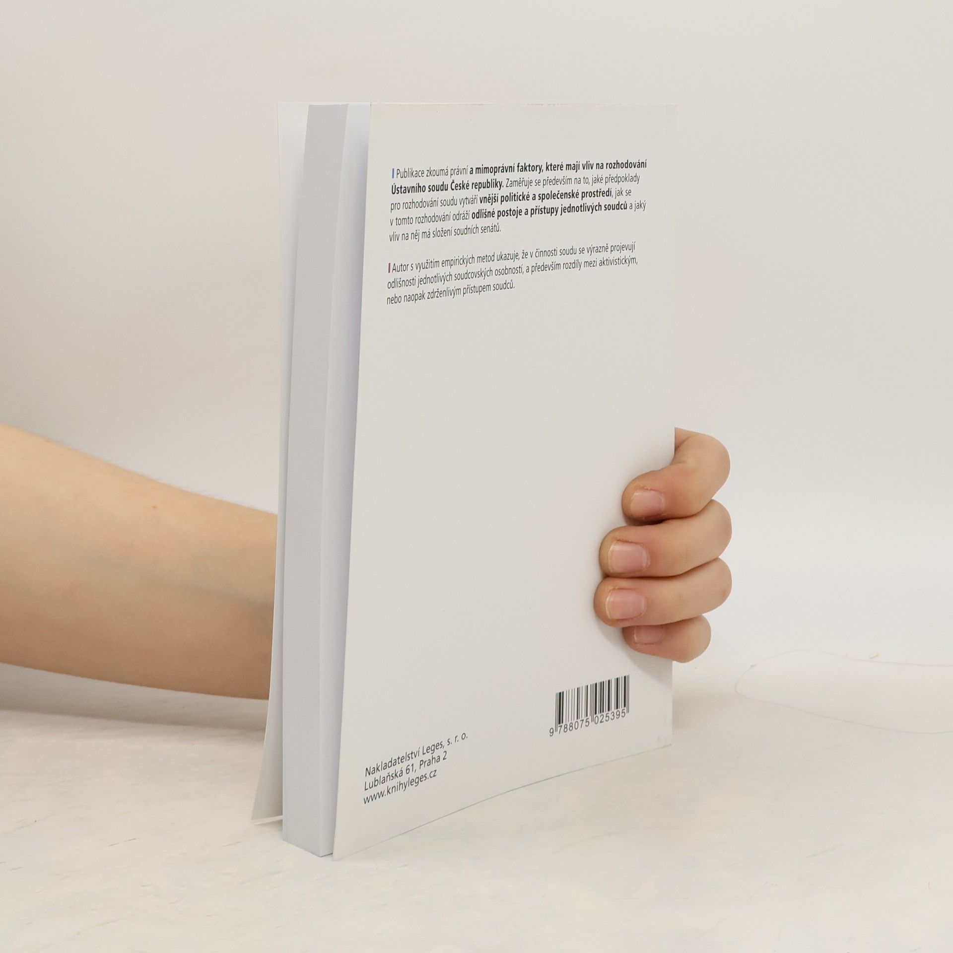Publikace zkoumá právní a mimoprávní faktory, které mají vliv na rozhodování Ústavního soudu České republiky. Zaměřuje se především na to, jaké předpoklady pro rozhodování soudu vytváří vnější politické a společenské prostředí, jak se v tomto rozhodování odráží odlišné postoje a přístupy jednotlivých soudců a jaký vliv na něj má složení soudních senátů. Autor s využitím empirických metod ukazuje, že v činnosti soudu se výrazně projevují odlišnosti jednotlivých soudcovských osobností, a především rozdíly mezi aktivistickým, nebo naopak zdrženlivým přístupem soudců.
