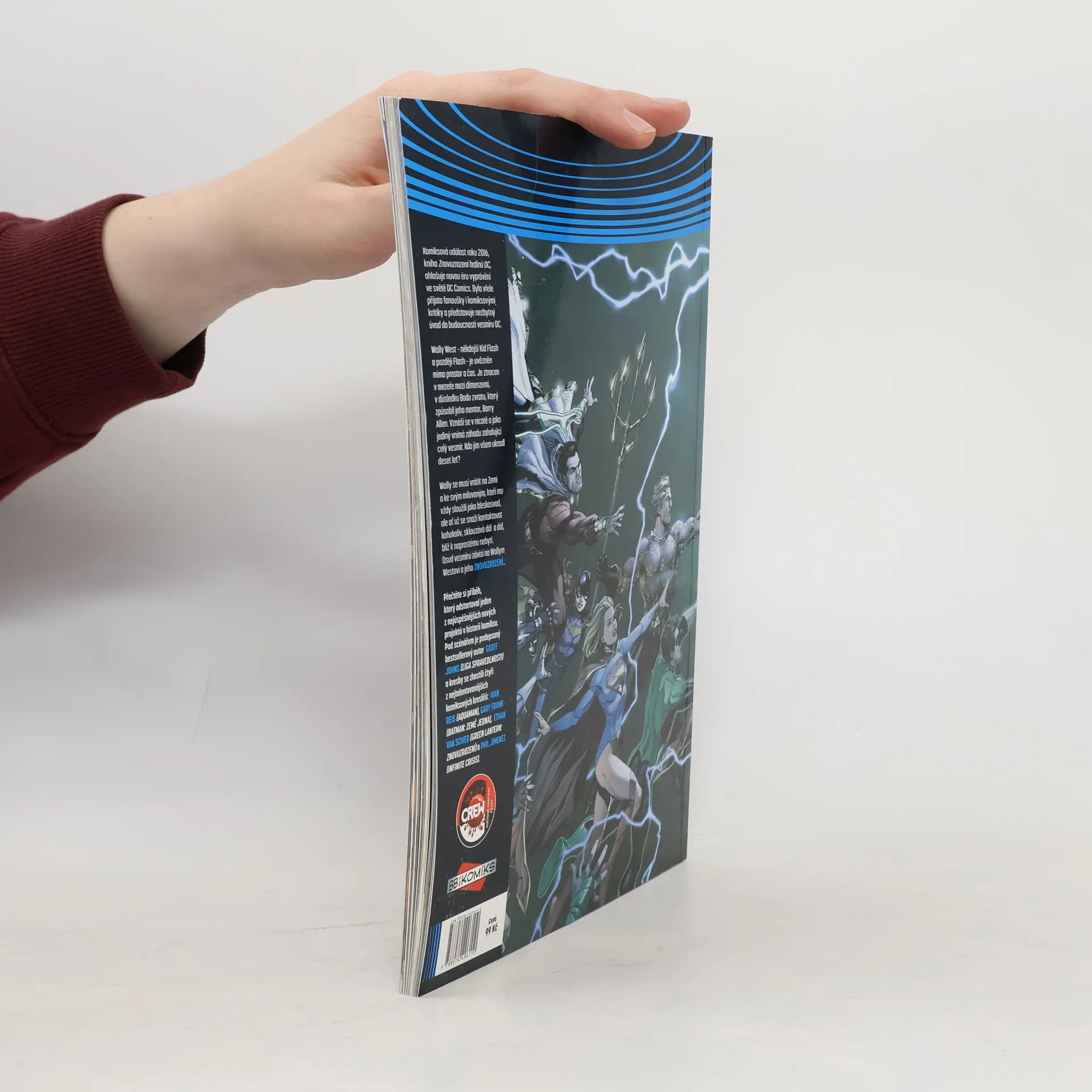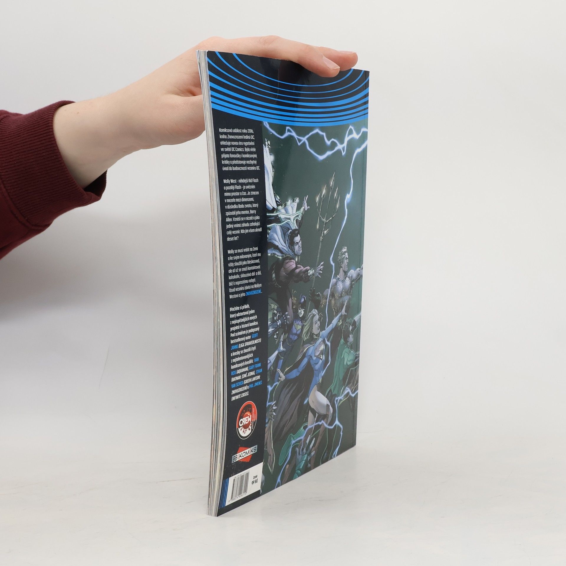 Komiksová událost roku 2016, kniha Znovuzrození hrdinů DC, ohlašuje novou éru vyprávění ve světě DC Comics. Byla vřele přijata fanoušky i komiksovými kritiky a představuje nezbytný úvod do budoucnosti vesmíru DC. Wally West – někdejší Kid Flash a později Flash – je uvězněn mimo prostor a čas. Je ztracen v mezeře mezi dimenzemi, v důsledku Bodu zvratu, který způsobil jeho mentor, Barry Allen. Vznáší se v nicotě a jako jediný vnímá záhadu zasahující celý vesmír. Kdo jim všem ukradl deset let? Wally se musí vrátit na Zemi a ke svým milovaným, kteří mu vždy sloužili jako bleskosvod, ale ať už se snaží kontaktovat kohokoliv, sklouzává dál a dál, blíž k naprostému nebytí. Osud vesmíru závisí na Wallym Westovi a jeho Znovuzrození... Přečtěte si příběh, který odstartoval jeden z nejúspěšnějších nových projektů v historii komiksu. Pod scénářem je podepsaný bestsellerový autor Geoff Johns (Liga spravedlnosti) a kresby se zhostili čtyři z nejtalentovanějších komiksových kreslířů: Ivan Reis (Aquaman), Gary Frank (Batman: Země jedna), Ethan Van Sciver (Green Lantern: Znovuzrození) a Phil Jimenez (Infinite Crisis).
